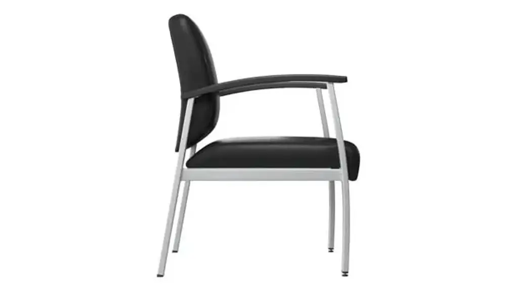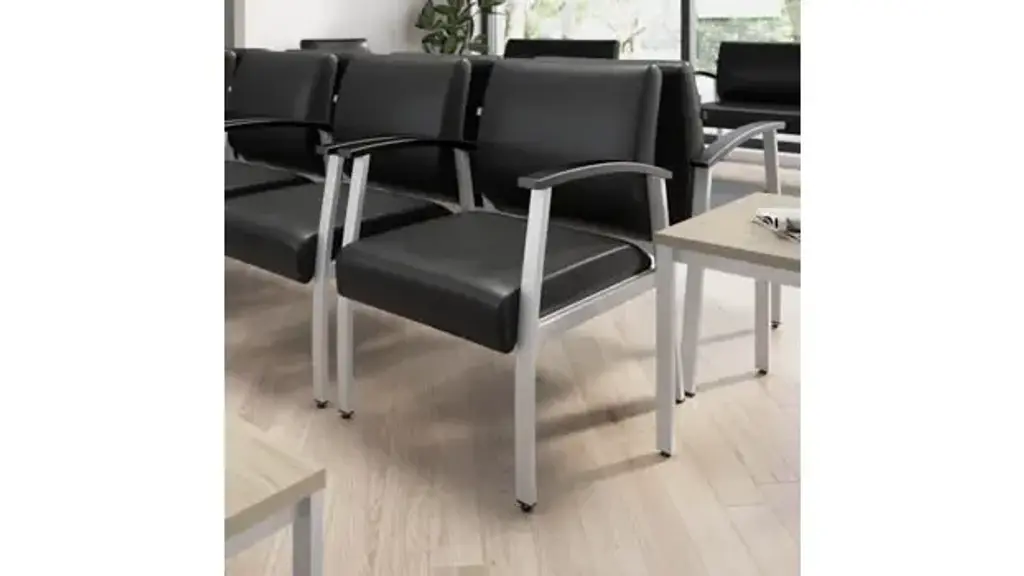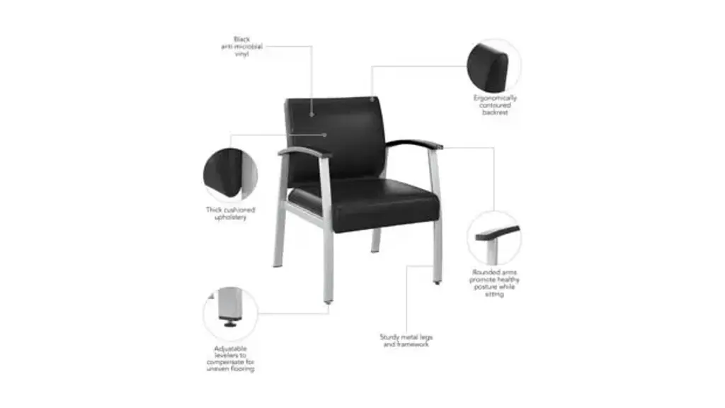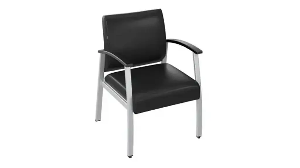 The Bush Business Furniture Arrive Guest Chair with Arms is perfect for treating your visitors to a reception area that's stylish, practical, and comfortable. Highlighted by its commercial quality build and thick cushioned upholstery, this durable waiting room chair is right at home in a commercial workplace, doctor's office, hospital, school, salon, or any other high-use common area. An ergonomically contoured backrest and rounded arms are designed to reduce stress and discomfort by promoting good posture. Sturdy metal legs and framework allow the reception chair to support up to 275 lbs, and levelers are included to compensate for uneven flooring. The padded seat features antimicrobial vinyl upholstery that inhibits the spread of bacteria, is quick and easy to clean, and resists cuts and tears while conveying a modern professional appearance. This office guest chair has been meticulously tested to meet or exceed ANSI/BIFMA quality standards for safety, durability, and performance. Complete your organization's waiting room furniture set with the Arrive Bariatric Guest Chair, Loveseat, Reception Desk and more (coordinating items sold separately). Overall Dimensions: 24.61" W x 26.54" D x 34.06" H. Seat measures 20.7" W x 19.3" D. Ships ready for easy assembly.
