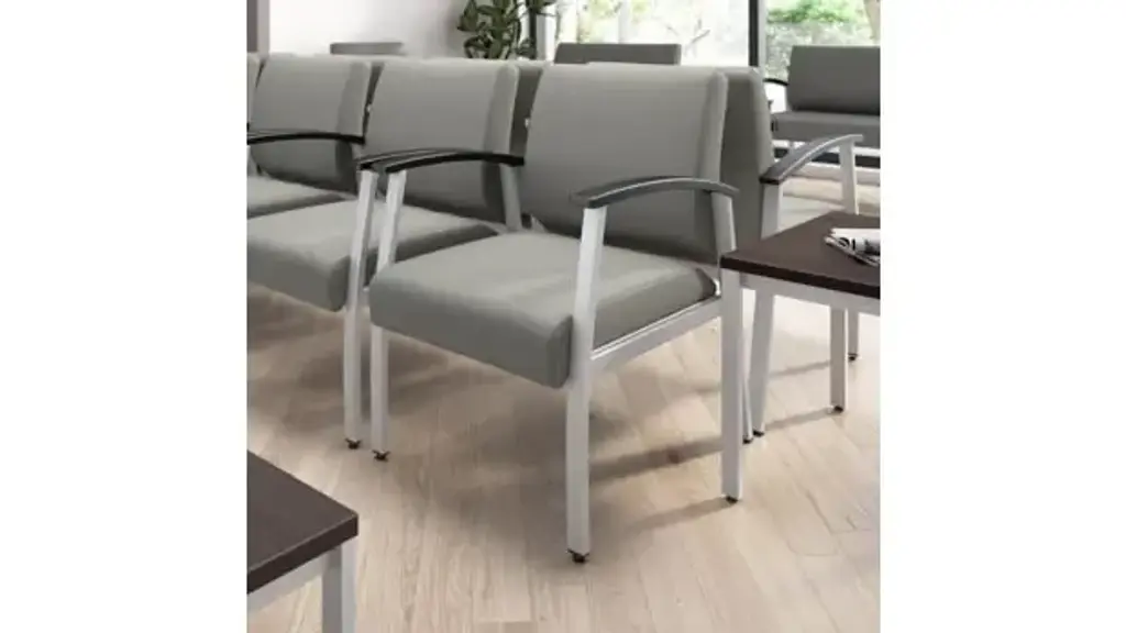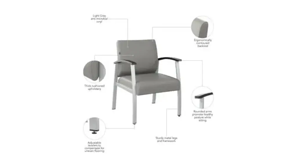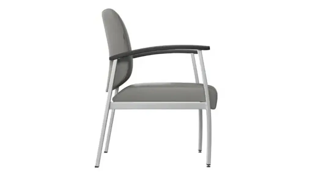 The Bush Business Furniture Arrive Guest Chair with Arms is perfect for treating your visitors to a reception area that's stylish, practical, and comfortable. Highlighted by its commercial quality build and thick cushioned upholstery, this durable waiting room chair is right at home in a commercial workplace, doctor's office, hospital, school, salon, or any other high-use common area. An ergonomically contoured backrest and rounded arms are designed to reduce stress and discomfort by promoting good posture. Sturdy metal legs and framework allow the reception chair to support up to 275 lbs, and levelers are included to compensate for uneven flooring. The padded seat features antimicrobial vinyl upholstery that inhibits the spread of bacteria, is quick and easy to clean, and resists cuts and tears while conveying a modern professional appearance. This office guest chair has been meticulously tested to meet or exceed ANSI/BIFMA quality standards for safety, durability, and performance. Complete your organization's waiting room furniture set with the Arrive Bariatric Guest Chair, Loveseat, Reception Desk and more (coordinating items sold separately). Overall Dimensions: 24.61" W x 26.54" D x 34.06" H. Seat measures 20.7" W x 19.3" D. Ships ready for easy assembly.