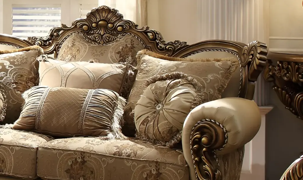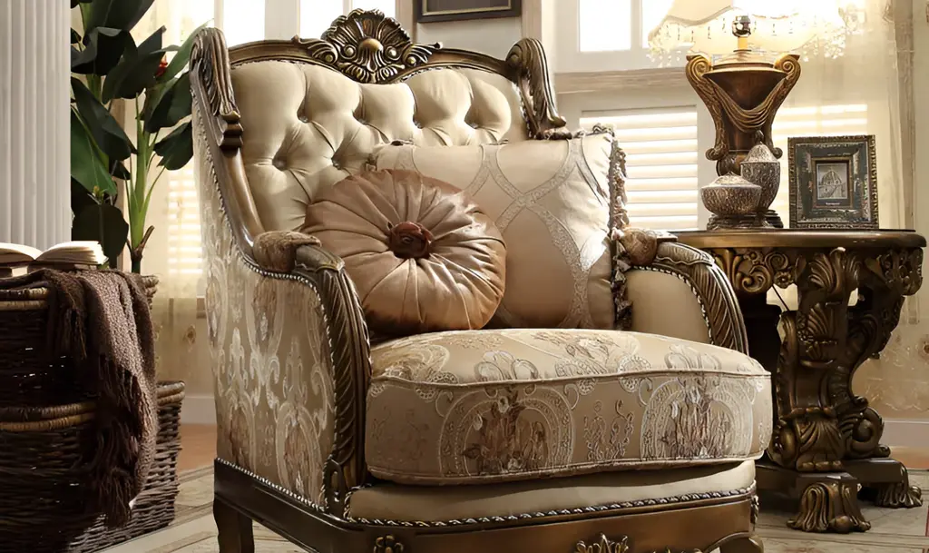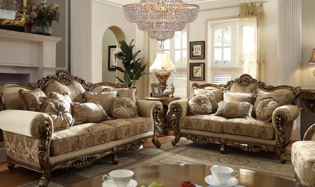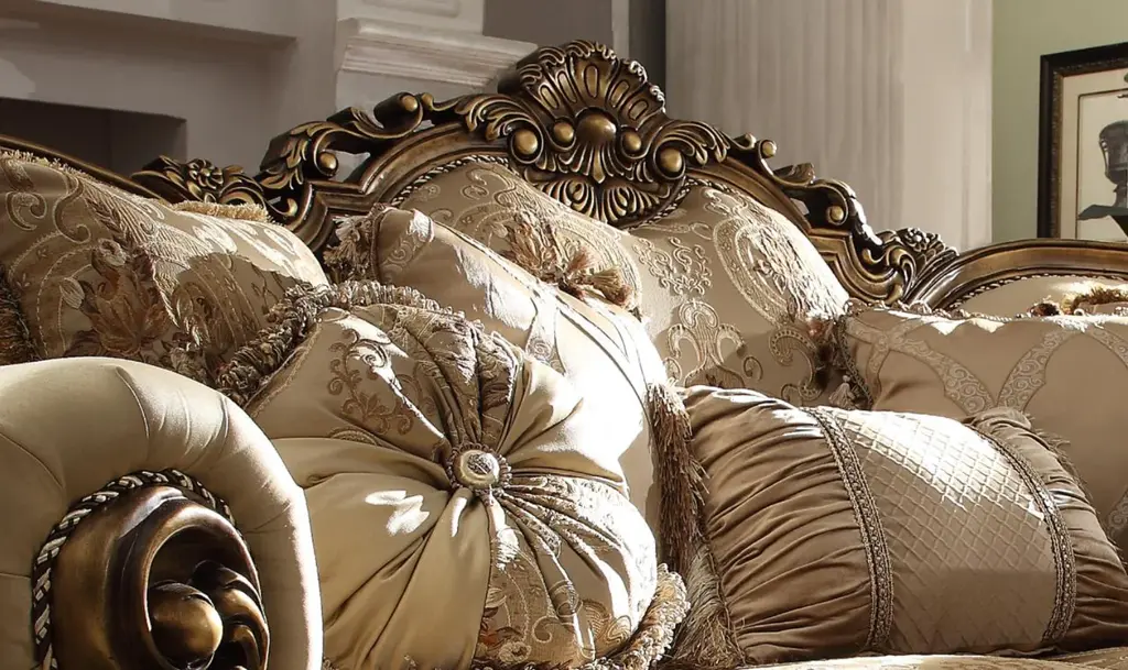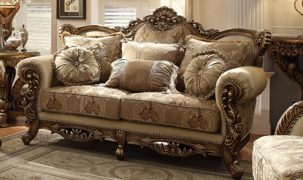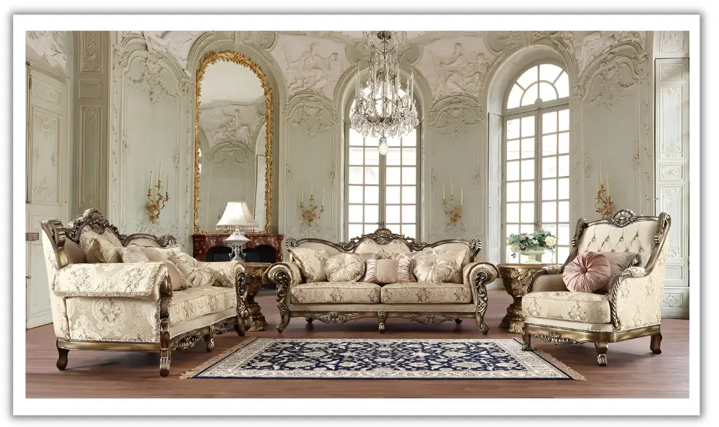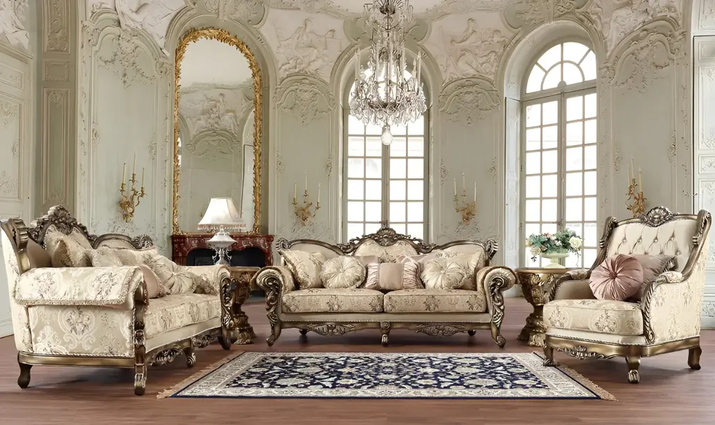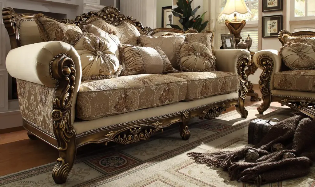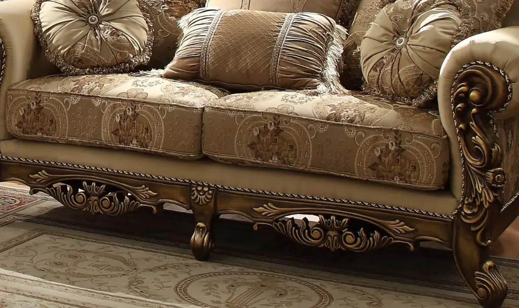 Details : Introduces the brilliance of time-honored style merged with Classic European. The refined elegance of old world France is captured in this Living room set. This elegant Sofa Set is sure to be a dazzling focal point in your traditional living room. Luxurious patterned accent pillows create a distinctive look, while the deep, plush seat cushion supports you in glamorous comfort and style. Seat cushions and back are upholstered in a rich chenille fabric and accented with intricately hand carved solid wood which continues along the front and up around the back for an exquisite style that is sure to impress. Scrolling hand carved detail along the arms and base accent the grandiose traditional design of the Sofa Set. Add these regal pieces to your living room to create a warm and stylish space that everyone will admire. This Collection brings Yesterday's Tradition into Today's Lifestyle. With its tasteful art and fascinating design, the HD-506 is certainly awarded one of Homey's best sellers. This set is infused in these delightful Earthly Complexions, and Chenille Fabrics with hues of Smokey Topaz, Restrained Gold and Townhall Tan. Features: Traditional Style Hand carved wood frame High Quality fabrics Removable Backs for ease of delivery 100% Kiln Dried, Solid wood frame Rolled Arms with wood accents Hand Carved Wood Trim Detailed carving on the arms and base Luxurious reversible pillows with accented fabric patterns Durable Chenille Fabric TOP QUALITY Hardware Durable Construction that helps ensure that this product will last for years to come The product Response for Higher Comfort and Durability Elegant Shapes with Accentuated Features The item needs to be assembled. Dimensions: Sofa: 90" x 47" x 39"H Loveseat: 75" x 47" x 39"H Chair: 31" x 47" x 33"H