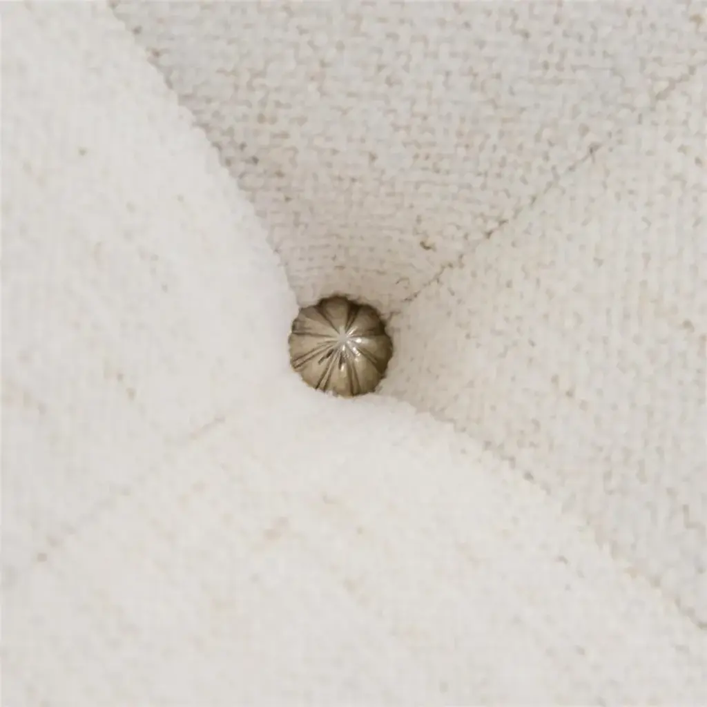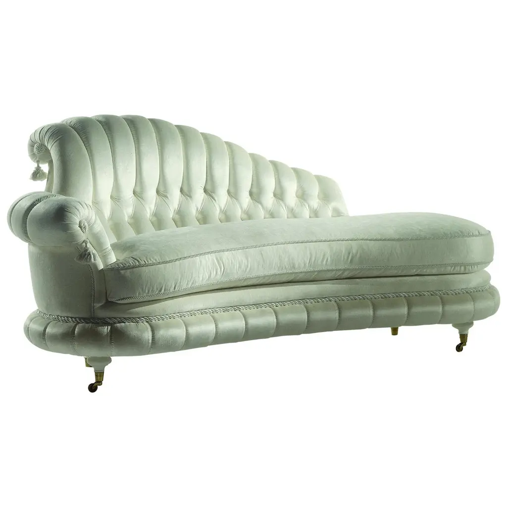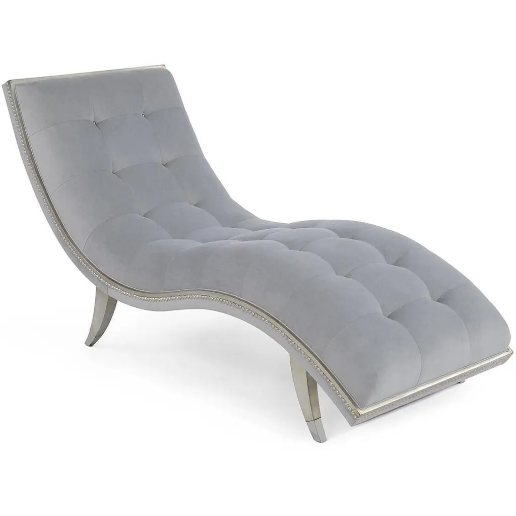 Hudson Chaise shown in 1109 fabric with nickel starburst nail heads. This modern chair combines architectural elements with classic comfort. The inside back and seat are channeled in a luxurious bouclé in pale green. The dramatic legs in Valyrian Gold are accentuated with polished Nickel ferrules. The Luna Chair is part of the JR Signature Upholstery Chair Program. It is available in four wood finishes and eight fabric selections that are coordinated to the JR Signature Upholstery Sofa Program.
