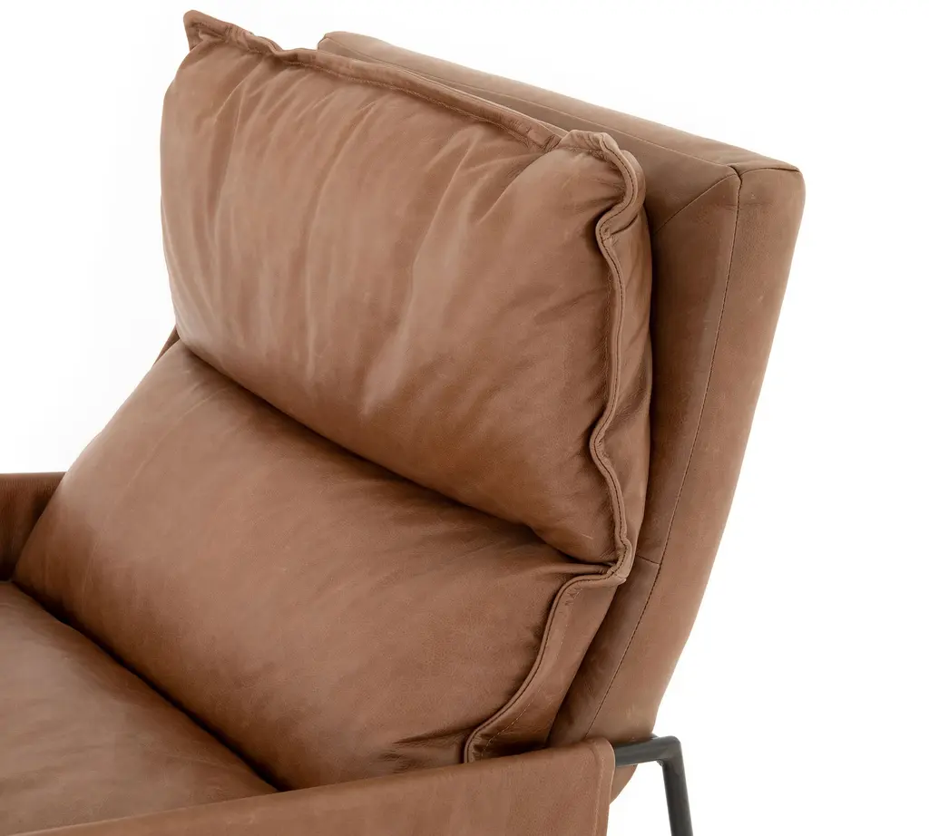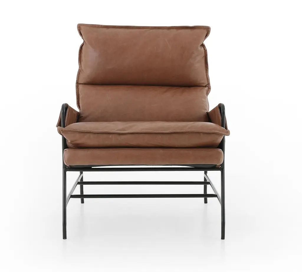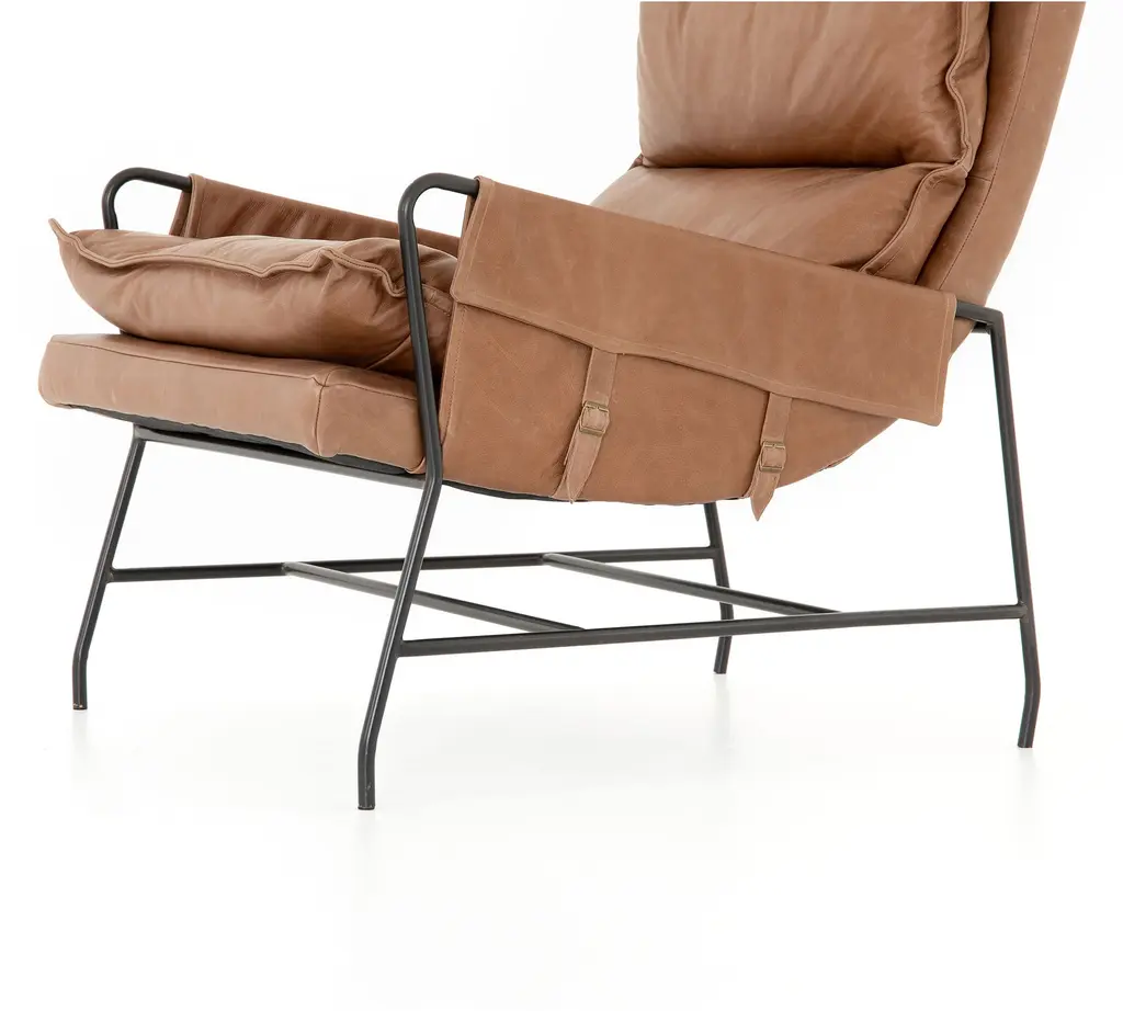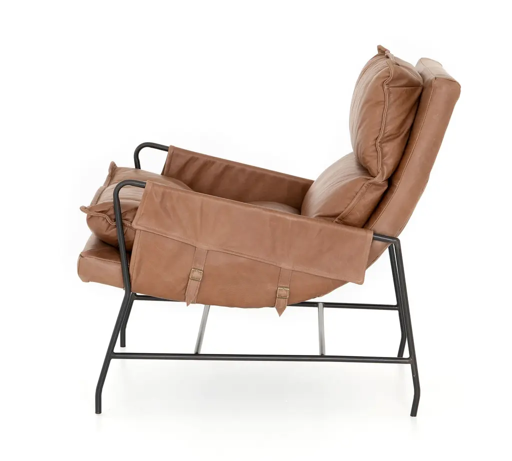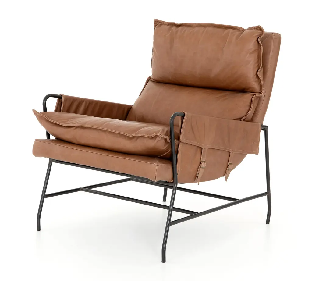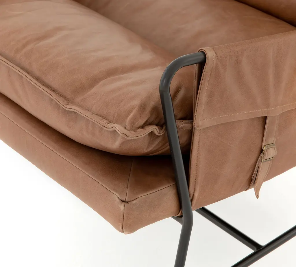 Designed for luxury, made for comfort – this will be the most coveted seat in the house. An iron frame is wrapped in buttery soft leather and detailed with saddle-inspired buckles, and attached leather cushions add sink-in softness.