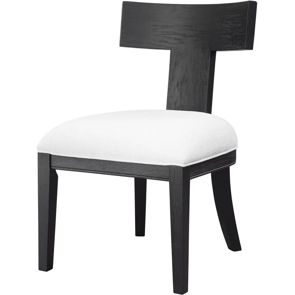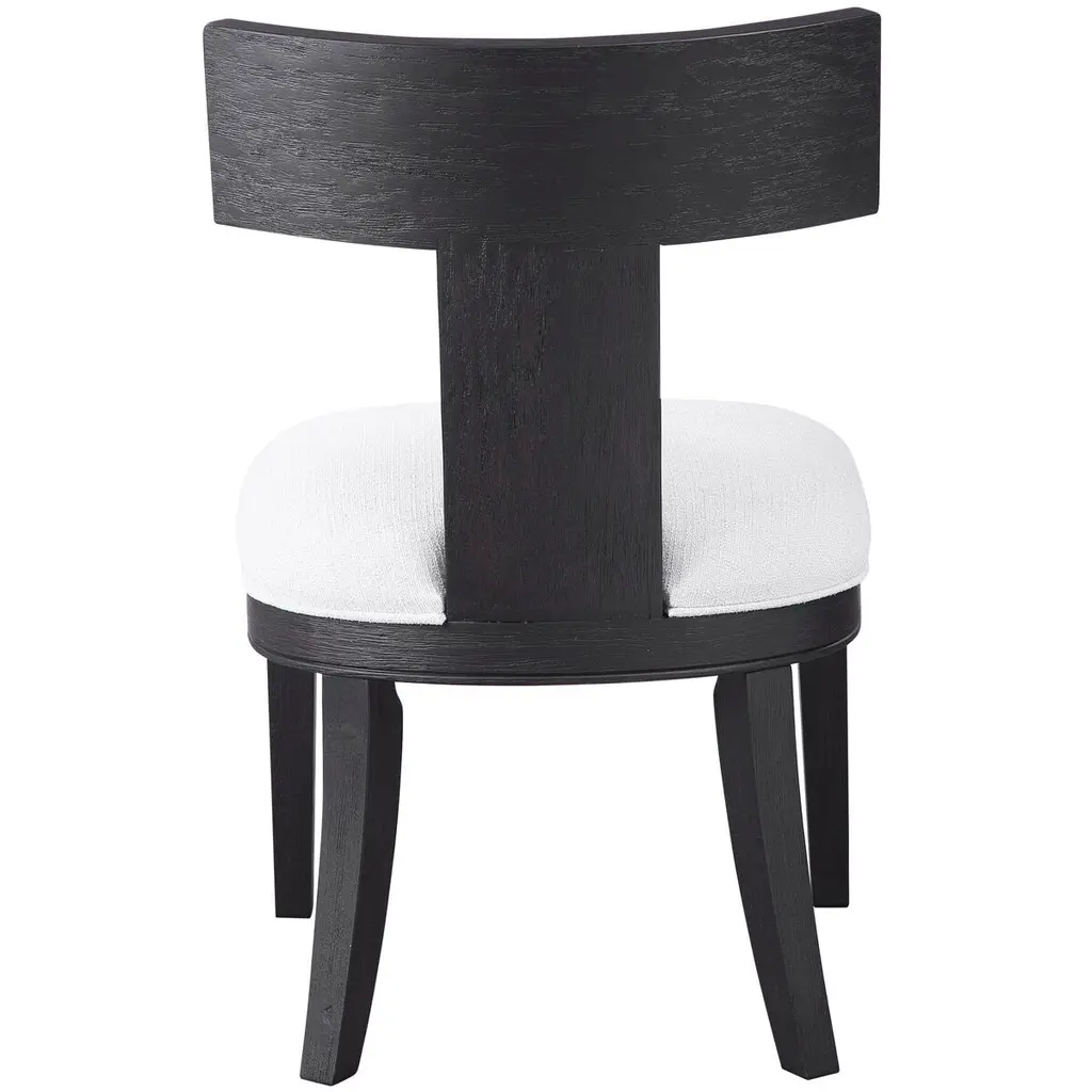 This Modern Take On A Klismos Chair Features A Curved Birch Wood Frame That Has Been Wire Brushed And Rubbed In A Charcoal Black Stain/Paired With A White Slubbed Performance Fabric Cushion. Seat Height Is 18".