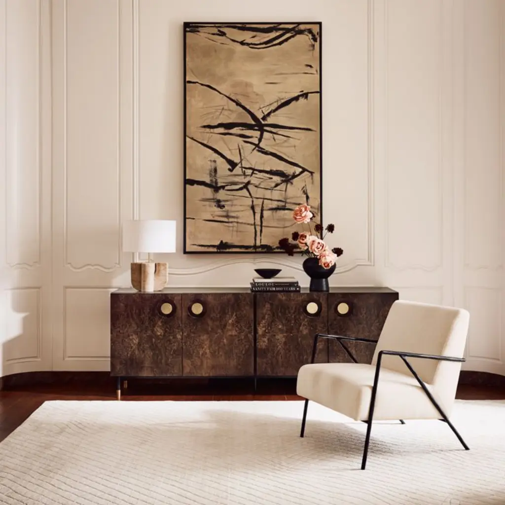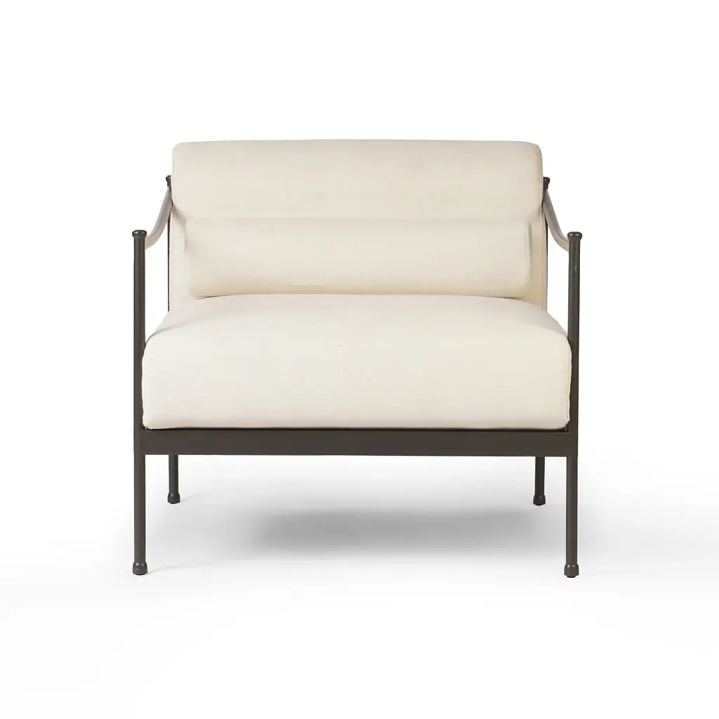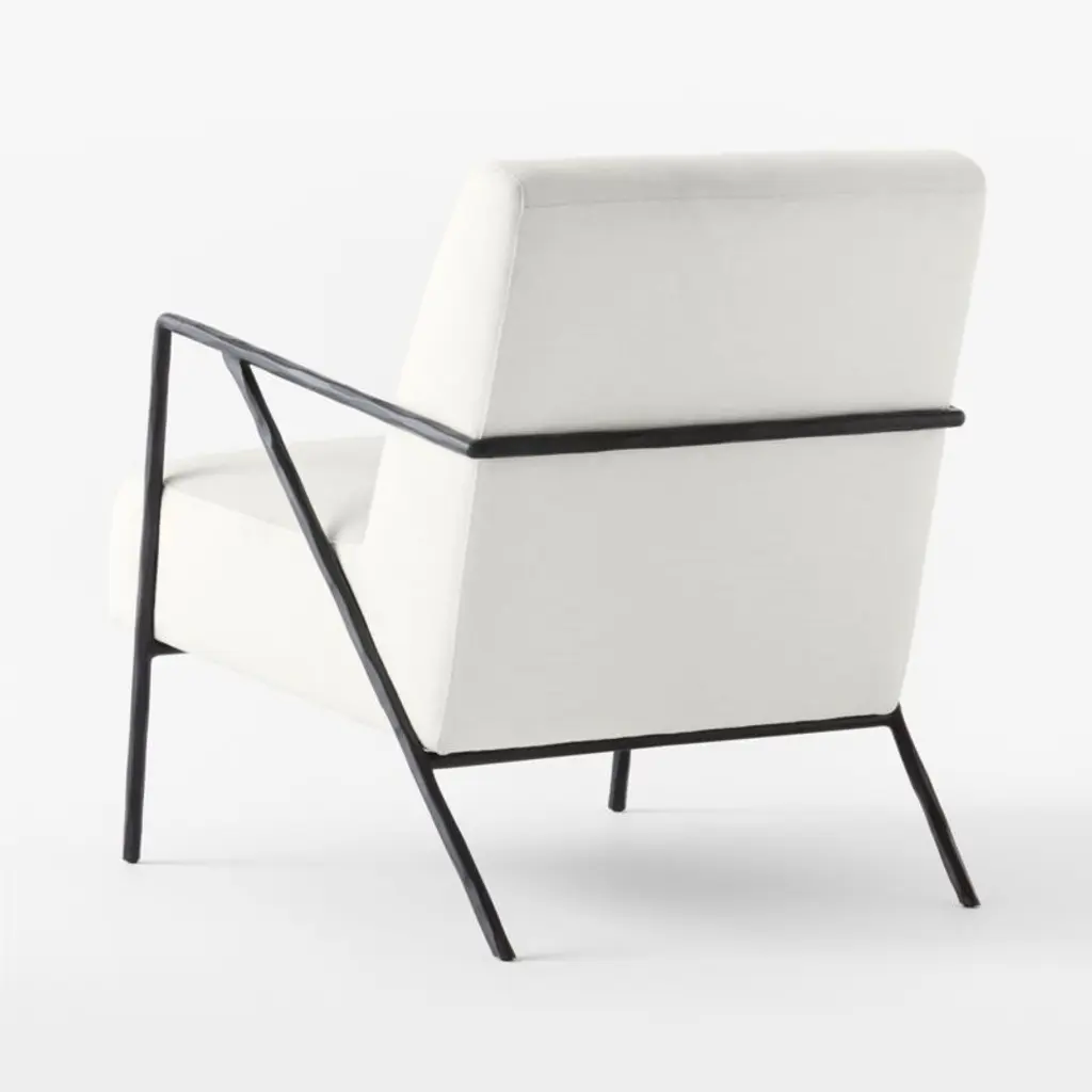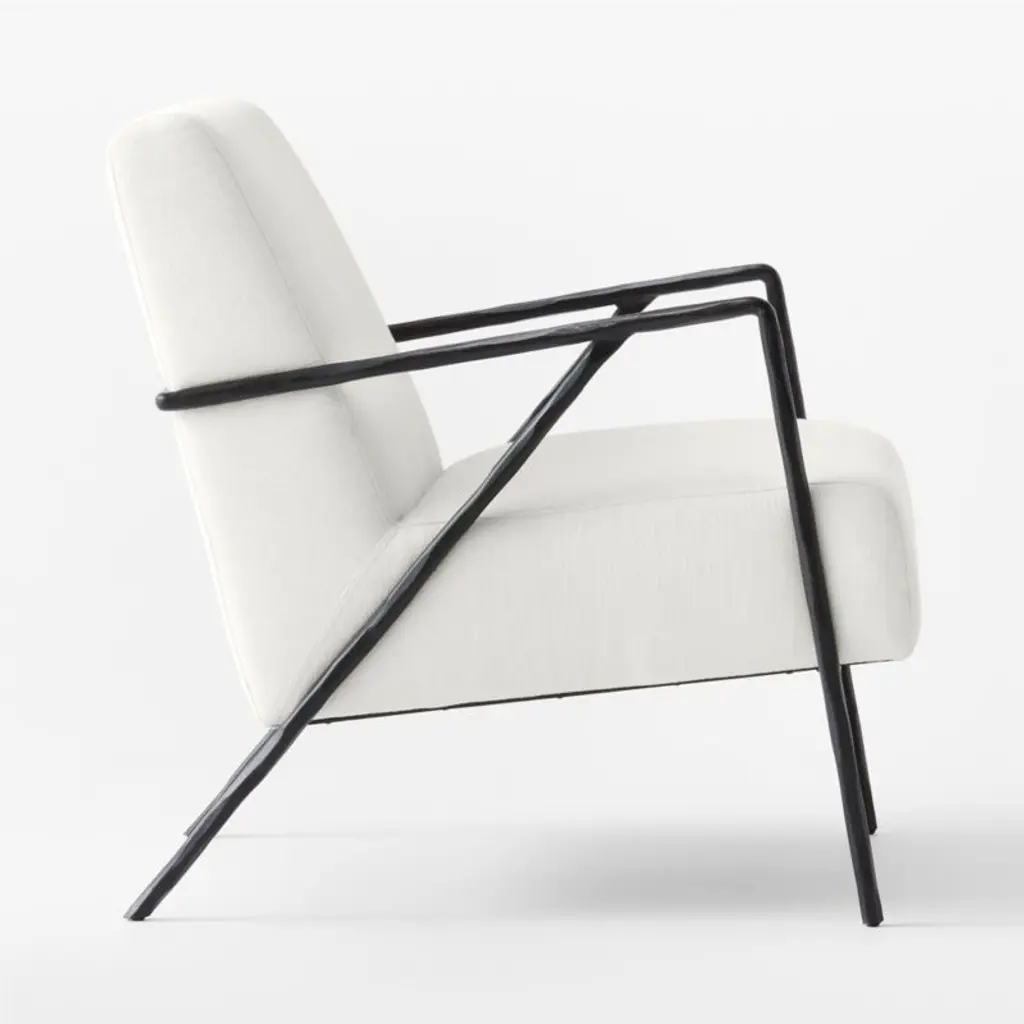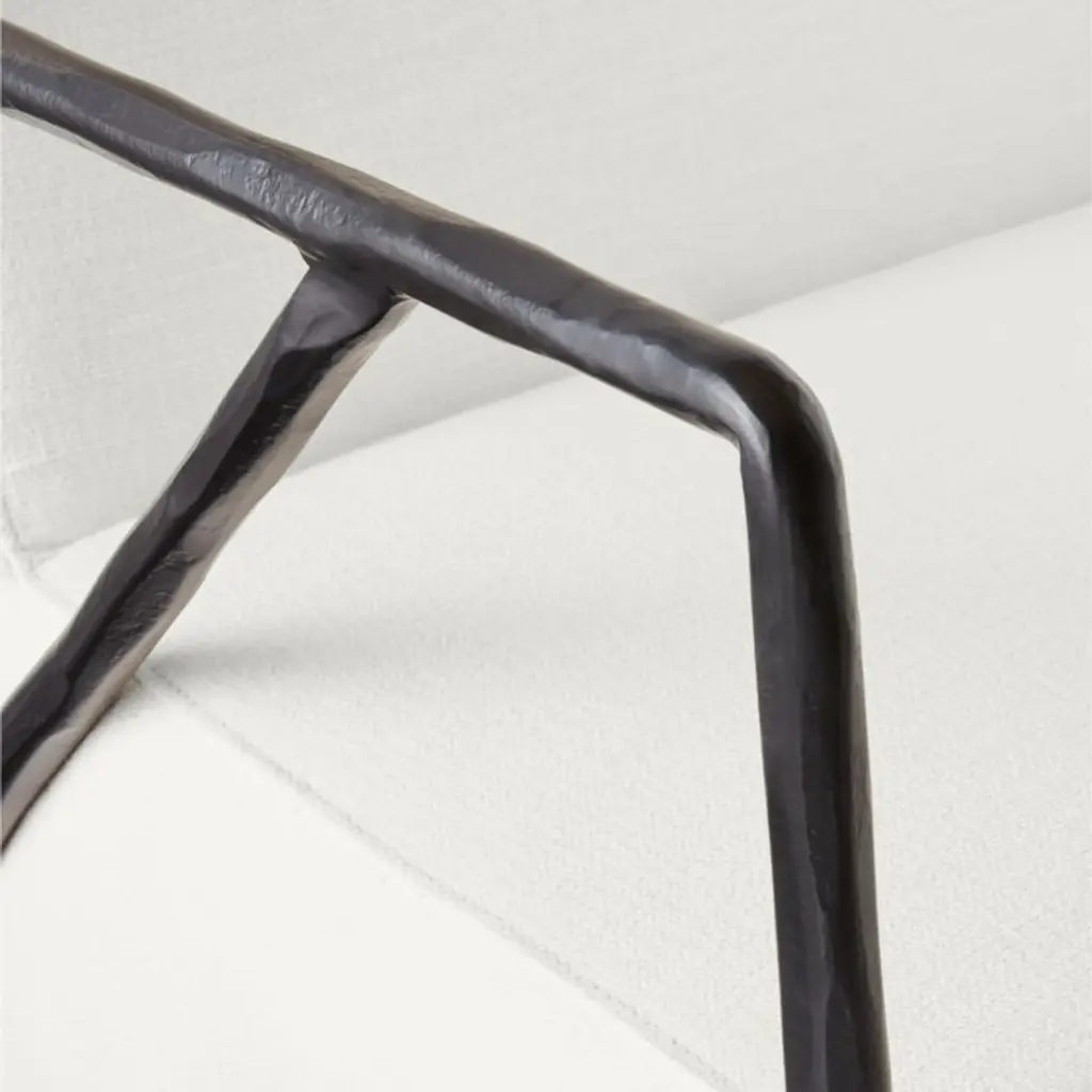 From German designer Jannis Ellenberger comes a lounge chair that blends modern, traditional and playful details. Black hammered steel arms and legs support cushions upholstered in white textured basketweave performance fabric. CB2 exclusive.