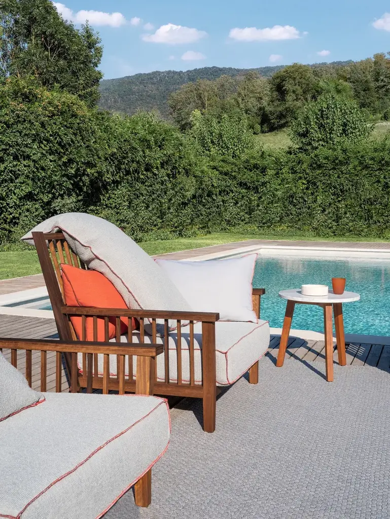 Enveloping and comfortable armchair, Inout 701 has a slatted structure: it is made of oiled Iroko, particularly durable wood because it is naturally resistant to water and moisture. The contrast between the solidity of the wide slats and the softness of the removable loose cushions in water-repellent polyurethane foam, give character to this piece of furniture.Inout is a broad and varied collection of chairs, stools, armchairs, sofas, tables, occasional tables, and accessories portraying the countless ways Gervasoni imagines spending time outdoors. Exotic suggestions are alternated with elements of sophisticated essentiality. Traditional outdoor materials such as wood, worked to enhance its natural properties, are paired with latest generation ones specifically designed to withstand weathering, but no less seductive and poetic. Even the weaving tradition is re-interpreted to resist against water and sunlight, maintaining its technical characteristics and colours unaltered over time.The Gervasoni Outdoor collection is the result of a careful selection of natural and technical materials worked with skillful craftsmanship and innovative technologies. The company’s products adapt to different styles of outdoor living, furnishing – with absolute ease, elegance and free customisation – terraces, gardens or swimming pools, from the most urban and contemporary to the most sophisticated or surrounded by nature. Each place has its own unique character that must be respected and enhanced. The key features of the range are, as always, attention to detail, excellent workmanship and in-depth research into materials.