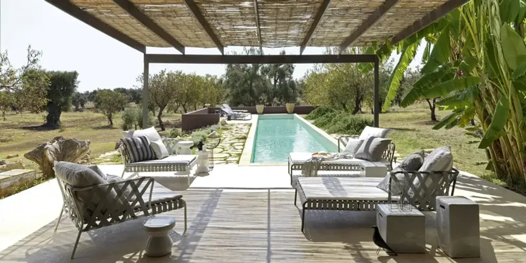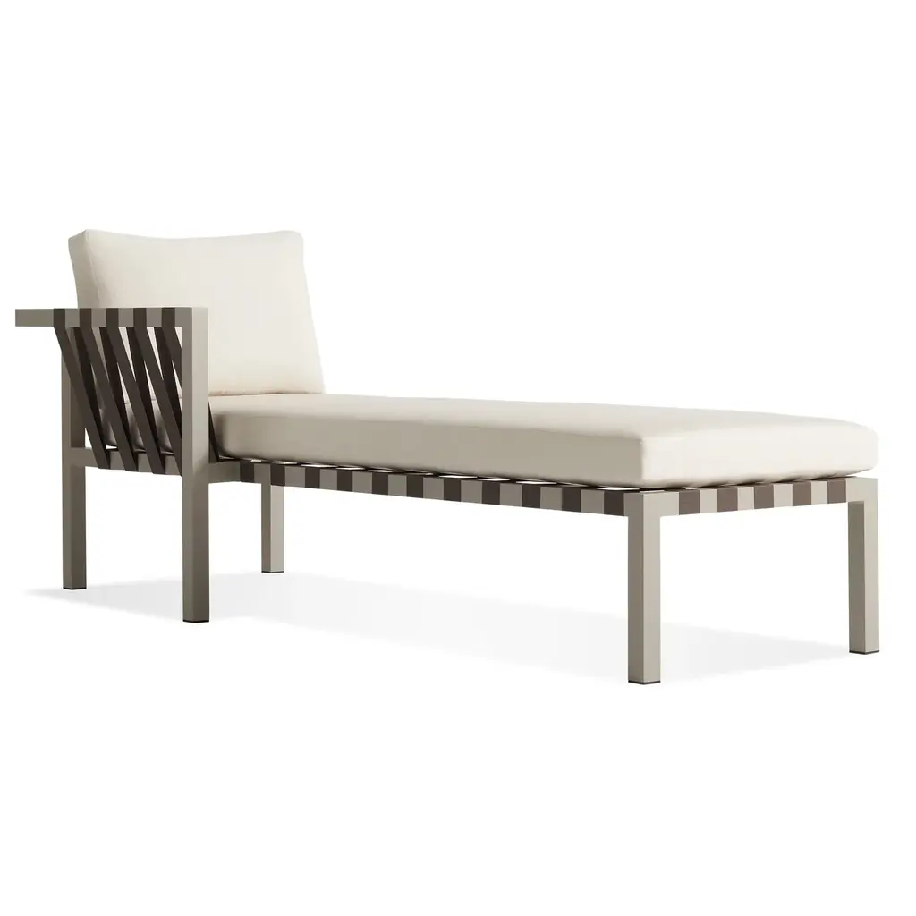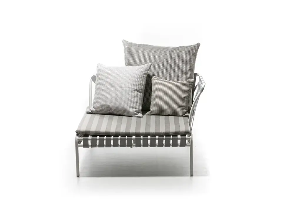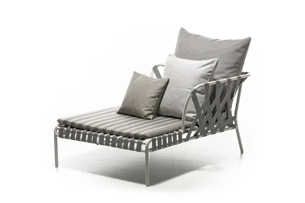 Inout 858 L-R/859 L-R is the chaise longue, one right (R) or left (L) armrest, with an aluminium tubular frame with Pearl, Oxido, Agate e Slate finishes, woven with Tabacco, blue, black or grey elastic belts. Cushions with removable covers.The Inout 852/853 sofas and Inout 858/859 dormeuses develop around a light structure in Pearl, Oxido, Agate or Slate painted embossed tubular aluminium, an ecological material, unique for its technical qualities. To this is added a particular weave in grey, black, tobacco or blue elastic strap, an innovative product based on synthetic rubber and propylene. For greater softness, seat cushions and loose cushions with removable upholstery.Inout is a broad and varied collection of chairs, stools, armchairs, sofas, tables, occasional tables, and accessories portraying the countless ways Gervasoni imagines spending time outdoors. Exotic suggestions are alternated with elements of sophisticated essentiality. Traditional outdoor materials such as wood, worked to enhance its natural properties, are paired with latest generation ones specifically designed to withstand weathering, but no less seductive and poetic. Even the weaving tradition is re-interpreted to resist against water and sunlight, maintaining its technical characteristics and colours unaltered over time.The Gervasoni Outdoor collection is the result of a careful selection of natural and technical materials worked with skillful craftsmanship and innovative technologies. The company’s products adapt to different styles of outdoor living, furnishing – with absolute ease, elegance and free customisation – terraces, gardens or swimming pools, from the most urban and contemporary to the most sophisticated or surrounded by nature. Each place has its own unique character that must be respected and enhanced. The key features of the range are, as always, attention to detail, excellent workmanship and in-depth research into materials.