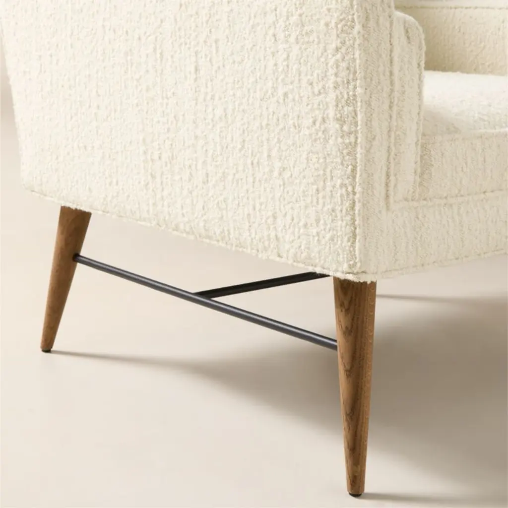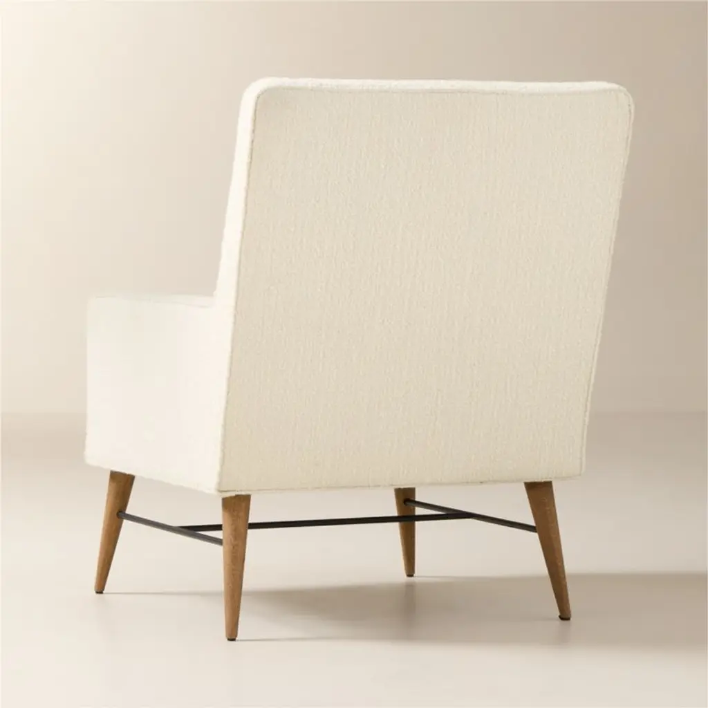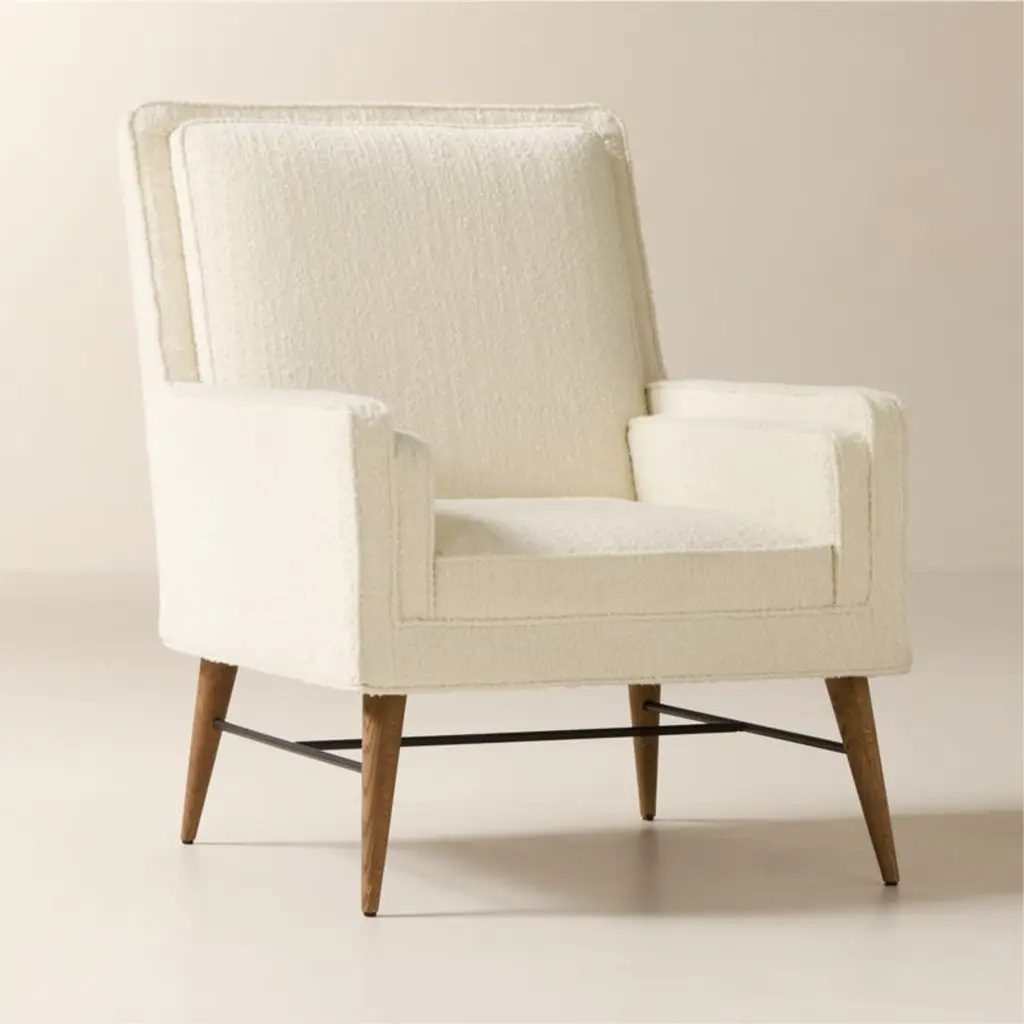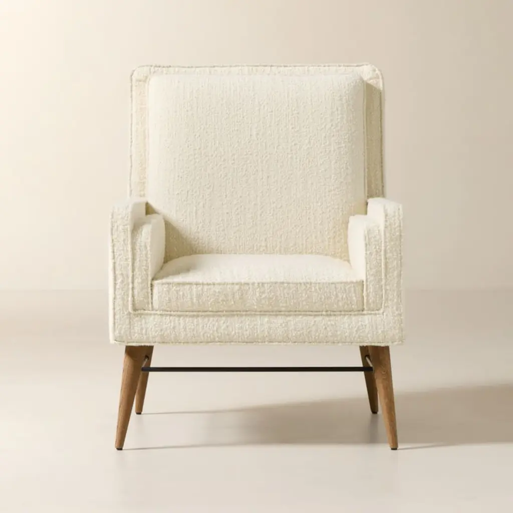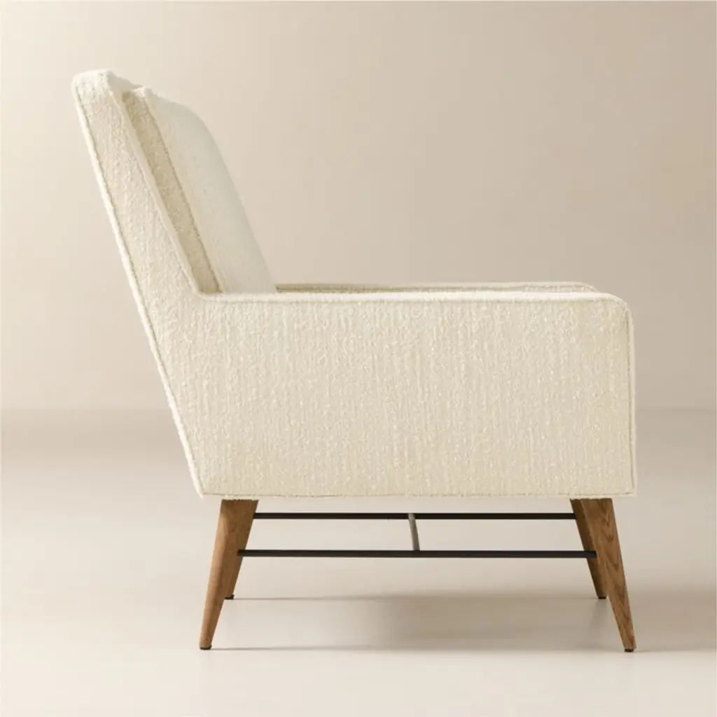 Introduced in 1952 as part of Paul McCobb's groundbreaking Irwin collection, the Model 5012 chair is a quintessential icon of midcentury design. Long sought after by collectors, the original chair is reintroduced with luxurious Italian boucle upholstery and the classic warmth of solid oak legs. Welt detailing and a stacked cushion look on arms reveal the chair's high level of European craftsmanship, which echoes McCobb's mastery of form and function. CB2 exclusive.