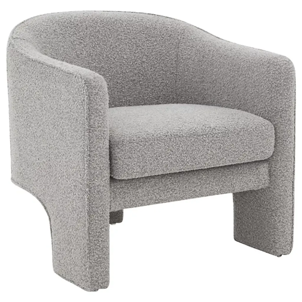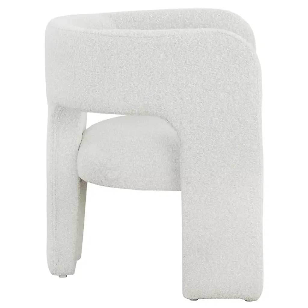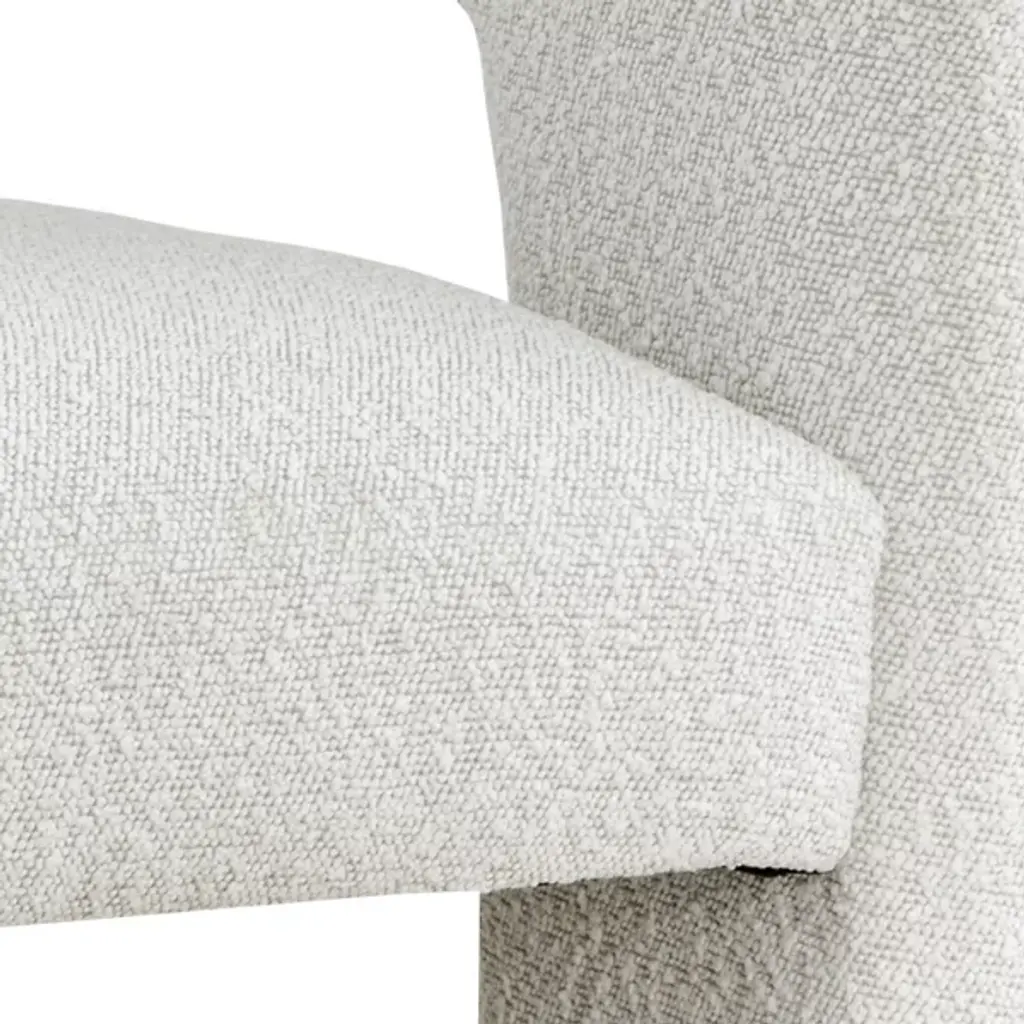 The Isidore Lounge Chair from Sunpan combines clean lines and contoured arches to create a distinct contemporary piece. Its stylish design is characterized by a curved backrest and an open back, ensuring optimal comfort. This exceptional, sculptural chair is fully upholstered in white boucle fabric, providing a fresh and inviting look. Crafted with polyester material and a plastic frame, it effortlessly blends contemporary and mid-century modern styles, seamlessly coexisting in a chic, contemporary design.