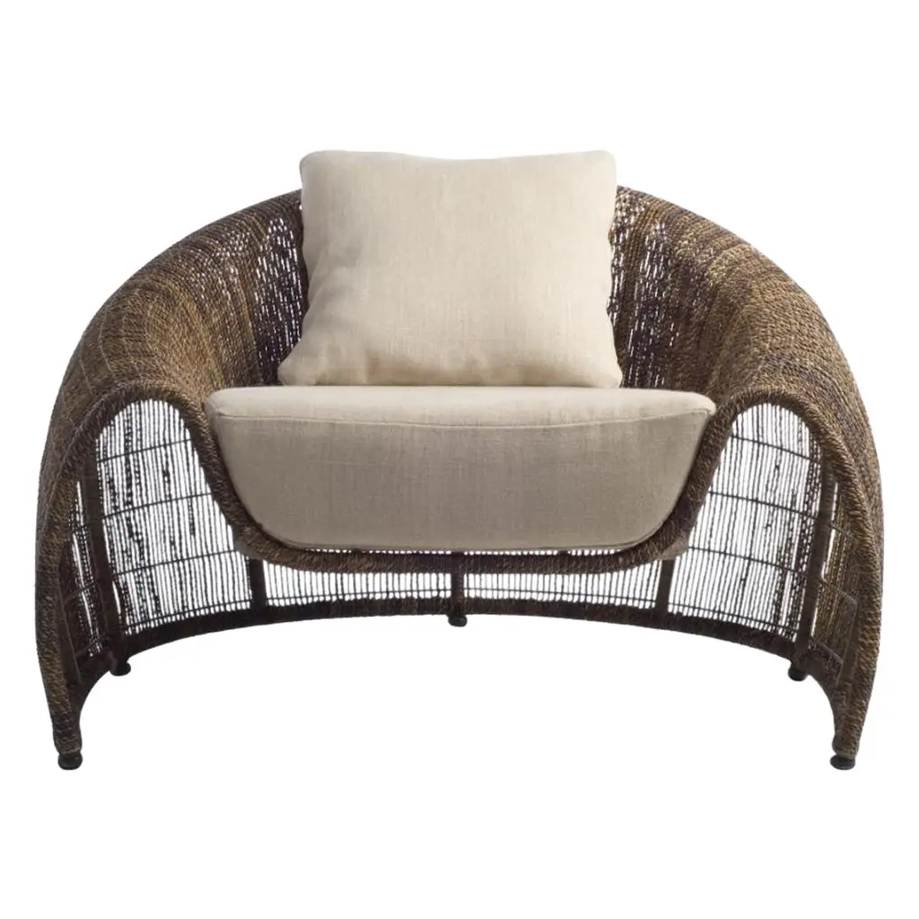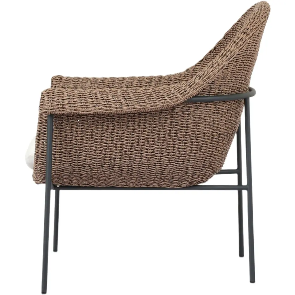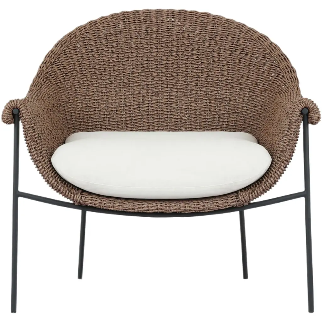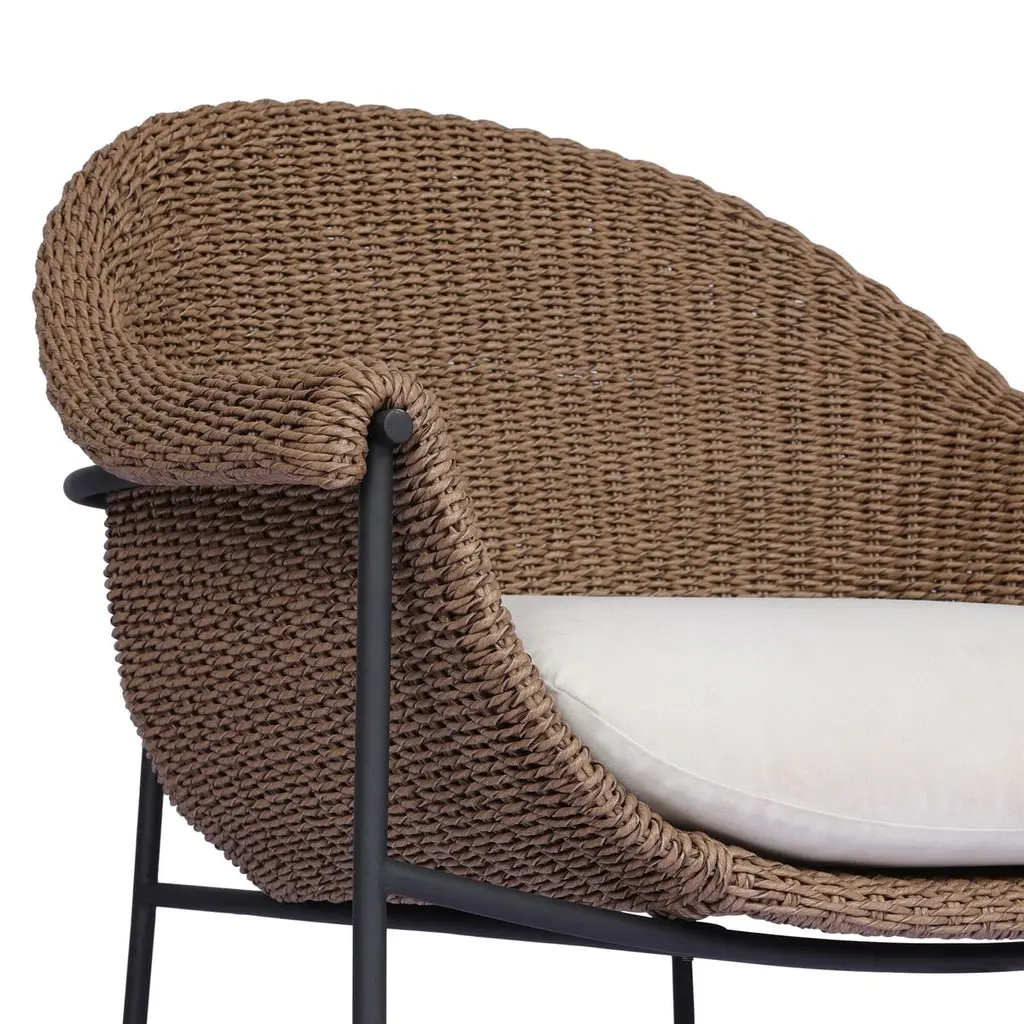 With a curvy silhouette and classic rolled arms, woven hyacinth adds texture to vintage-inspired outdoor accent seating, complemented by an airy iron cradle base for a beautiful balance of scale. Cover or store indoors during inclement weather and when not in use.