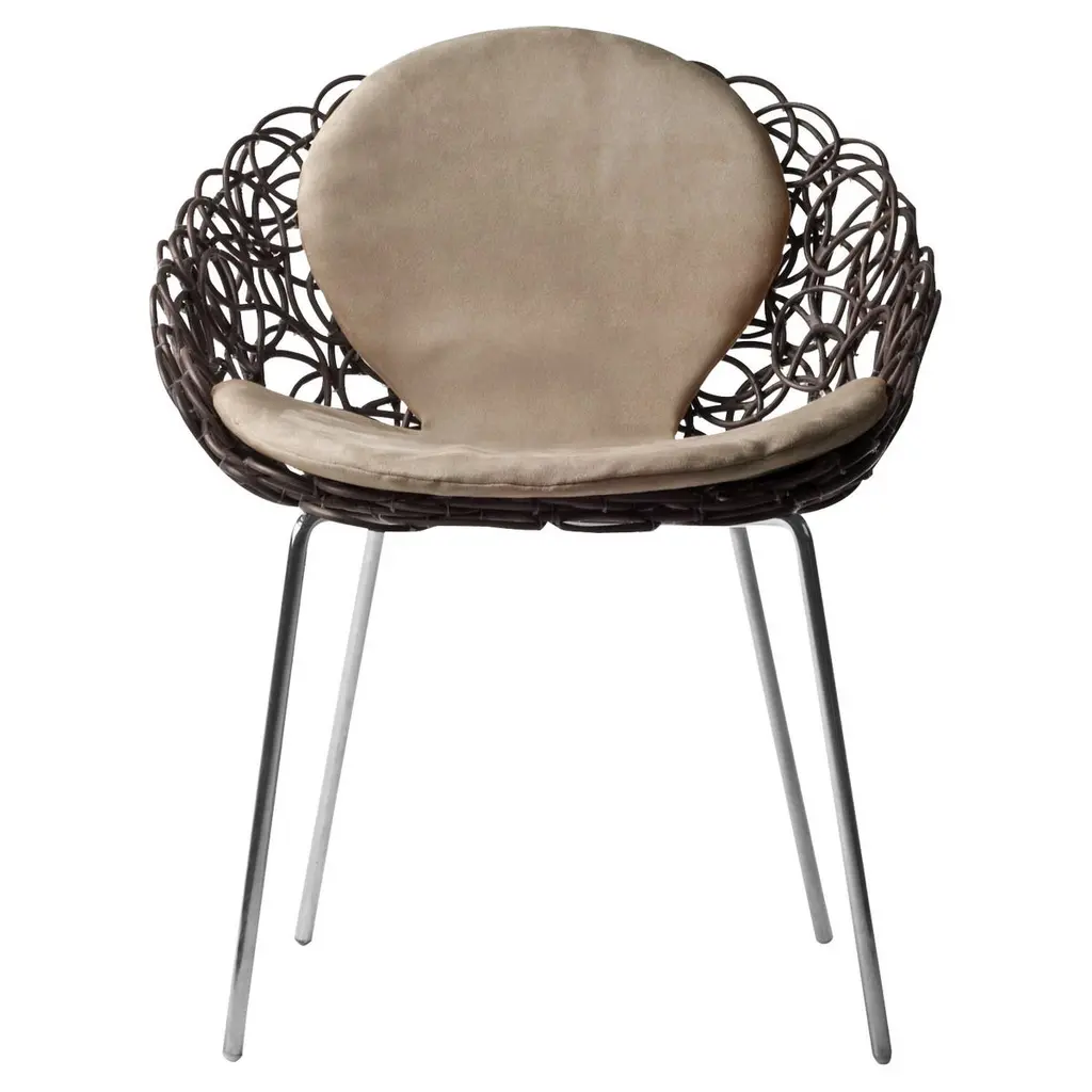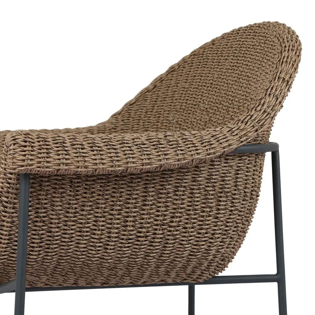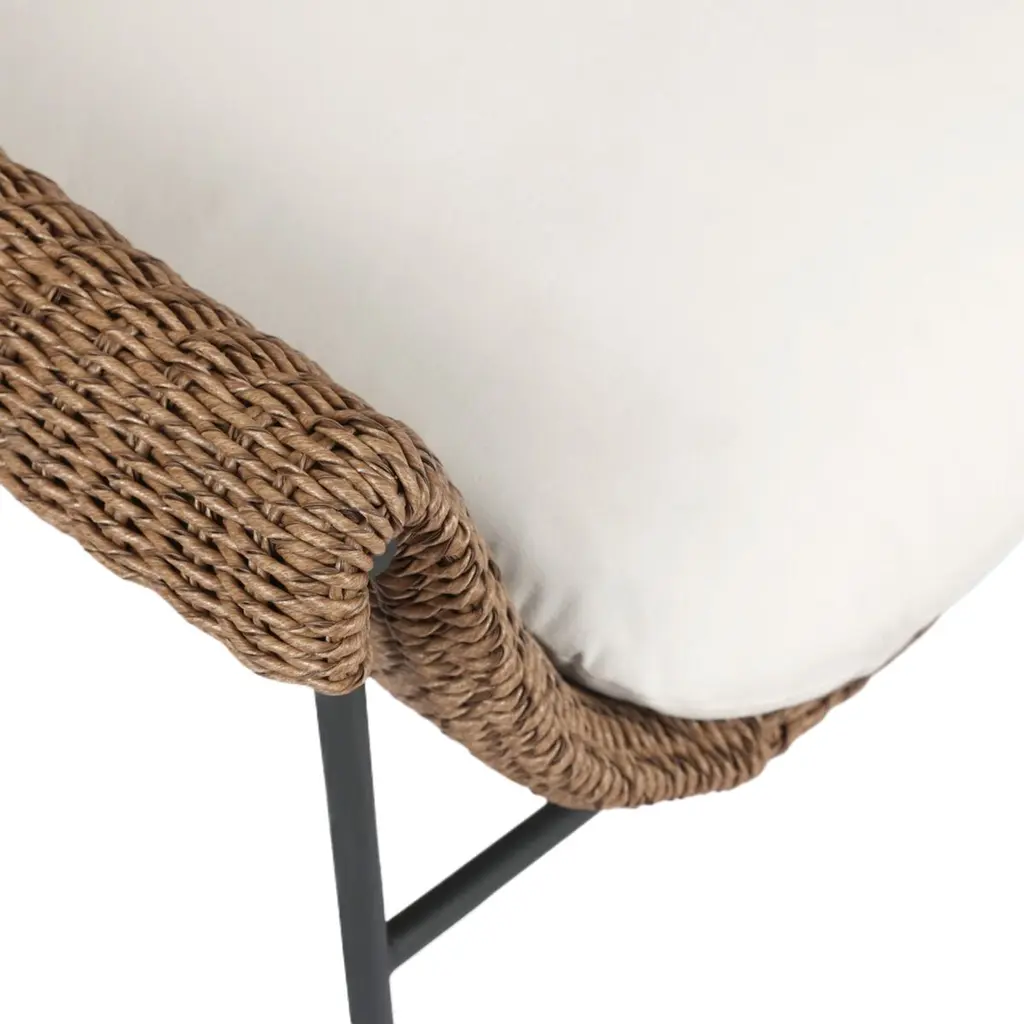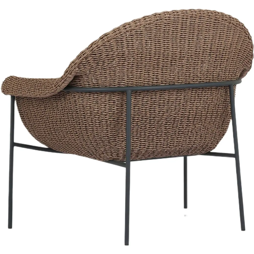 With a curvy silhouette and classic rolled arms, woven hyacinth adds texture to vintage-inspired outdoor accent seating, complemented by an airy iron cradle base for a beautiful balance of scale. Cover or store indoors during inclement weather and when not in use.
