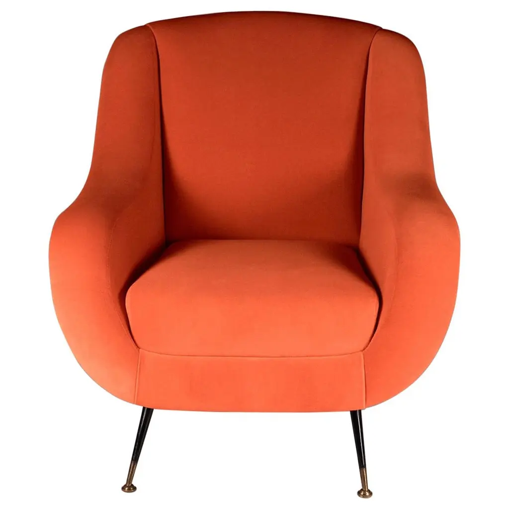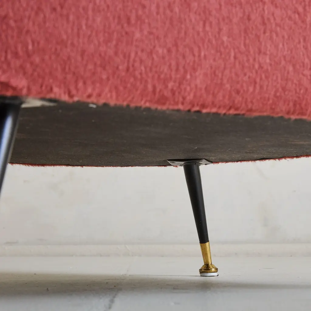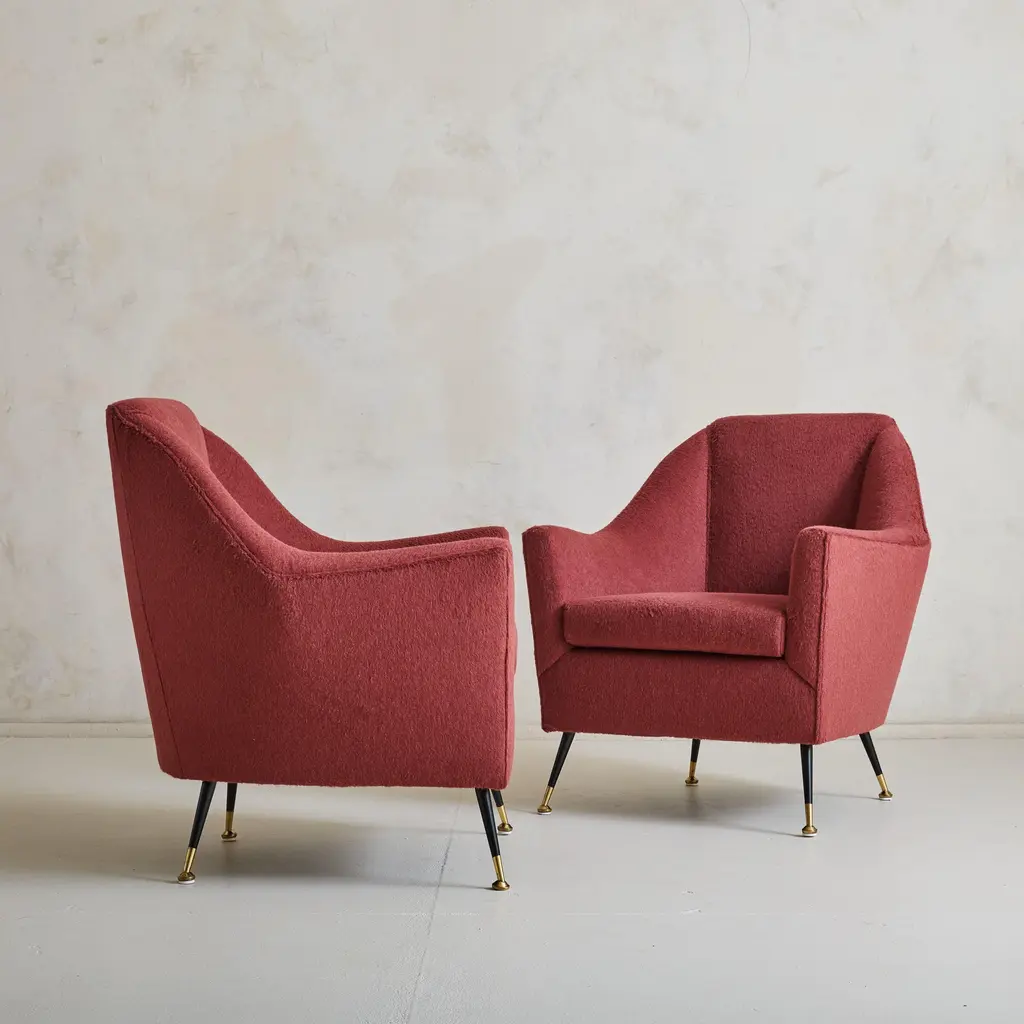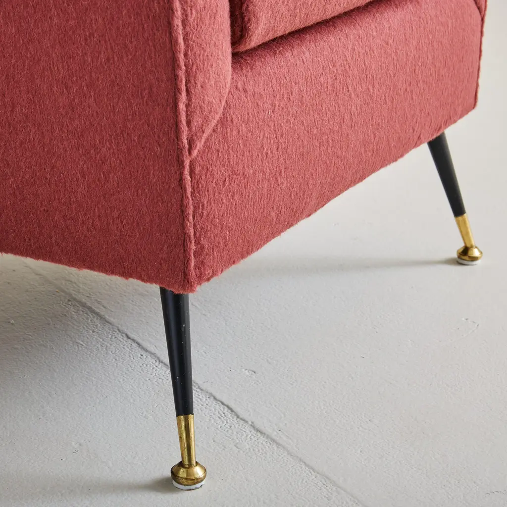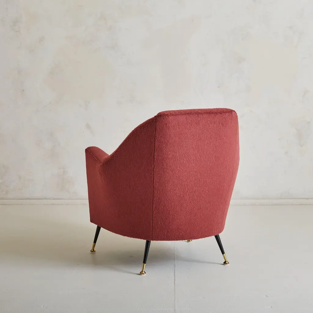 Sold and priced individually. A 1960s Italian lounge chair, echoing the style of Osvaldo Borsani. Its generously proportioned form is defined by clean lines and an angular silhouette, capturing the essence of mid-century modernism. Reupholstered in sumptuous burgundy alpaca mohair, the tactile richness complements its minimal shape. This chair is grounded by splayed black metal legs with brass sabots. Osvaldo Borsani (1911–1985) was an Italian designer and architect born into a family of fine furniture makers. He studied fine arts at the Accademia di Belle Arti di Brera in Milan before pursuing architecture at the Politecnico di Milano. In 1943, he designed his own house in Varedo, Villa Borsani, which has since been preserved and now serves as an archive of his work. Condition: Excellent vintage condition. This chair has been carefully reupholstered by our team of restorationists in sumptuous burgundy alpaca mohair with new webbing over medium density foam. Light patina to the brass sabots. Additional Dimensions: AH 22.75"