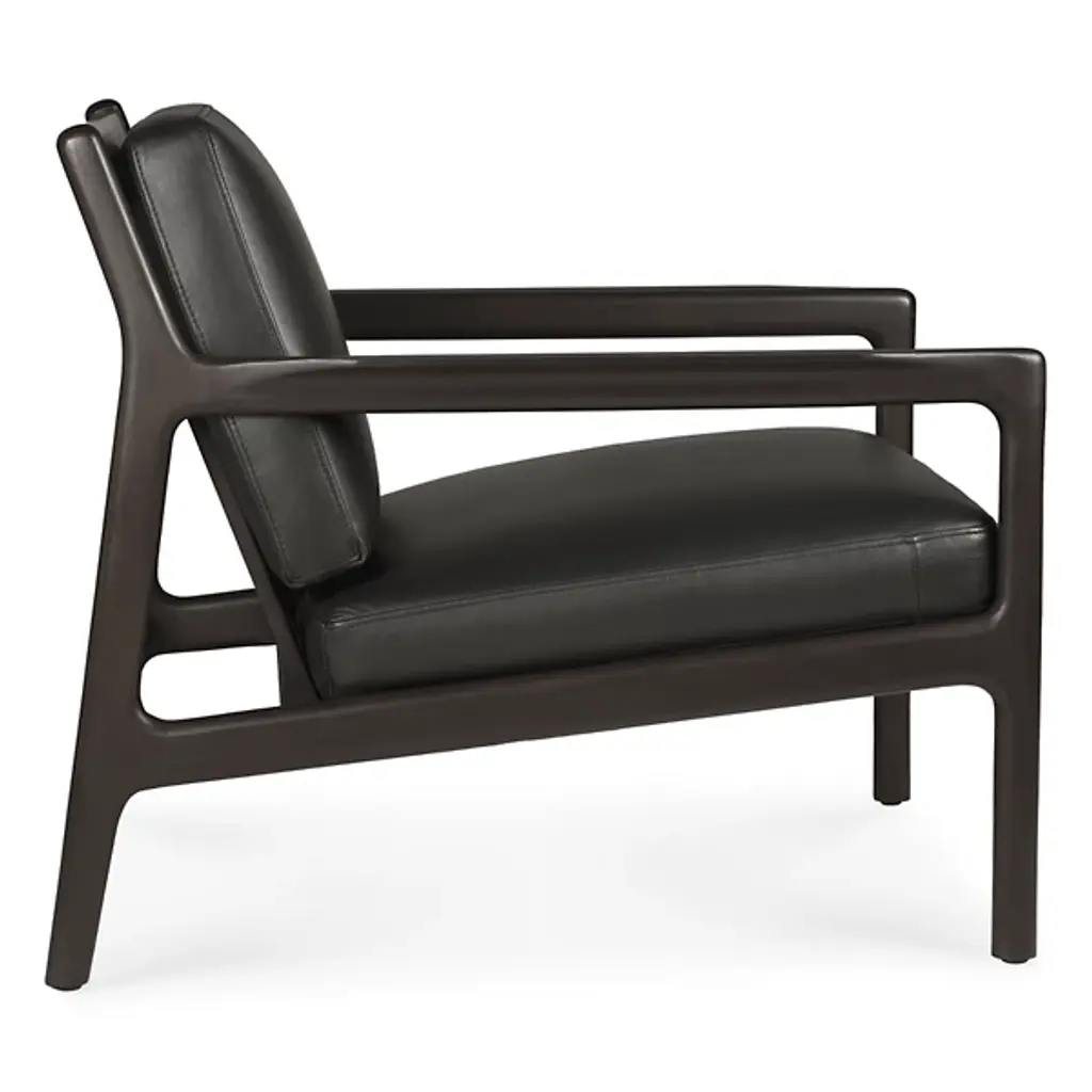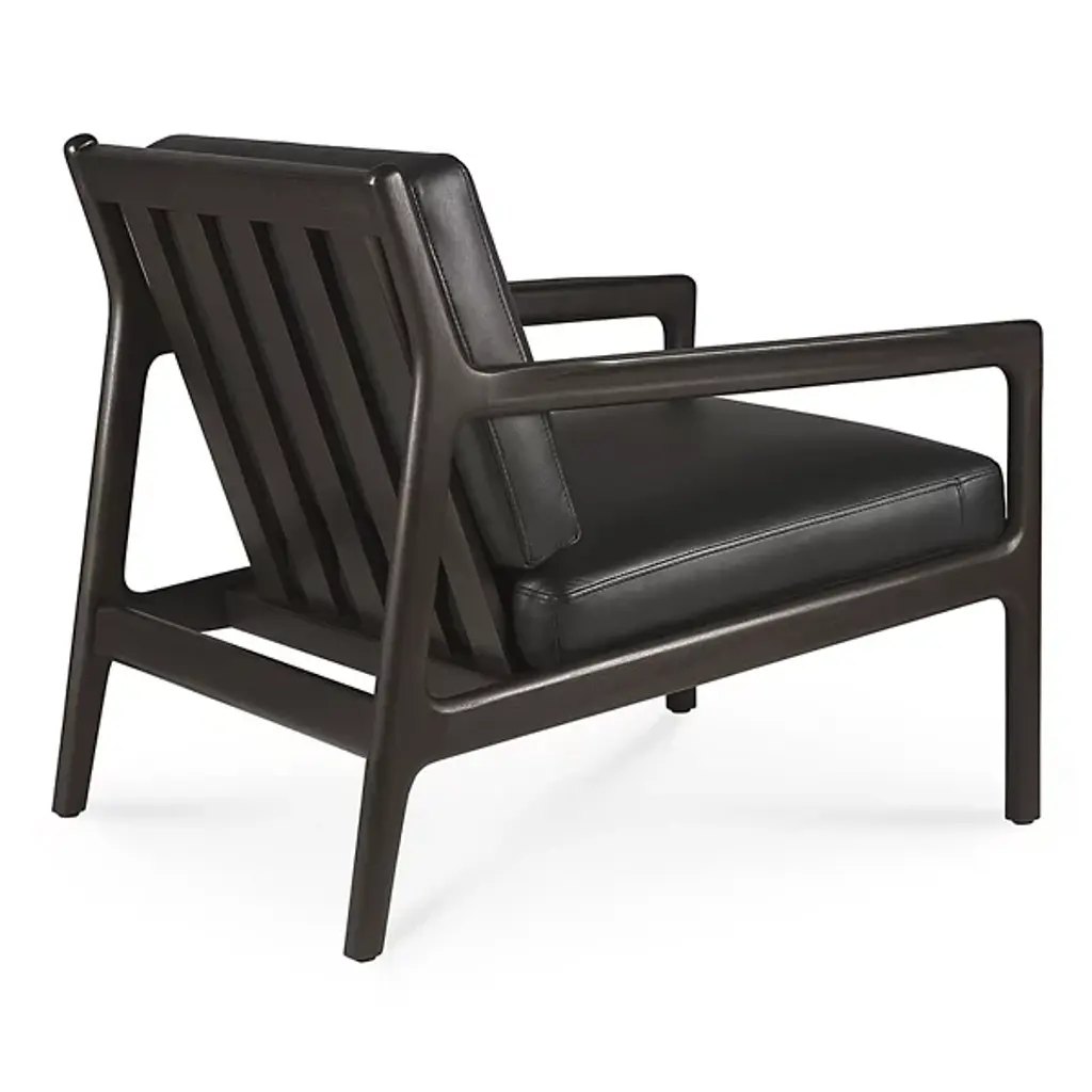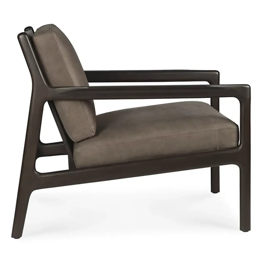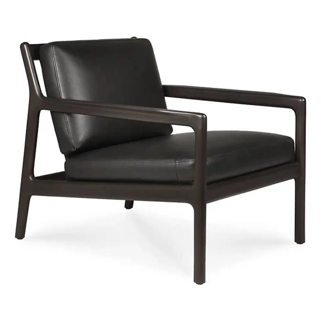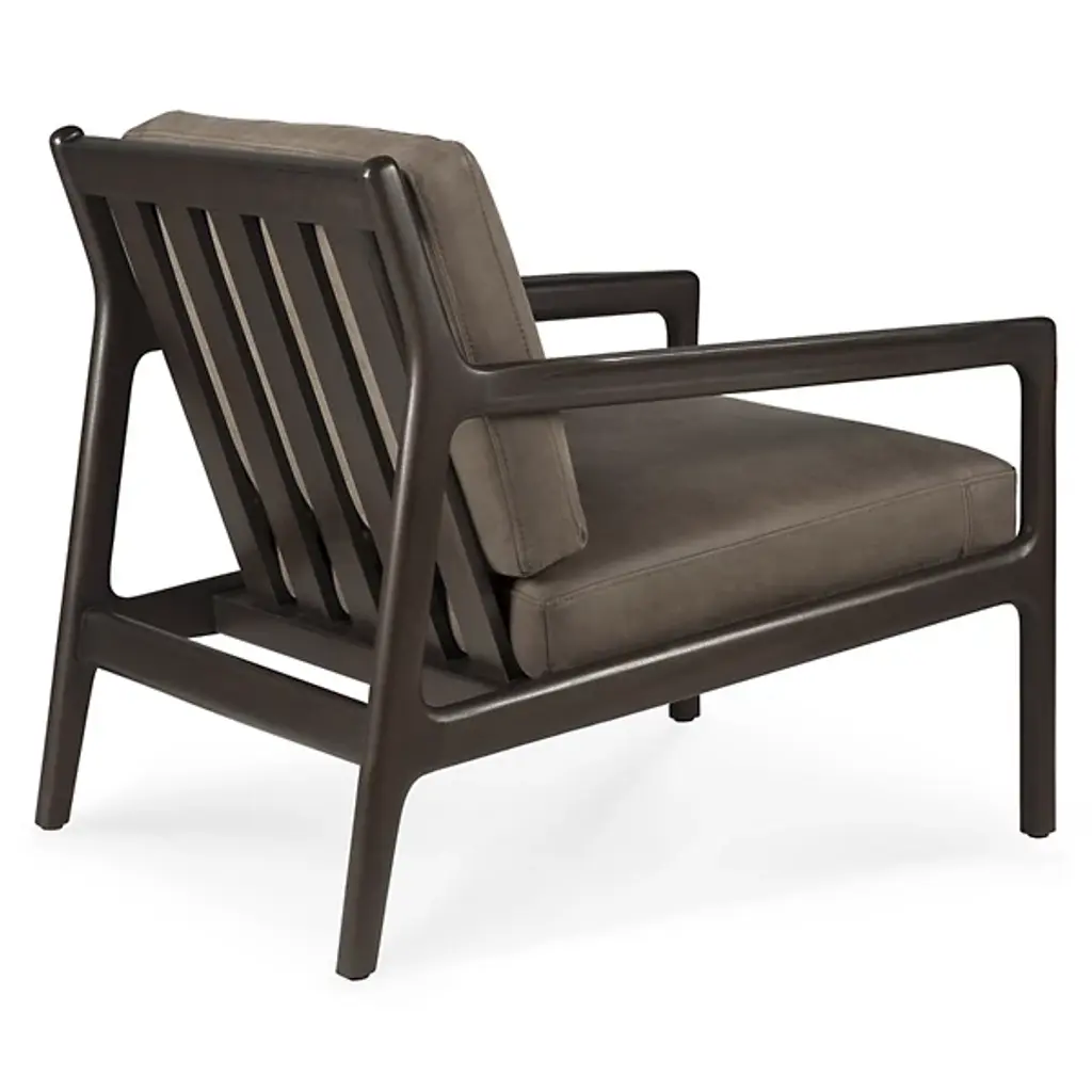 Retro appeal with an expressive modern angularity. The Jack Upholstered Lounge Chair from Ethnicraft offers a casual, classic appeal to interiors. A Jacques Deneef design, it rises from a four-legged wooden frame with a subtly dark varnish. The back and seat of the frame are slightly angled for comfort, and all sharp edges are rounded off, adding a soothing Scandinavian modern presence, while a seat and back of soft, leather-upholstered cushions add a welcome encompassing comfort that's able to be passed down for generations.