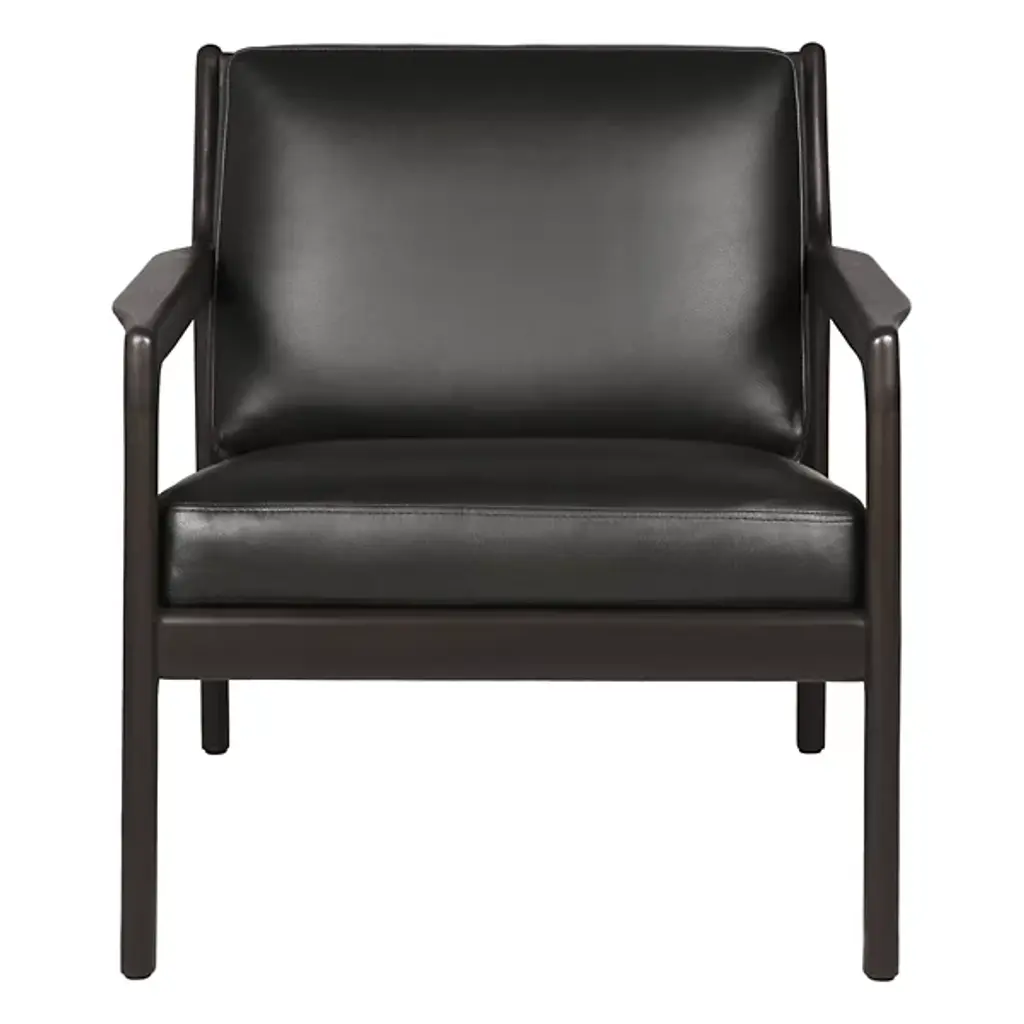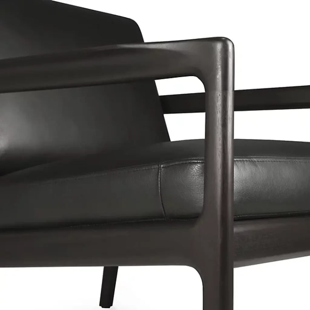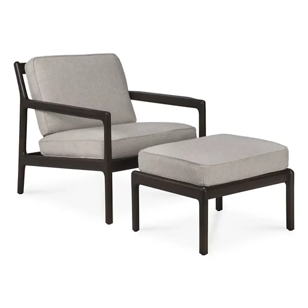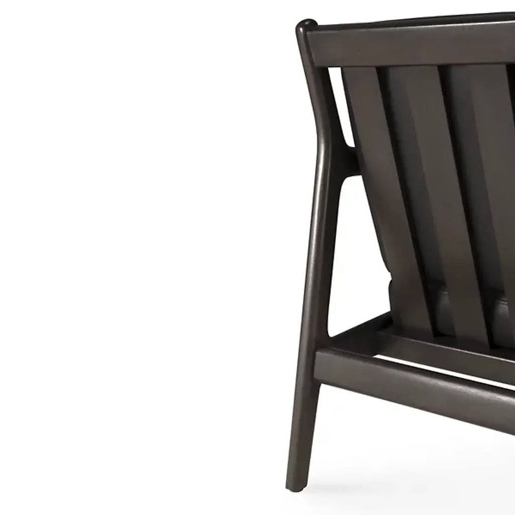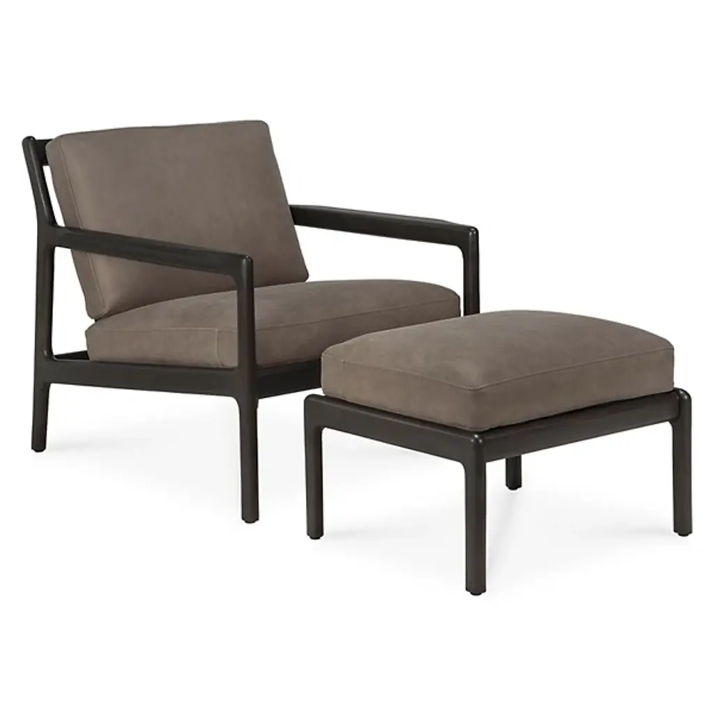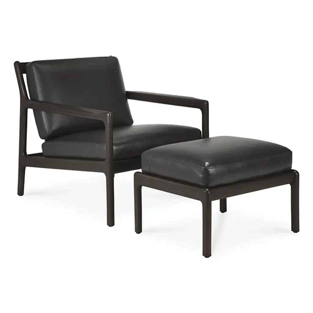 Retro appeal with an expressive modern angularity. The Jack Upholstered Lounge Chair from Ethnicraft offers a casual, classic appeal to interiors. A Jacques Deneef design, it rises from a four-legged wooden frame with a subtly dark varnish. The back and seat of the frame are slightly angled for comfort, and all sharp edges are rounded off, adding a soothing Scandinavian modern presence, while a seat and back of soft, leather-upholstered cushions add a welcome encompassing comfort that's able to be passed down for generations.