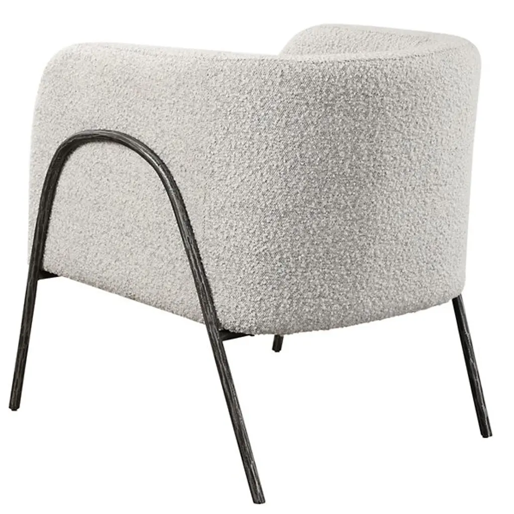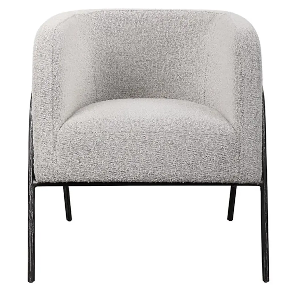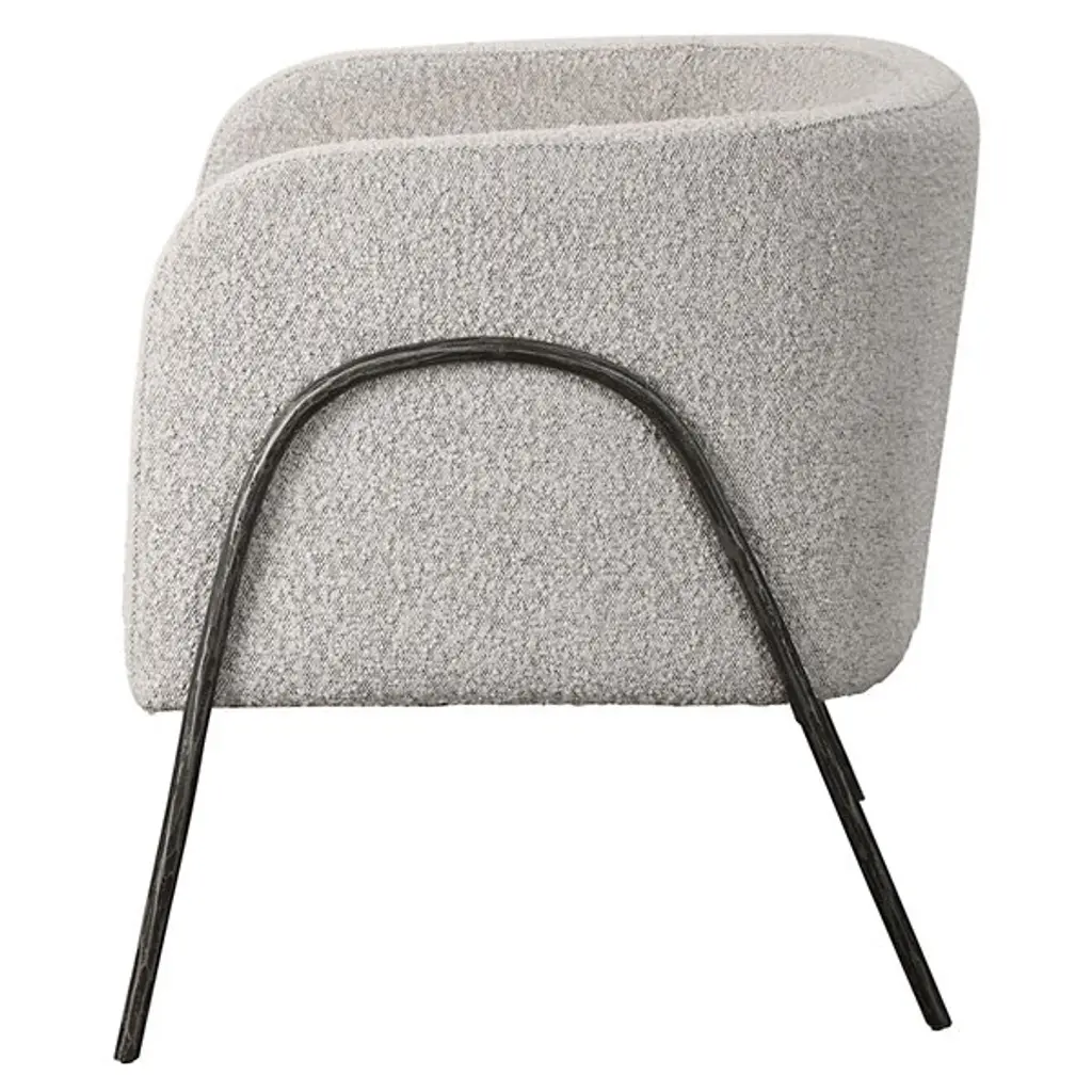 Find sanctuary in the enveloping curves of the barrel-shaped Jacobsen Chair from Uttermost. This modern piece looks to Scandinavian design for inspiration. It wears its Scandinavian style with a refined frame of tall arching legs. These legs are chiseled from iron for an enhanced artisanal personality. Nestled inside, the piece wraps a U-shaped seat shell around the body, creating natural armrests. Understated cushioning and textured fabric pair up to give on an easy-going lounging experience.