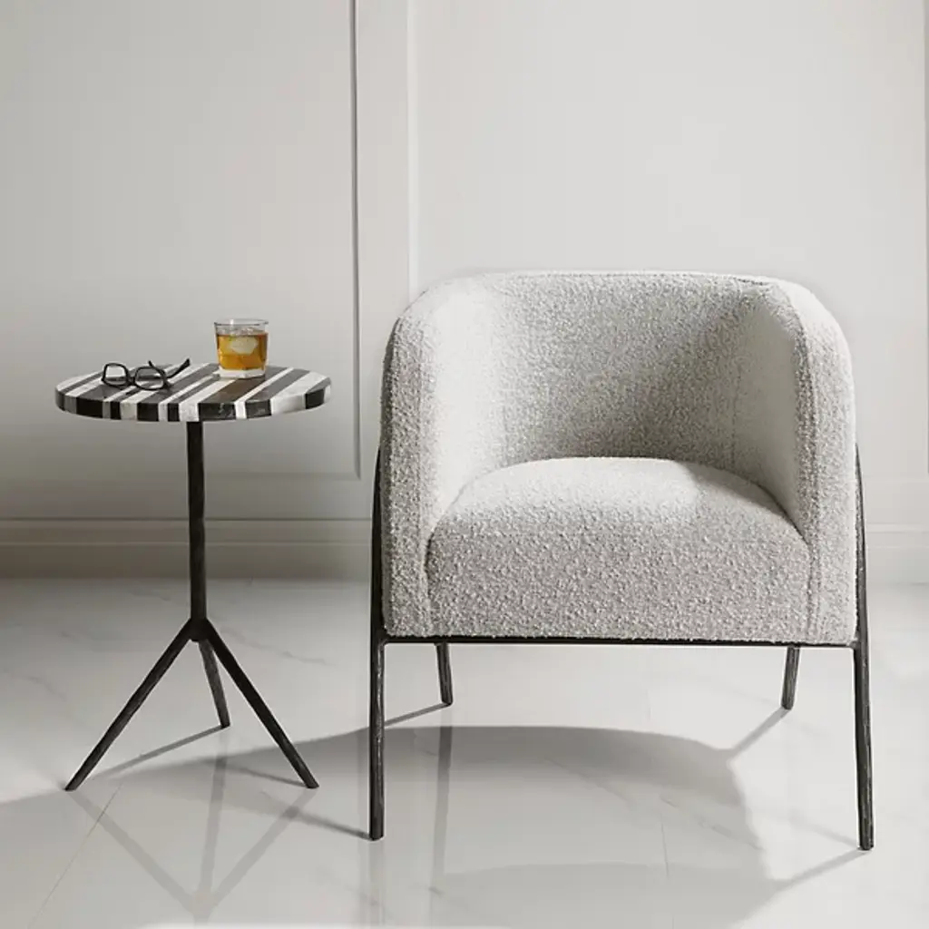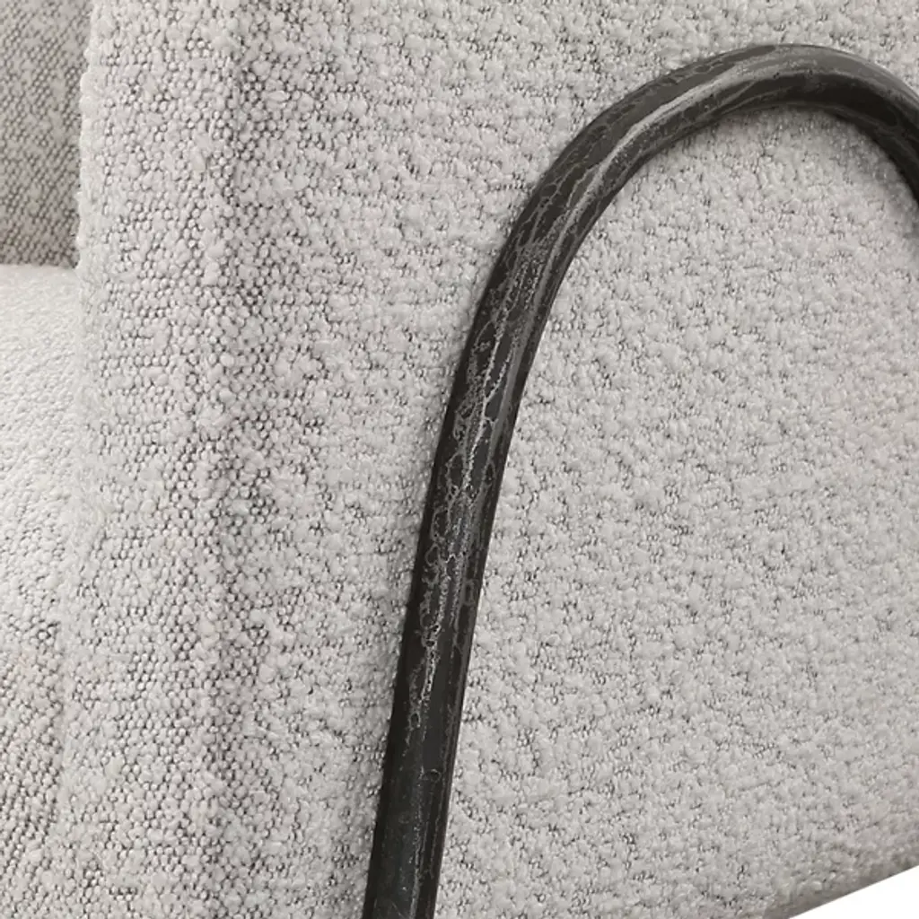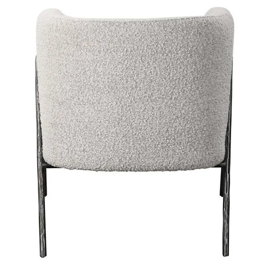 Find sanctuary in the enveloping curves of the barrel-shaped Jacobsen Chair from Uttermost. This modern piece looks to Scandinavian design for inspiration. It wears its Scandinavian style with a refined frame of tall arching legs. These legs are chiseled from iron for an enhanced artisanal personality. Nestled inside, the piece wraps a U-shaped seat shell around the body, creating natural armrests. Understated cushioning and textured fabric pair up to give on an easy-going lounging experience.