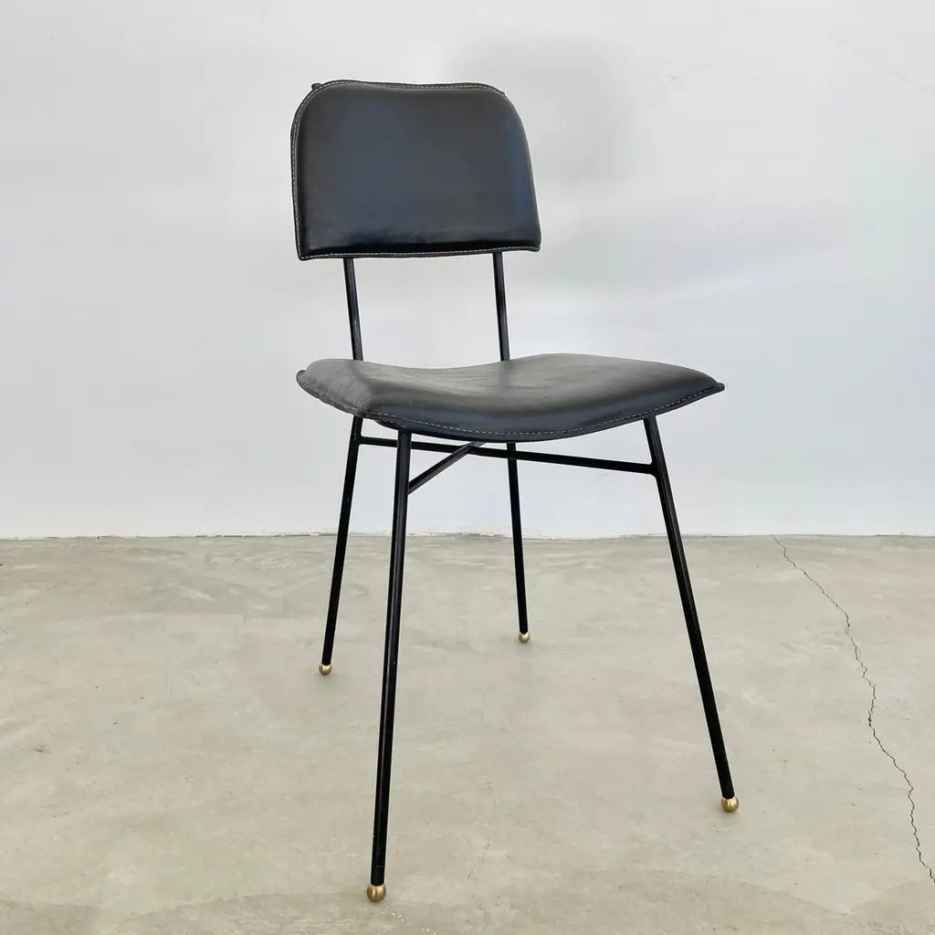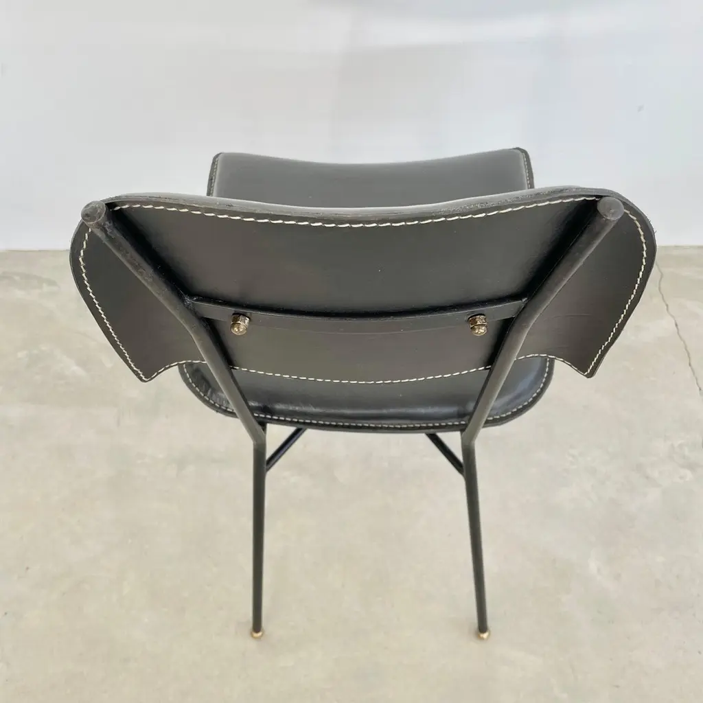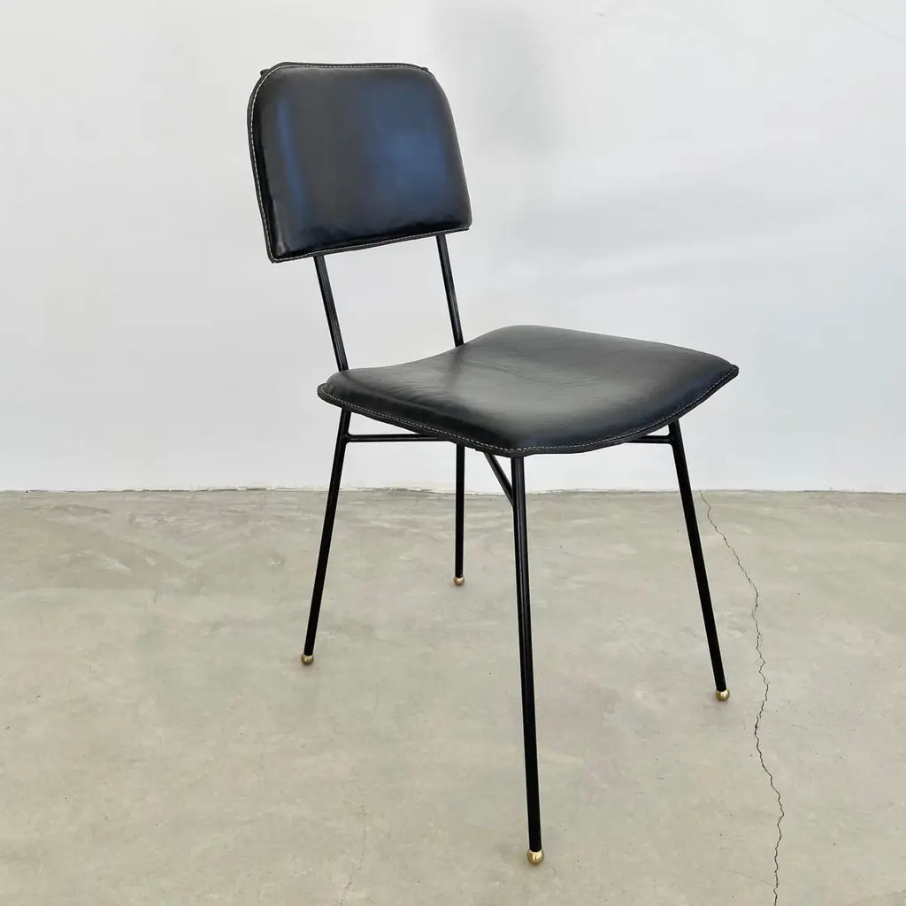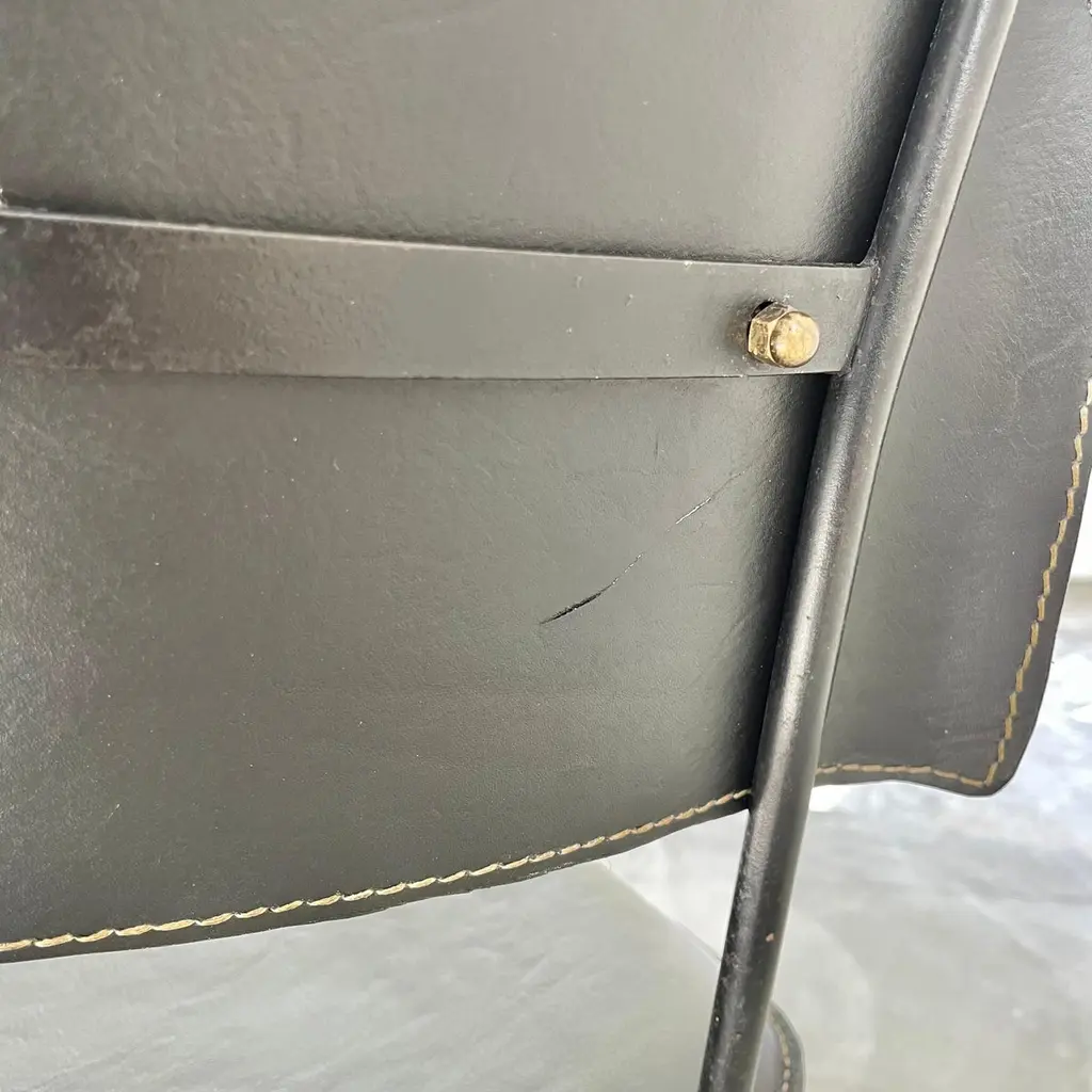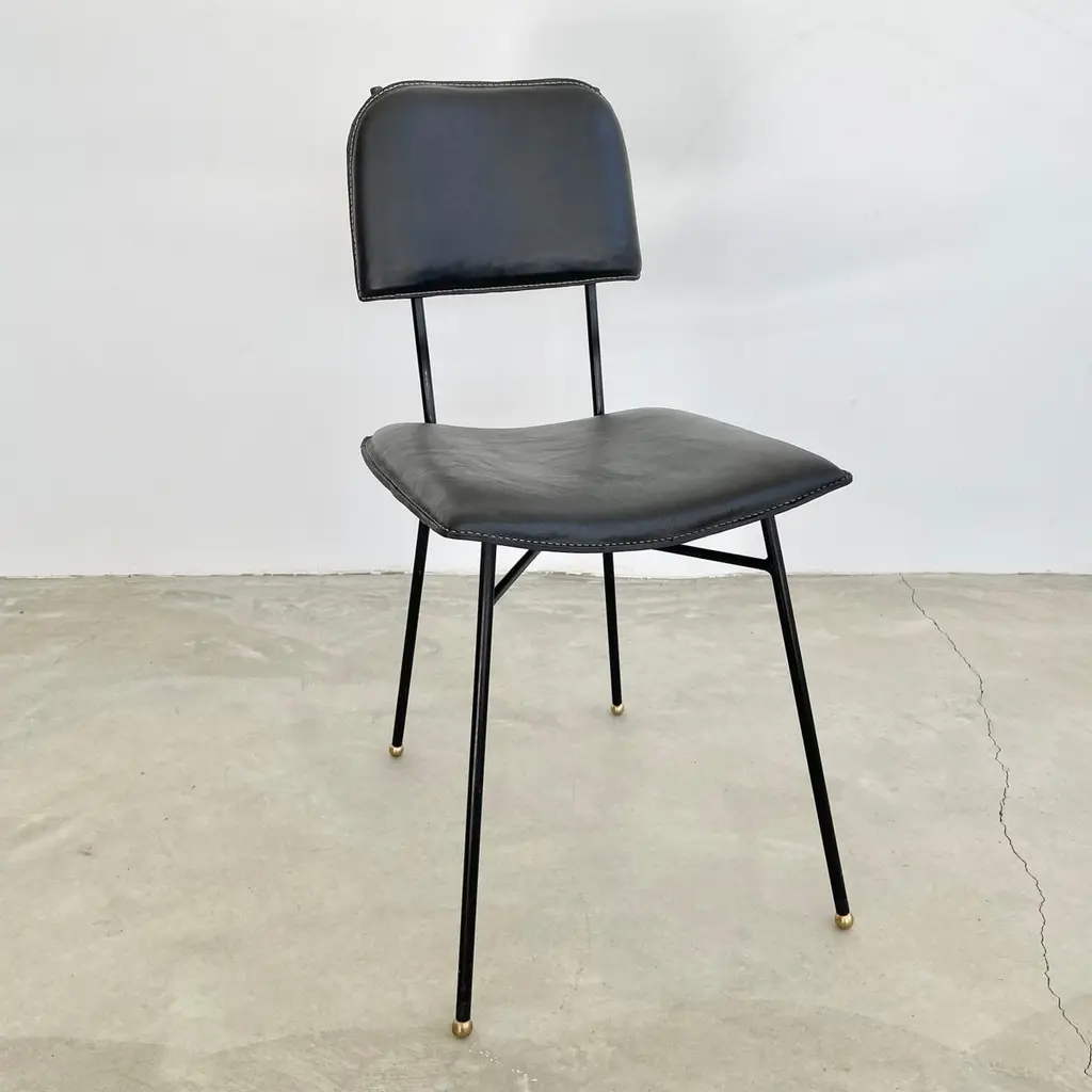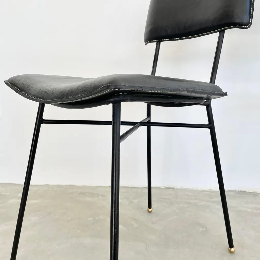 Elegant chair by French designer Jacques Adnet. Iron frame with black leather seat and seat back. Signature Adnet contrast stitching throughout. Brass ball feet. Excellent condition to leather. Great pieces of collectible Jacques Adnet design. Priced individually. 2 available.
