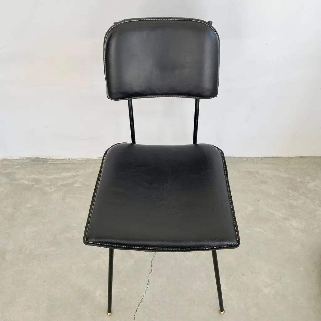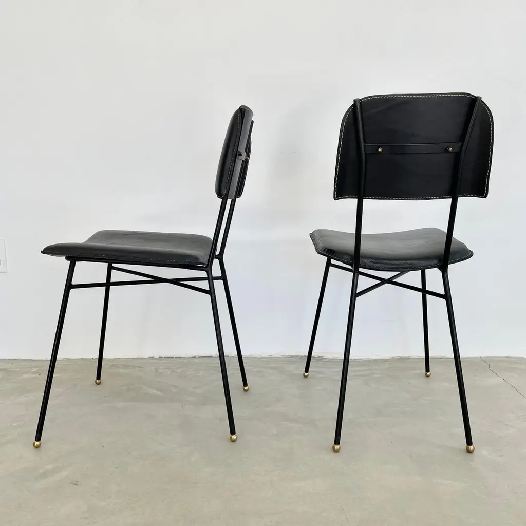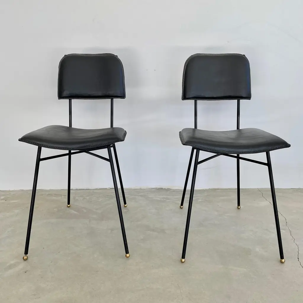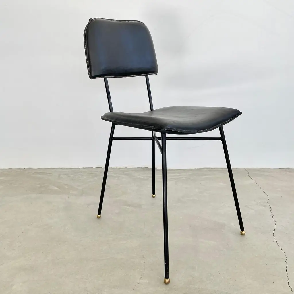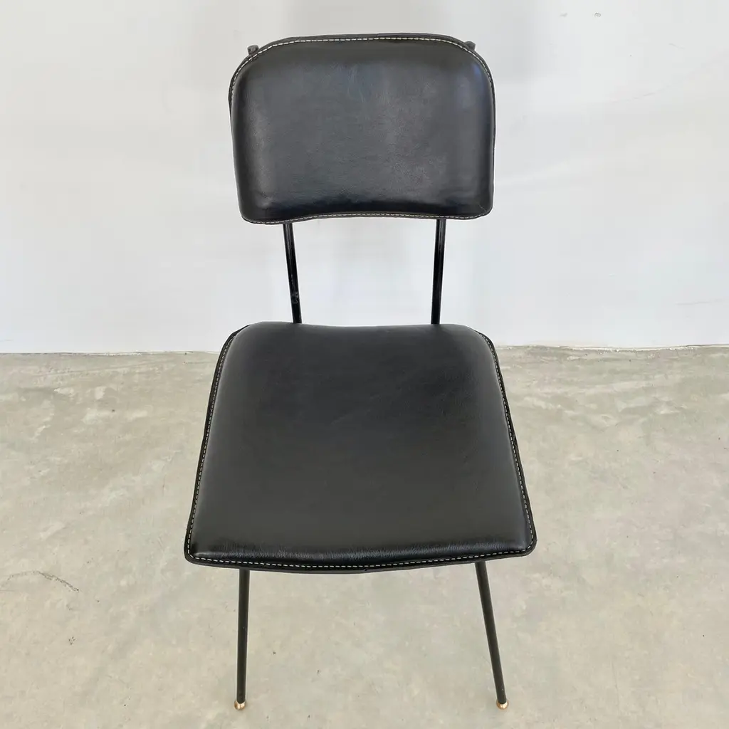 Elegant chair by French designer Jacques Adnet. Iron frame with black leather seat and seat back. Signature Adnet contrast stitching throughout. Brass ball feet. Excellent condition to leather. Great pieces of collectible Jacques Adnet design. Priced individually. 2 available.