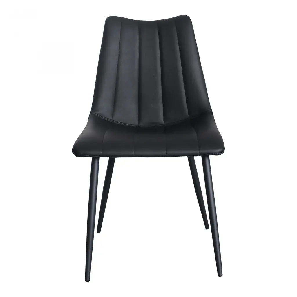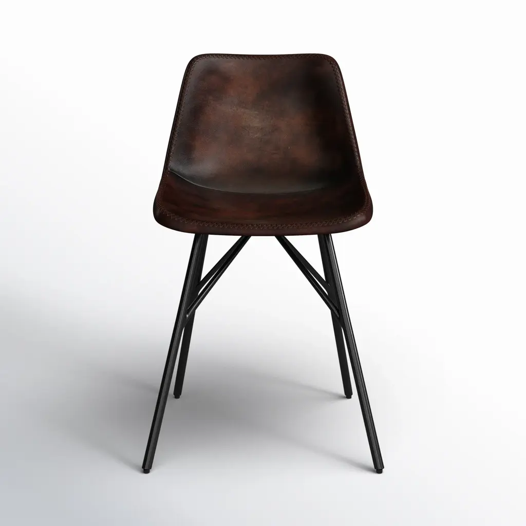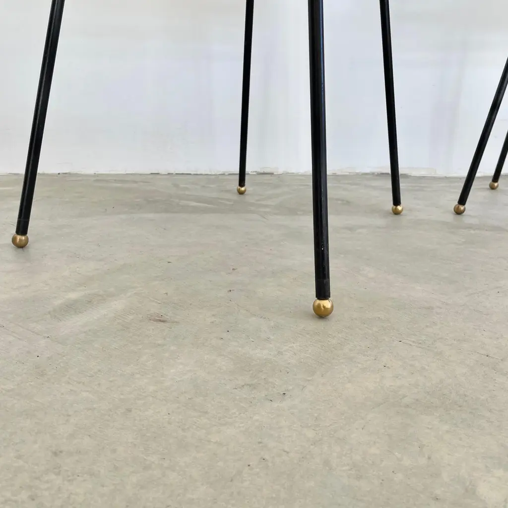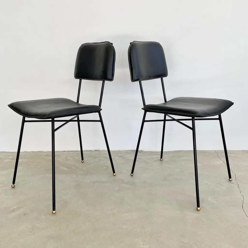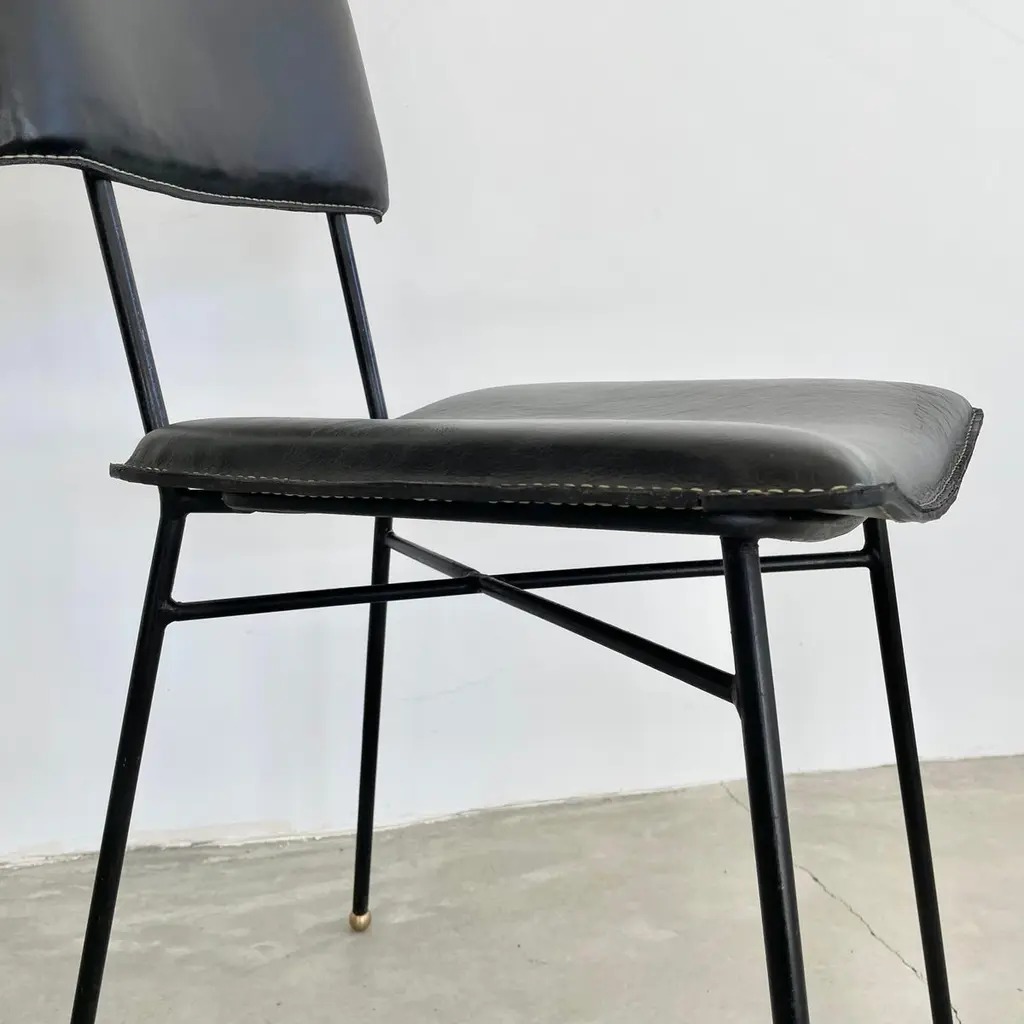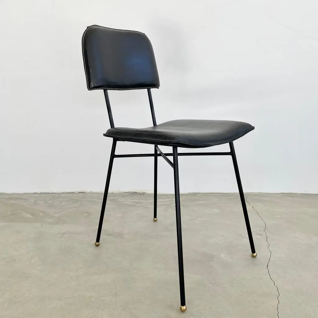 Elegant chair by French designer Jacques Adnet. Iron frame with black leather seat and seat back. Signature Adnet contrast stitching throughout. Brass ball feet. Excellent condition to leather. Great pieces of collectible Jacques Adnet design. Priced individually. 2 available.