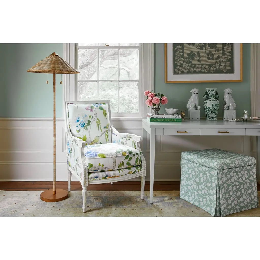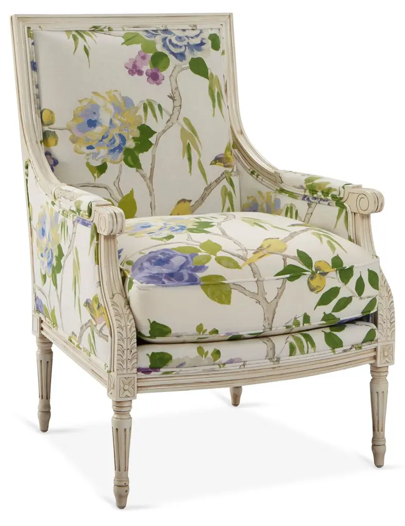 Designed by us and available only at One Kings Lane: This French-inspired armchair features a masterfully carved Italian beechwood frame with sloping arms and padded manchettes. The linen-blend upholstery is fresh and colorful, beautifully balancing the feel of the traditional silhouette. A generous seat fill of down-wrapped foam with a cotton duck core ensures lasting comfort and support. Made in the USA.