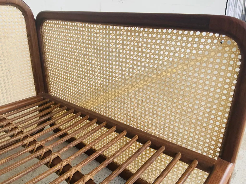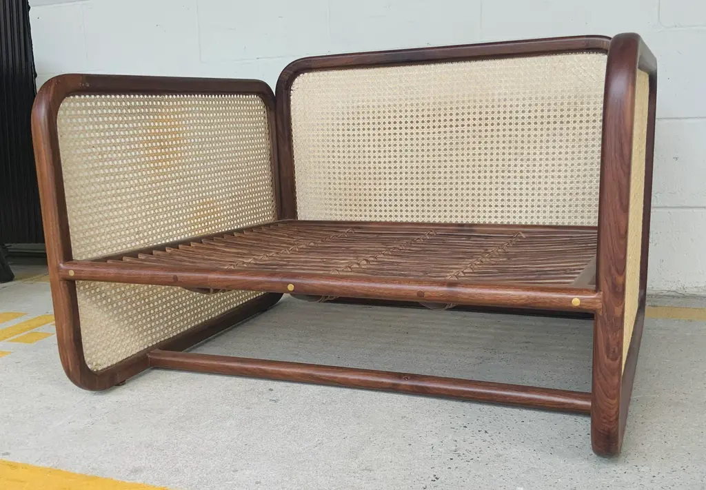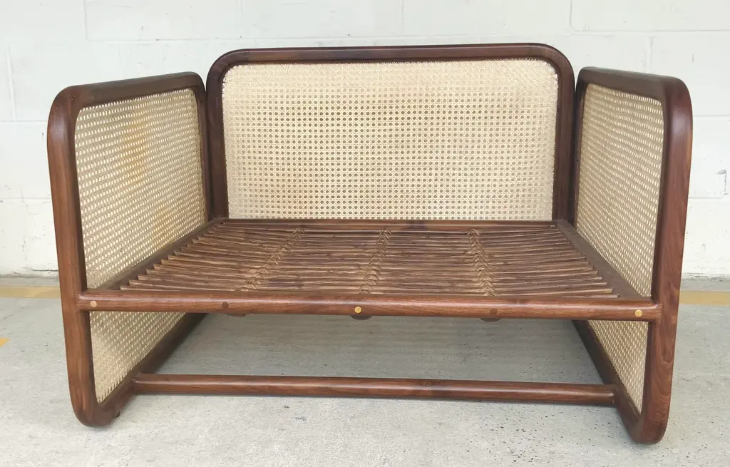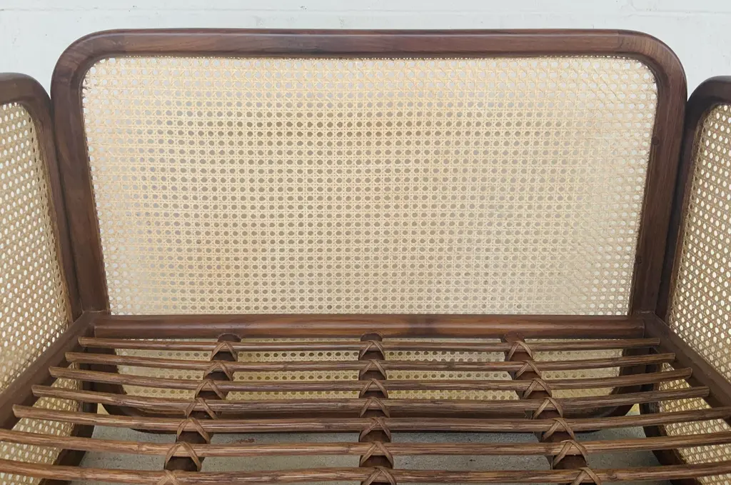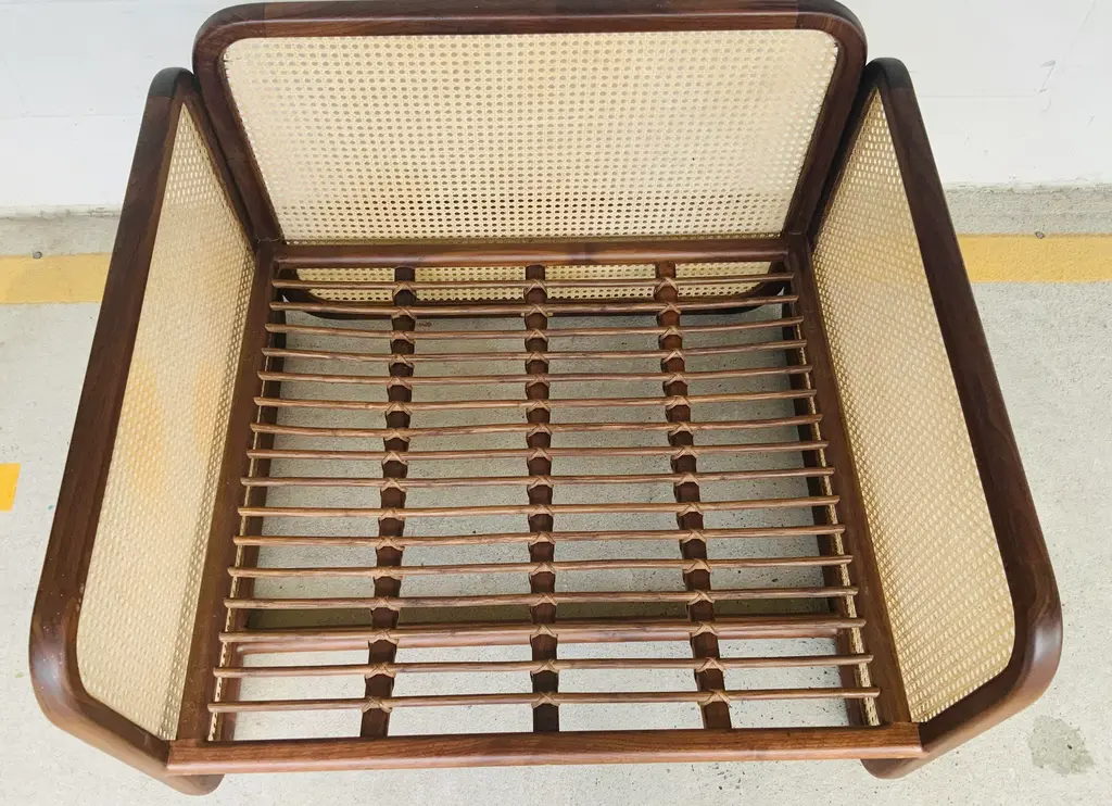 Original Retail $5000, stylish organic modern Jamie Durie for Baker / McGuire The Folde Rattan Lounge Chair, caning detail, customizable, no upholstery included, showroom floor sample