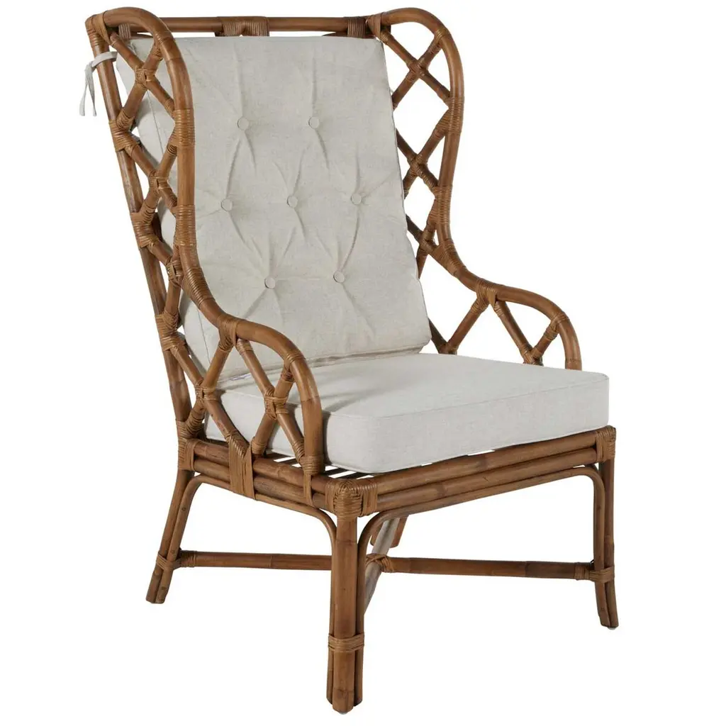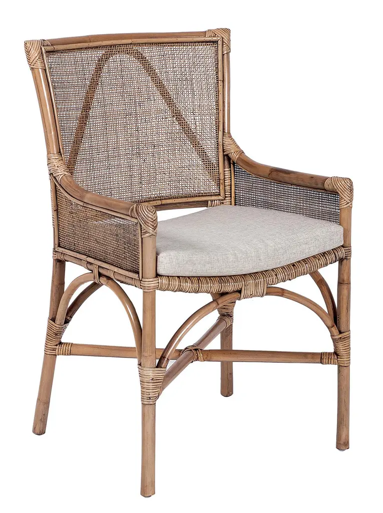 Our pieces are handmade with care, however, we cannot take custom requests. Java Arm Chair. Web Back. Rattan Frame Color - Honey Brown; Cushion Color - Cream. Chair weight limit 225 lbs. Arm height from floor is 24.75".