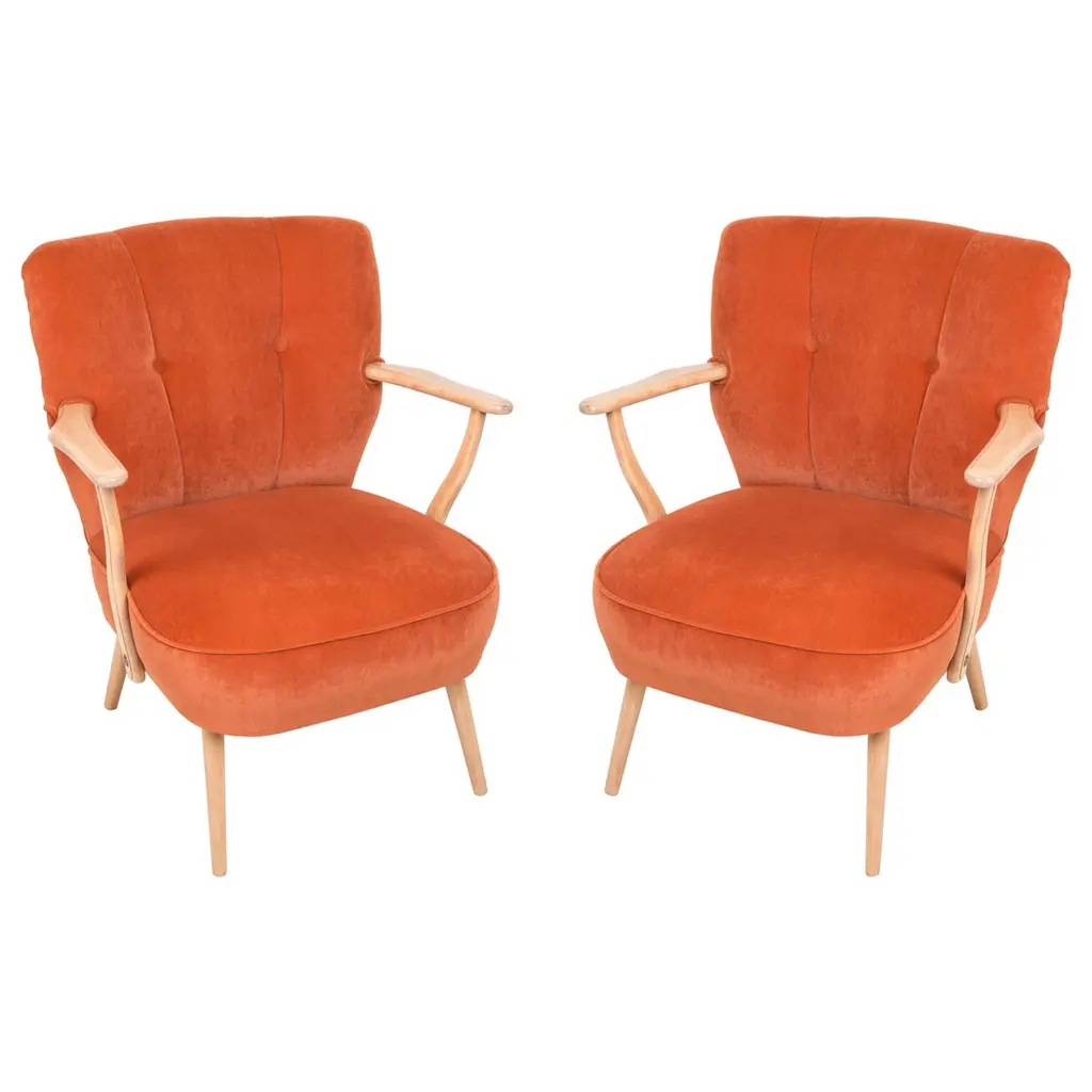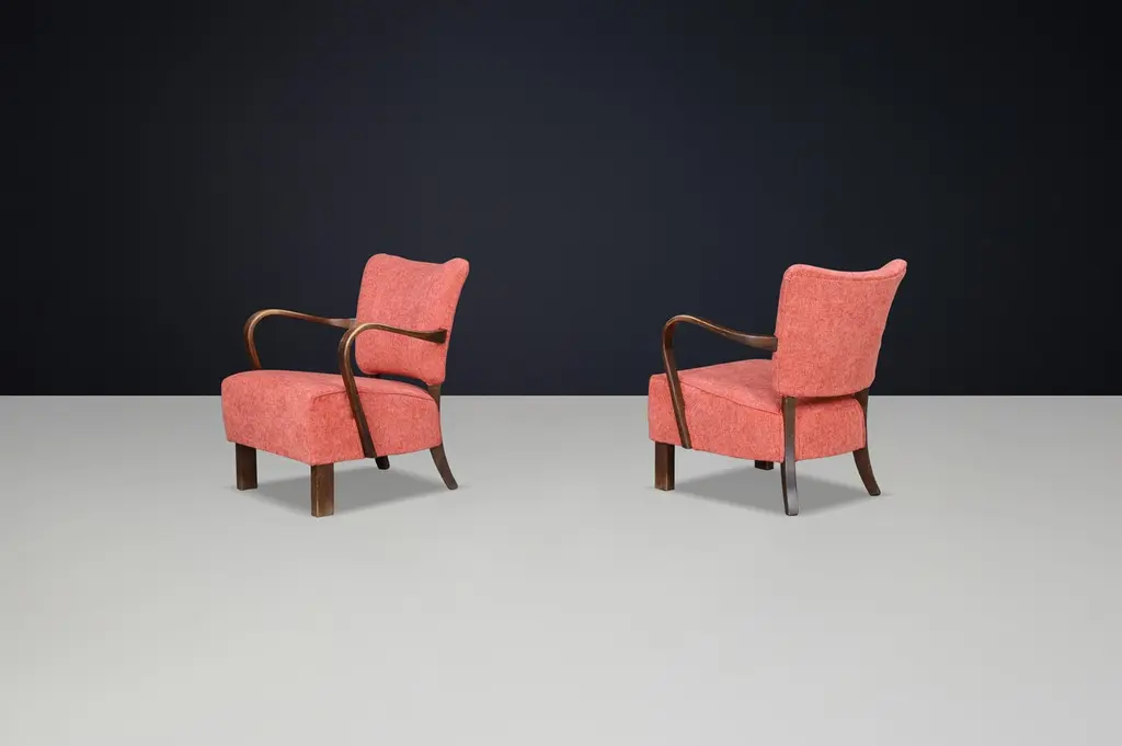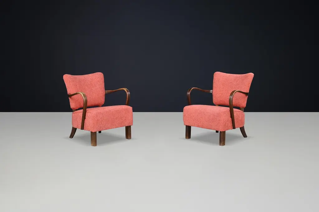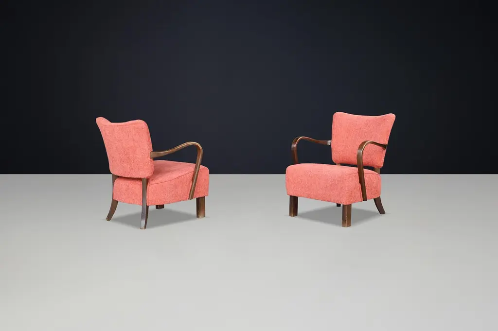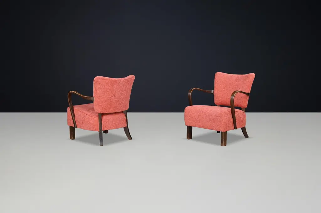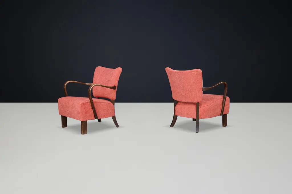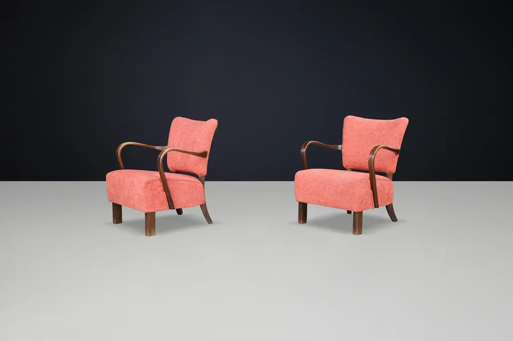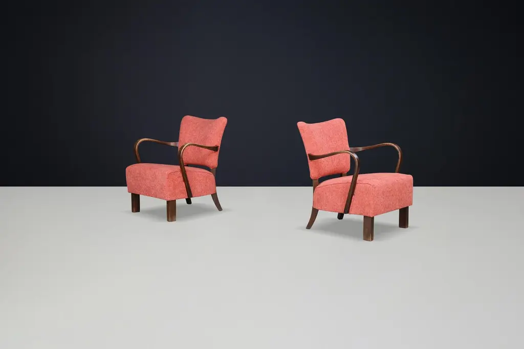 JIndrich Halabala re-upholstered patinated bentwood lounge chairs from the 1930s, Czech Republic.These iconic lounge chairs originate from Czechia and date back to around 1930. They were produced by Thonet and designed by Jindrich Halabala, exemplifying mid-century design in Central Europe. The chairs feature a sleek and uncomplicated geometry that contrasts with the soft, comfortable seat, accentuated by dynamic bentwood elements. Using modernist principles, Halabala crafted a distinctive aesthetic that is passionate, streamlined, and humanistic—ideal for creating inviting and functional domestic spaces. The chairs have been re-upholstered in a comfortable fabric, and like all our upholstered pieces, they can be newly upholstered to suit your specifications. We have many of these armchairs available, making them perfect for interior projects, such as restaurants or hotels. Note: We have over 12 pairs available in their original upholstery, which is ideal for larger projects. About the creator: Jindrich Halabala was born in 1903 in the Czech Republic. He began his career as an apprentice in his father's workshop. After gaining experience and knowledge in woodworking, he studied at the Academy of Applied Arts in Prague. Upon graduating in 1926, he joined Bohumil Hübschmann's studio in Prague and later served as Artistic Director for the UP Company. This company adapted its production processes to align with new consumption trends and mass production. As a result, Halabala assumed new responsibilities, leading to the creation of high-quality furniture that remains competitive with other leading European manufacturers.