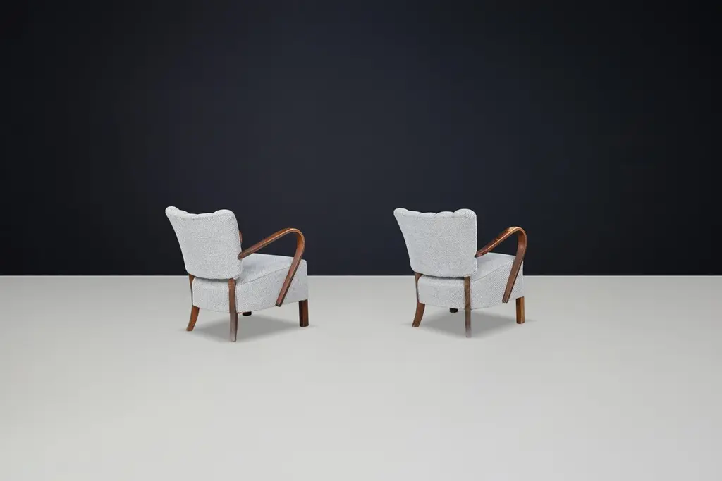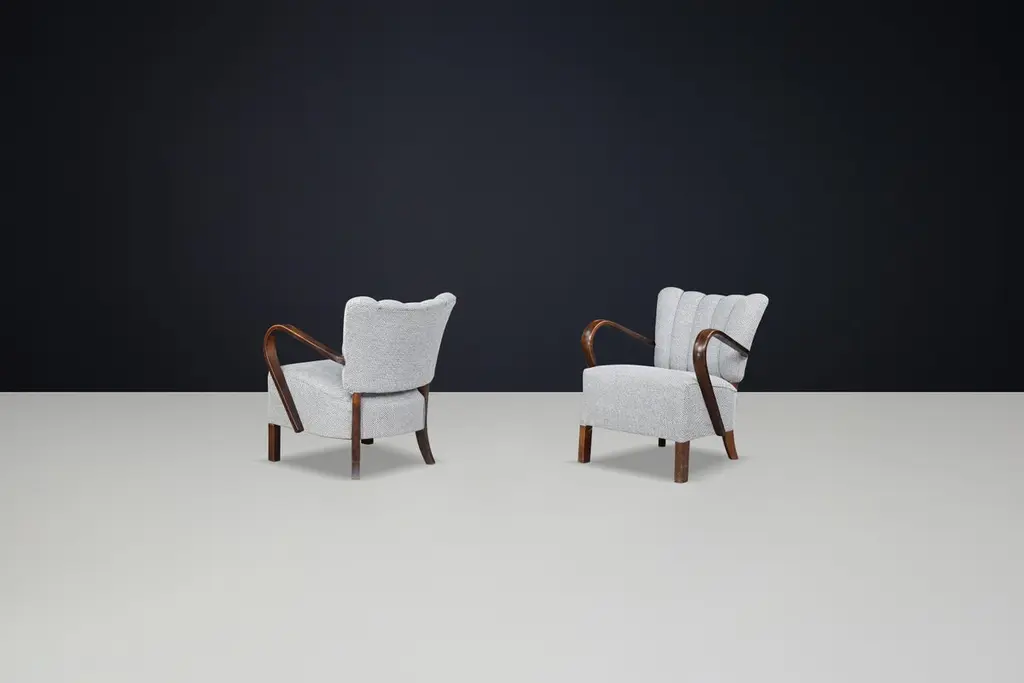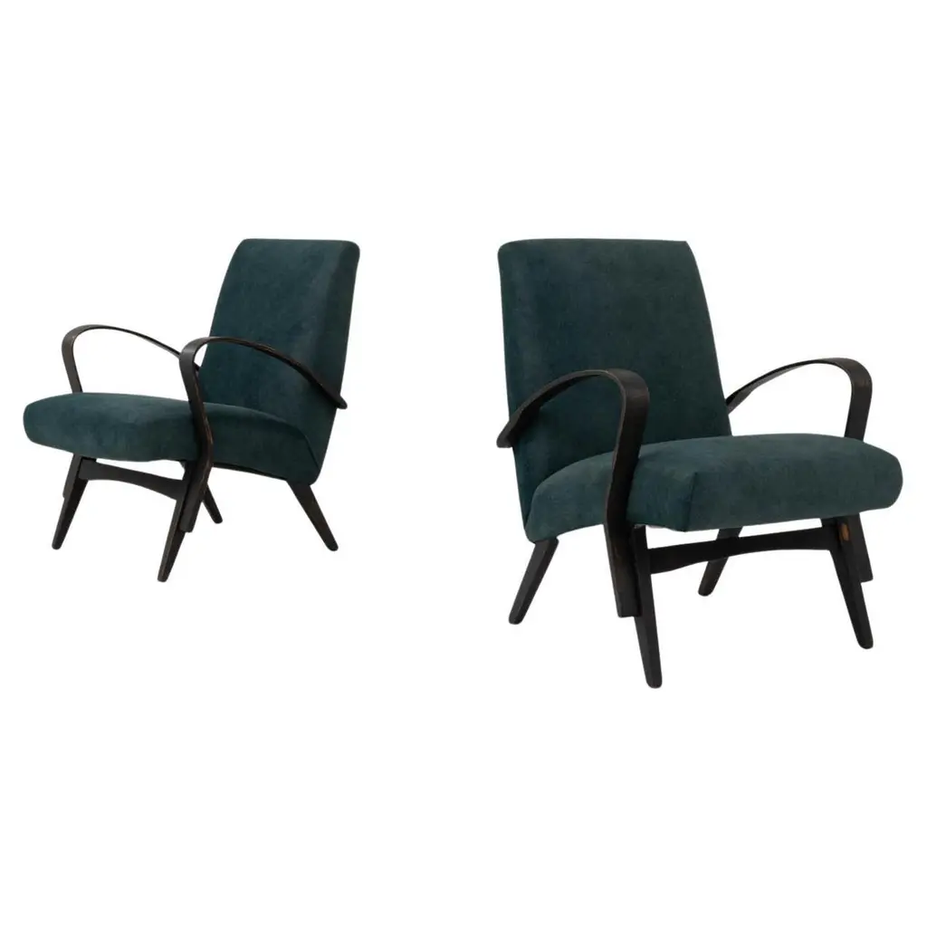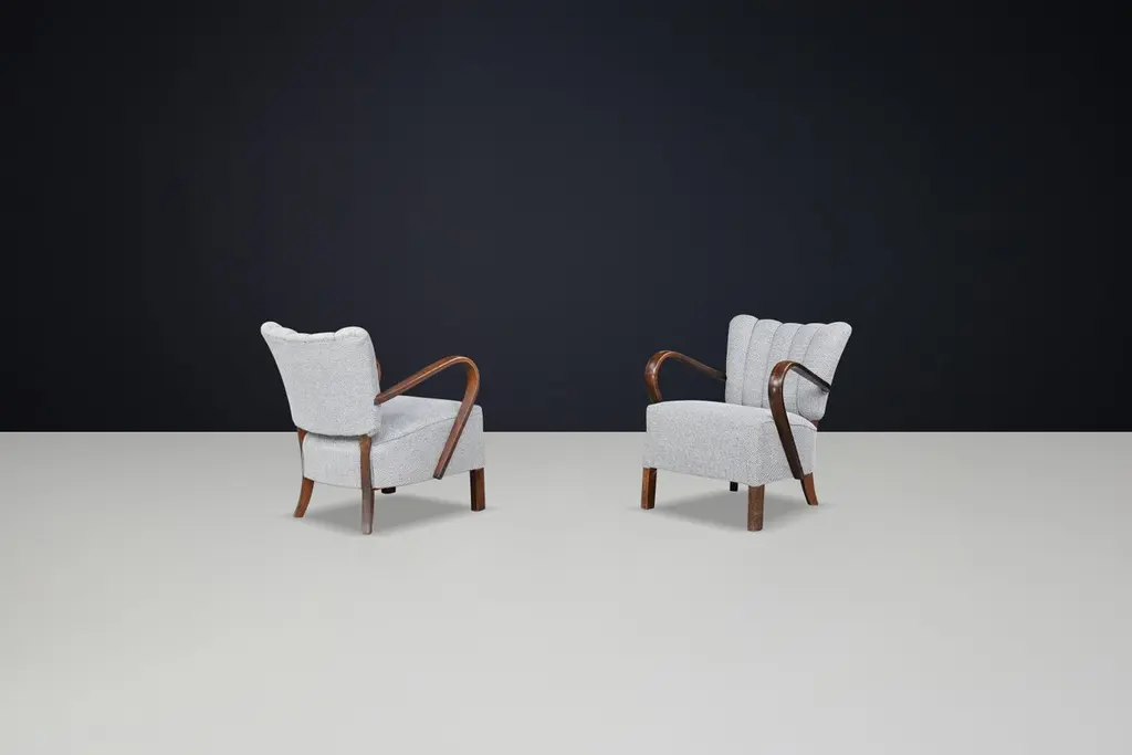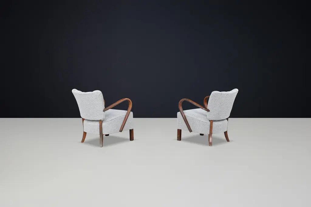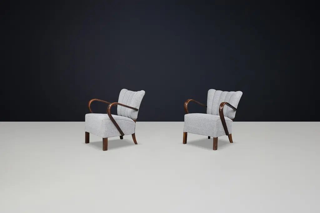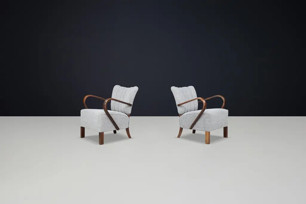 JIndrich Halabala re-upholstered patinated bentwood lounge chairs from the 1930s, Czech Republic.These iconic lounge chairs originate from Czechia and date back to around 1930. They were produced by Thonet and designed by Jindrich Halabala, exemplifying mid-century design in Central Europe. The chairs feature a sleek and uncomplicated geometry that contrasts with the soft, comfortable seat, accentuated by dynamic bentwood elements. Using modernist principles, Halabala crafted a distinctive aesthetic that is passionate, streamlined, and humanistic—ideal for creating inviting and functional domestic spaces. The chairs have been re-upholstered in a comfortable fabric, and like all our upholstered pieces, they can be newly upholstered to suit your specifications. We have many of these armchairs available, making them perfect for interior projects, such as restaurants or hotels. Note: We have over 12 pairs available in their original upholstery, which is ideal for larger projects. About the creator: Jindrich Halabala was born in 1903 in the Czech Republic. He began his career as an apprentice in his father's workshop. After gaining experience and knowledge in woodworking, he studied at the Academy of Applied Arts in Prague. Upon graduating in 1926, he joined Bohumil Hübschmann's studio in Prague and later served as Artistic Director for the UP Company. This company adapted its production processes to align with new consumption trends and mass production. As a result, Halabala assumed new responsibilities, leading to the creation of high-quality furniture that remains competitive with other leading European manufacturers.