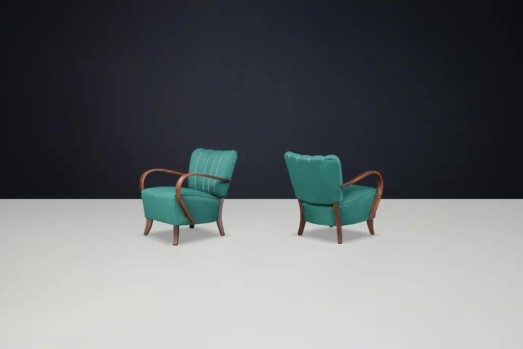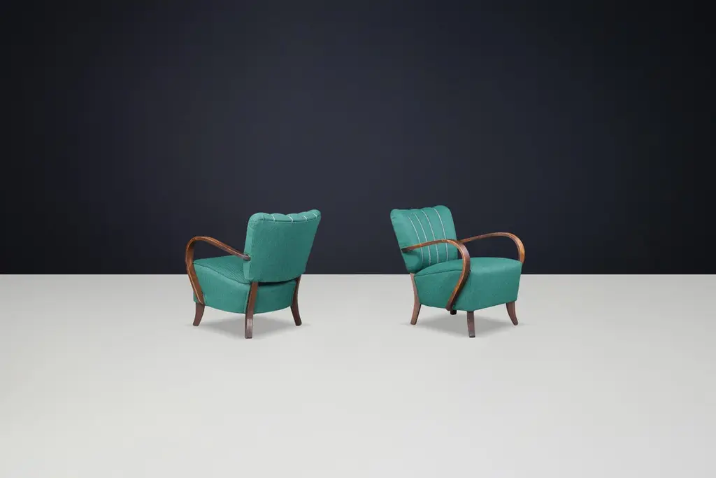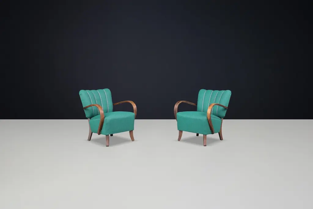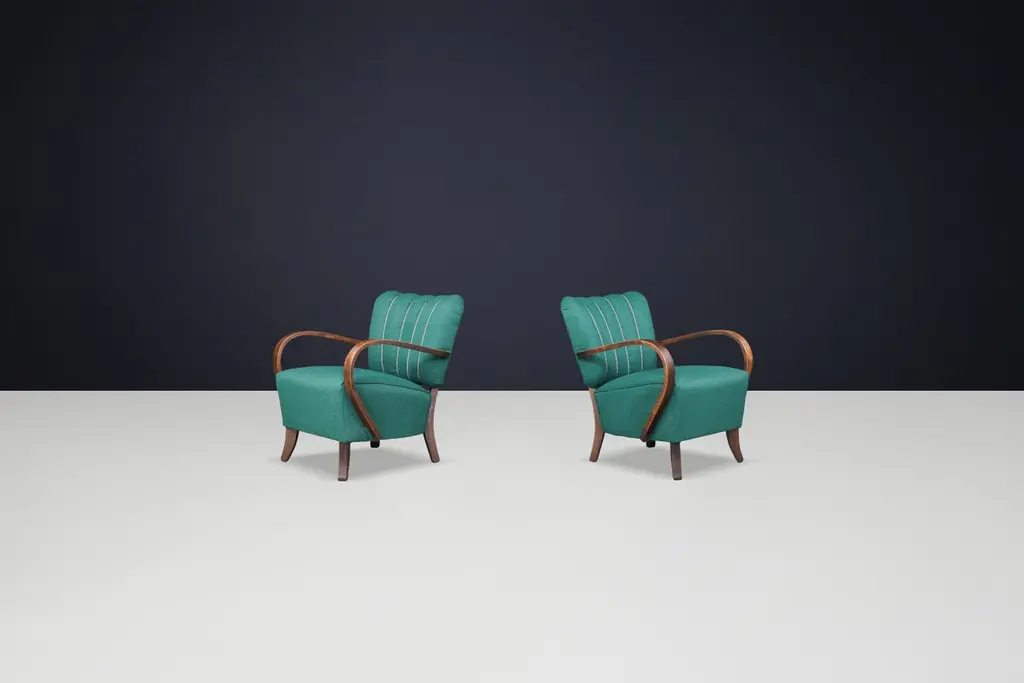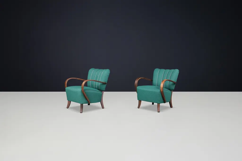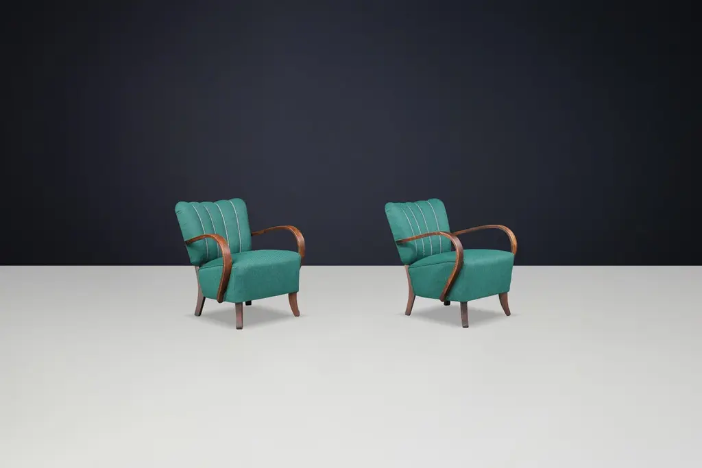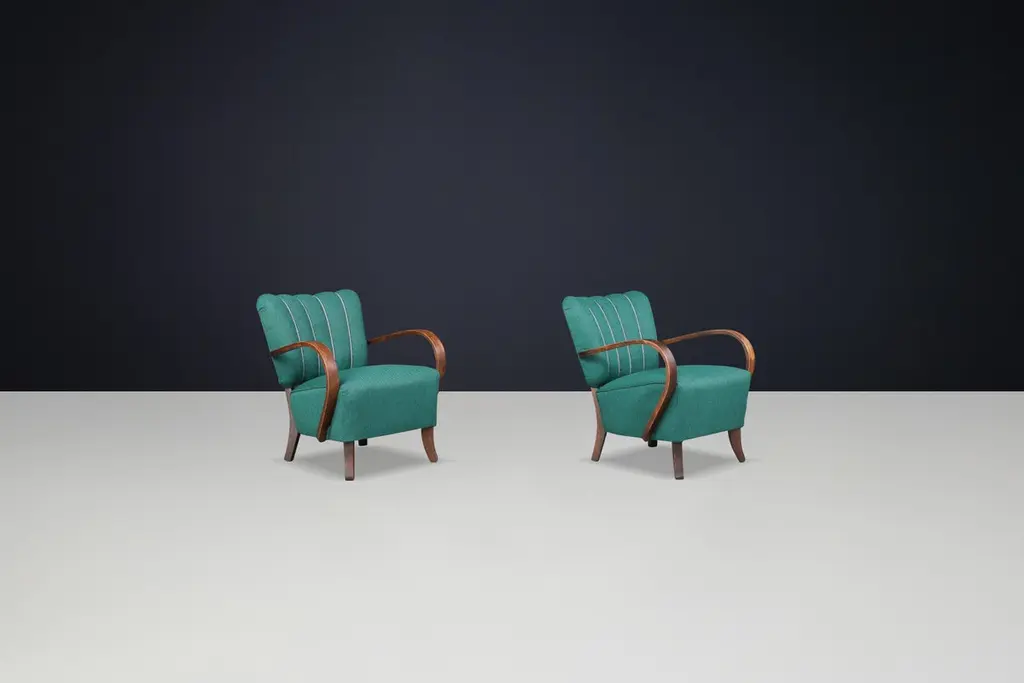 JIndrich Halabala re-upholstered patinated bentwood lounge chairs from the 1930s, Czech Republic.These iconic lounge chairs originate from Czechia and date back to around 1930. They were produced by Thonet and designed by Jindrich Halabala, exemplifying mid-century design in Central Europe. The chairs feature a sleek and uncomplicated geometry that contrasts with the soft, comfortable seat, accentuated by dynamic bentwood elements. Using modernist principles, Halabala crafted a distinctive aesthetic that is passionate, streamlined, and humanistic—ideal for creating inviting and functional domestic spaces. The chairs have been re-upholstered in a comfortable fabric, and like all our upholstered pieces, they can be newly upholstered to suit your specifications. We have many of these armchairs available, making them perfect for interior projects, such as restaurants or hotels. Note: We have over 12 pairs available in their original upholstery, which is ideal for larger projects. About the creator: Jindrich Halabala was born in 1903 in the Czech Republic. He began his career as an apprentice in his father's workshop. After gaining experience and knowledge in woodworking, he studied at the Academy of Applied Arts in Prague. Upon graduating in 1926, he joined Bohumil Hübschmann's studio in Prague and later served as Artistic Director for the UP Company. This company adapted its production processes to align with new consumption trends and mass production. As a result, Halabala assumed new responsibilities, leading to the creation of high-quality furniture that remains competitive with other leading European manufacturers.