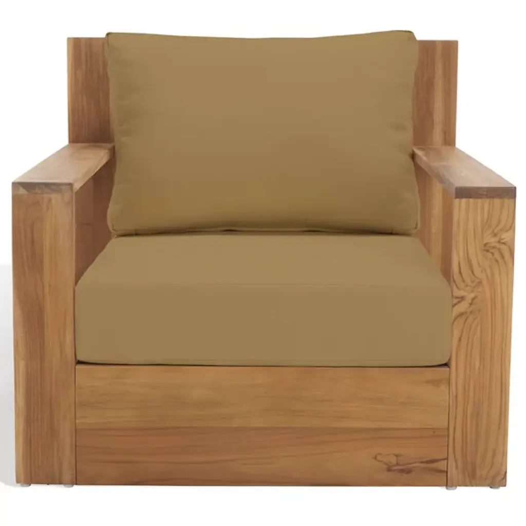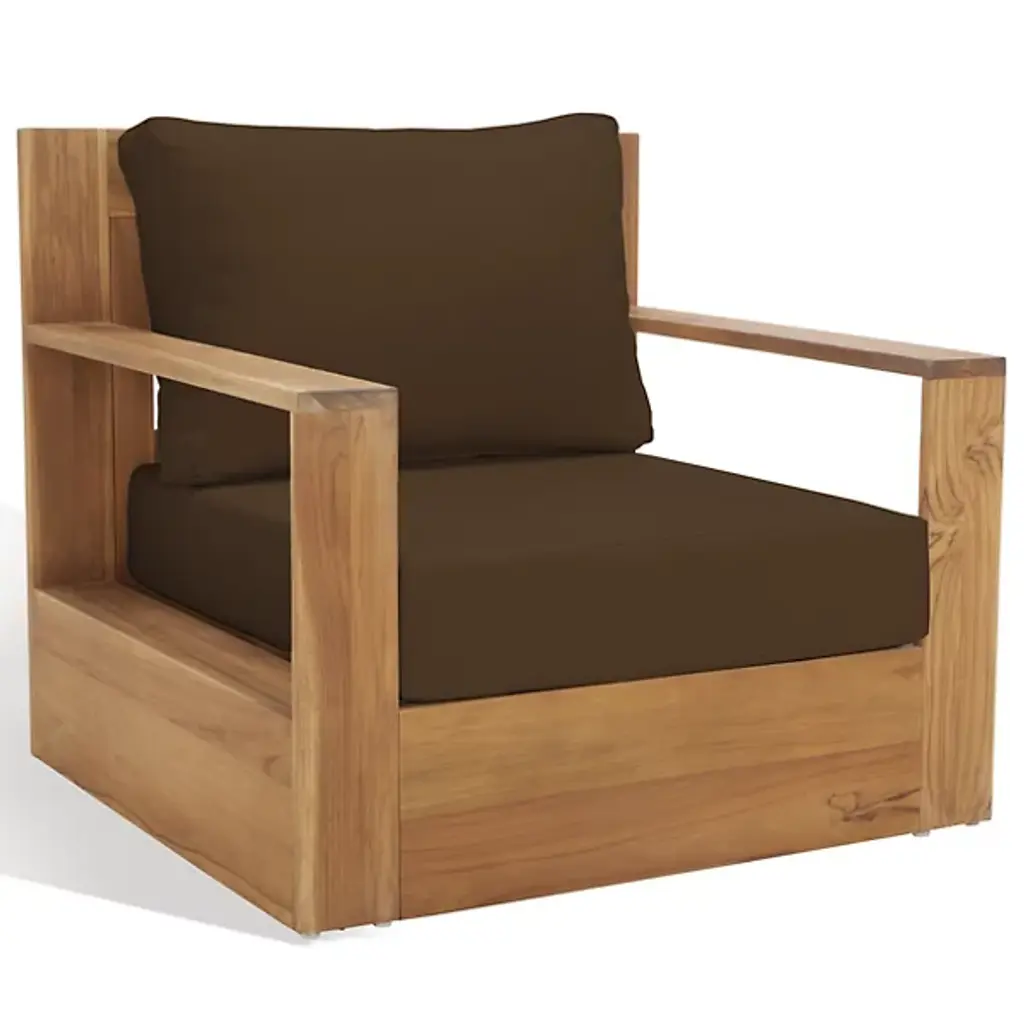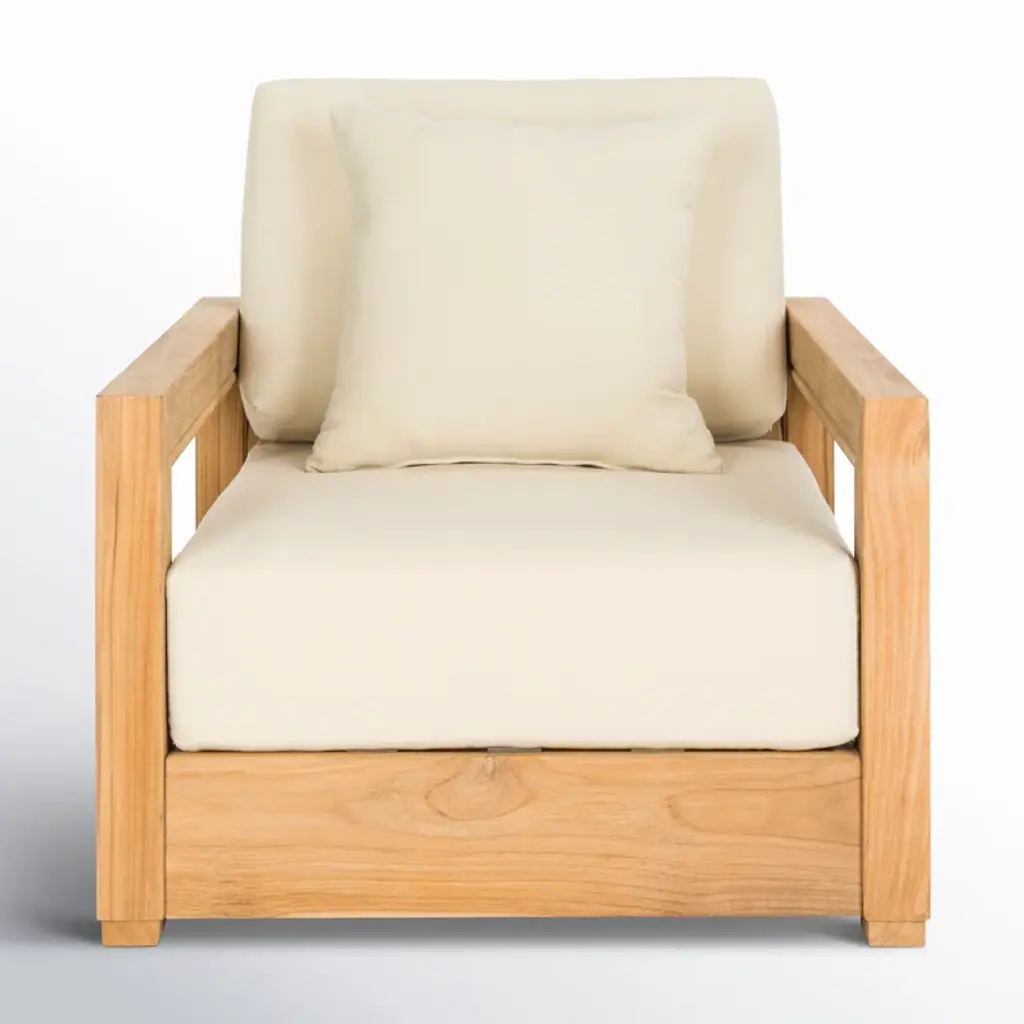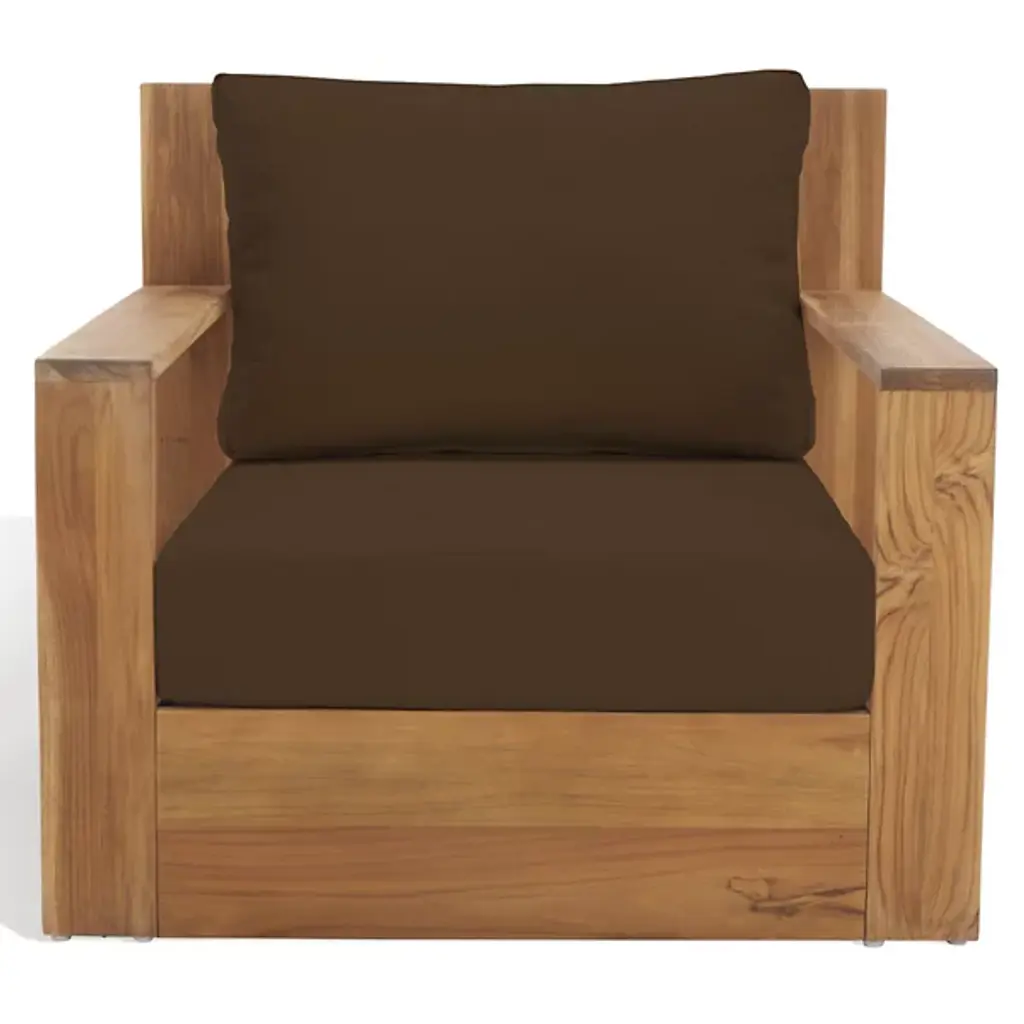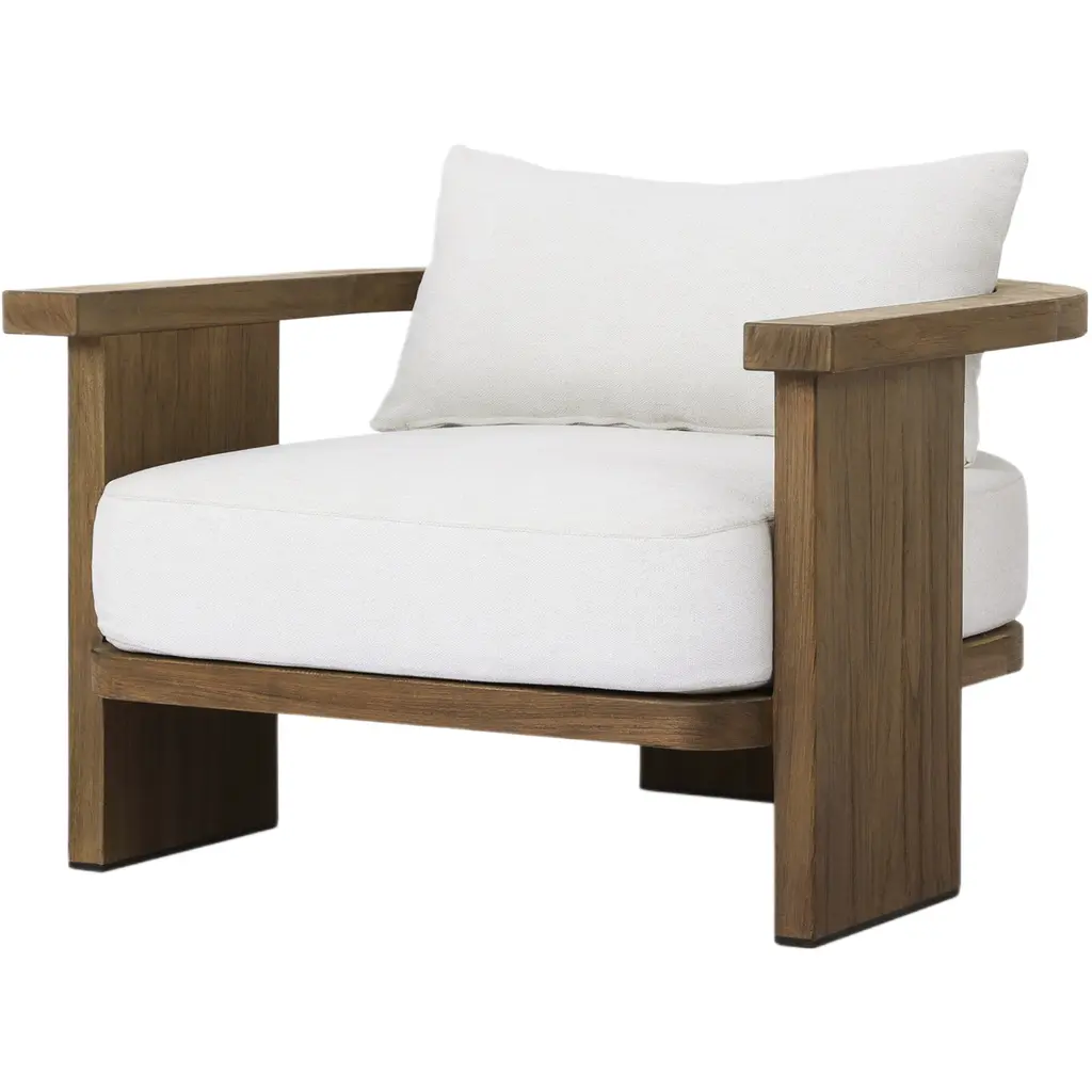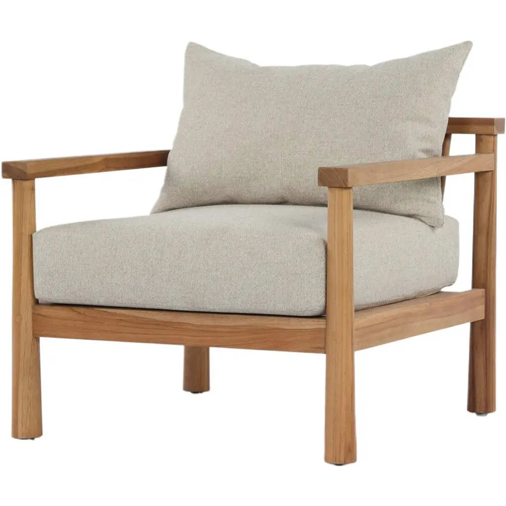 The Juaneta Brazilian Teak Outdoor Lounge Chair from Alder & Ore uses open-frame construction to maximize air circulation. The Brazilian teak structure ages gracefully while maintaining its structural integrity through changing seasons. Plush polyurethane foam cushions cradle you in comfort, supported by the precise angles of the chair's frame. The combination of natural wood and versatile upholstery creates an inviting spot for outdoor relaxation, whether you're reading in the morning sun or unwinding after sunset.