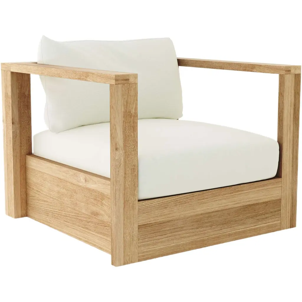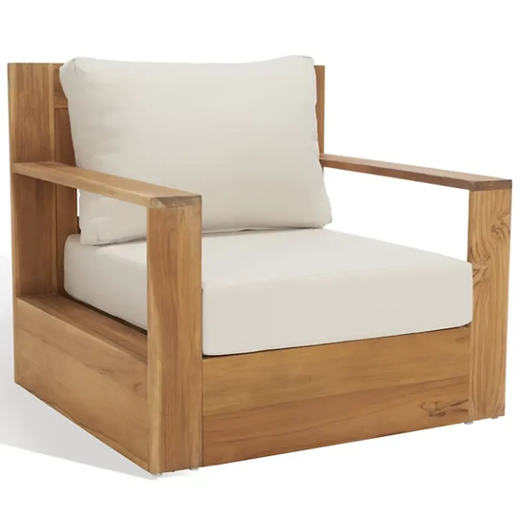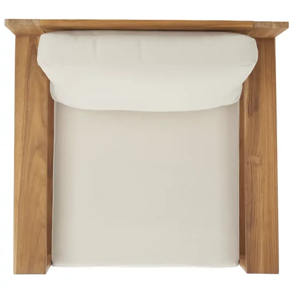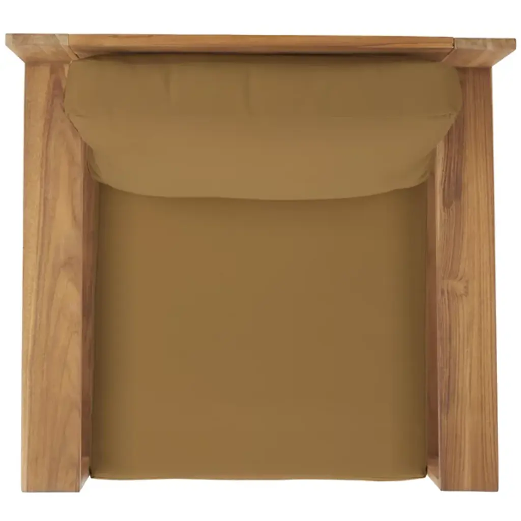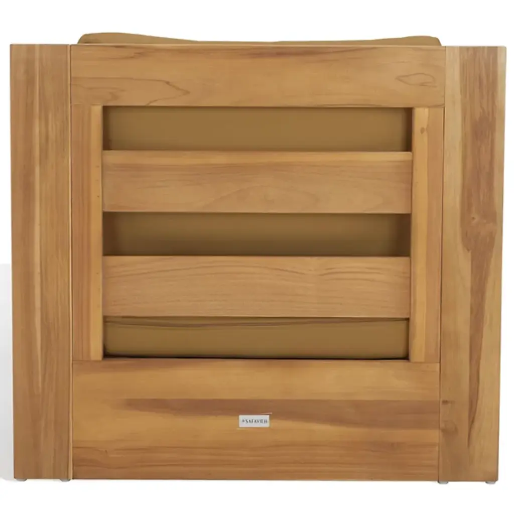 The Juaneta Brazilian Teak Outdoor Lounge Chair from Alder & Ore uses open-frame construction to maximize air circulation. The Brazilian teak structure ages gracefully while maintaining its structural integrity through changing seasons. Plush polyurethane foam cushions cradle you in comfort, supported by the precise angles of the chair's frame. The combination of natural wood and versatile upholstery creates an inviting spot for outdoor relaxation, whether you're reading in the morning sun or unwinding after sunset.
