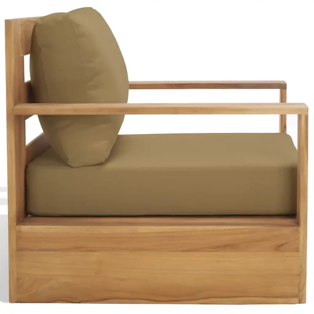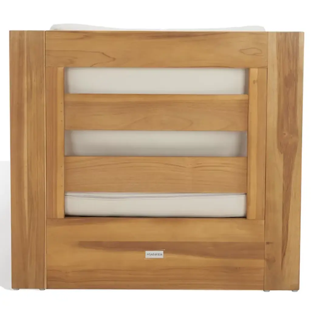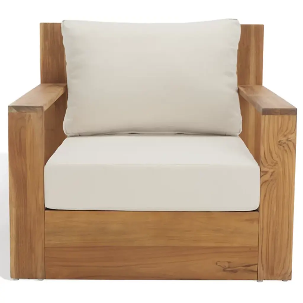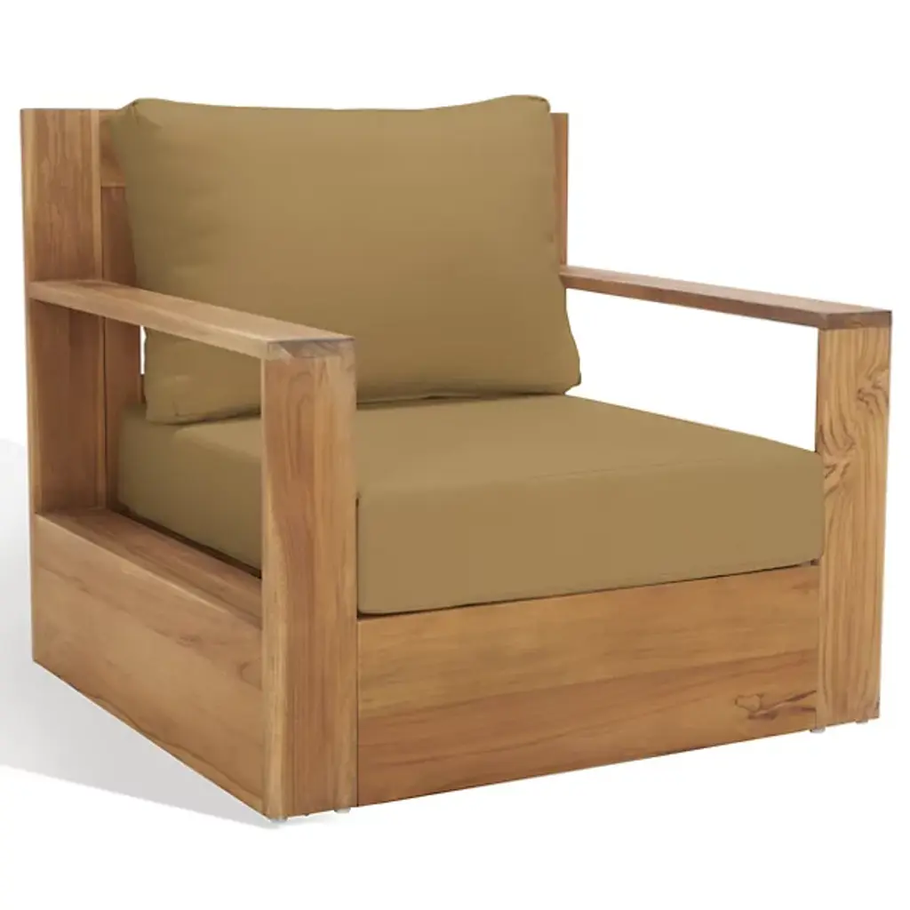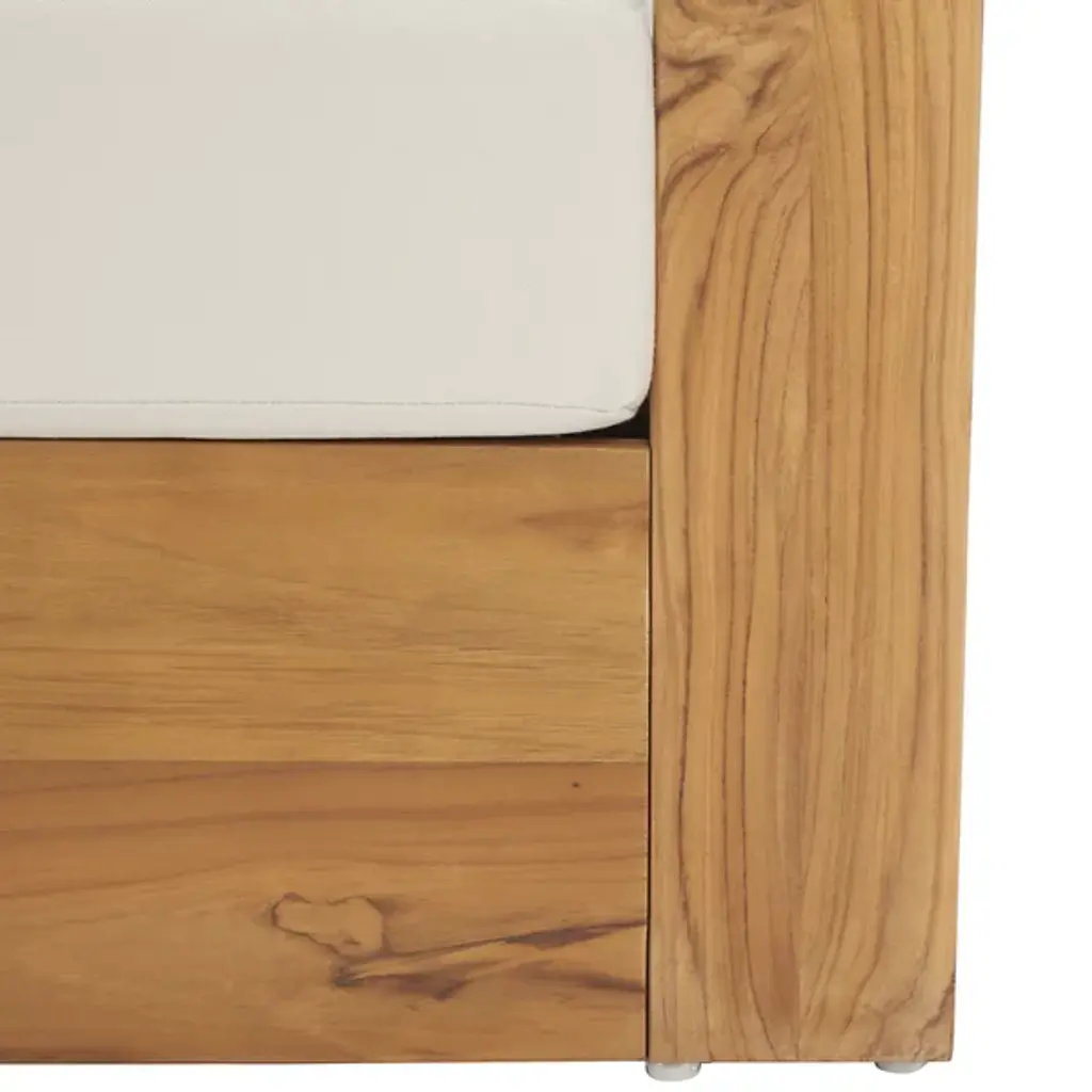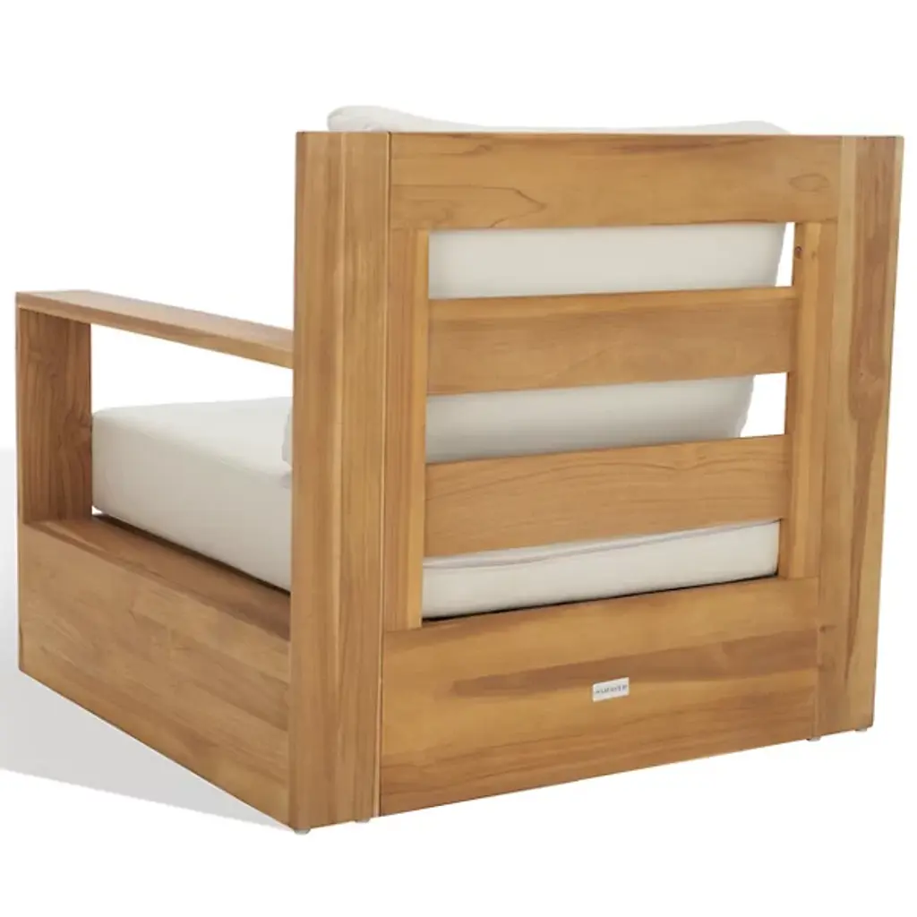 The Juaneta Brazilian Teak Outdoor Lounge Chair from Alder & Ore uses open-frame construction to maximize air circulation. The Brazilian teak structure ages gracefully while maintaining its structural integrity through changing seasons. Plush polyurethane foam cushions cradle you in comfort, supported by the precise angles of the chair's frame. The combination of natural wood and versatile upholstery creates an inviting spot for outdoor relaxation, whether you're reading in the morning sun or unwinding after sunset.