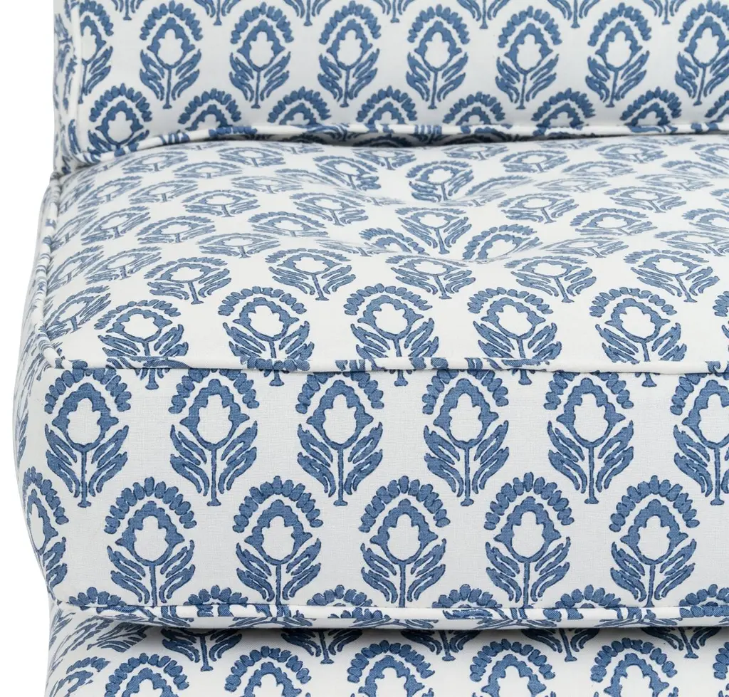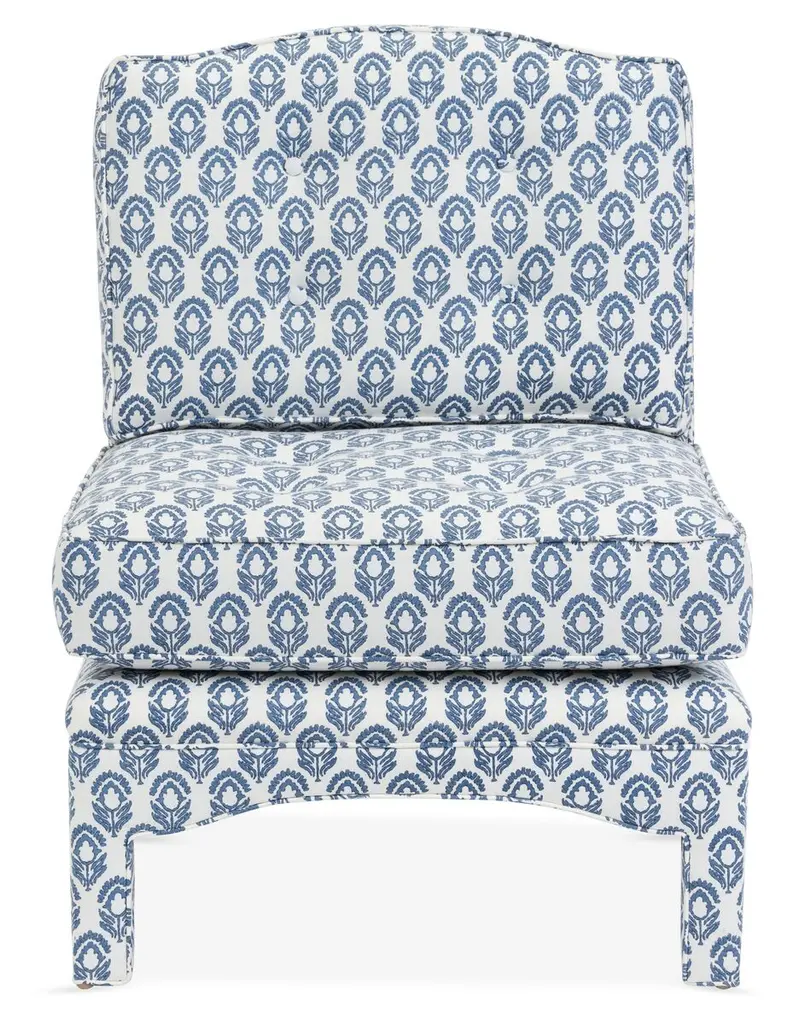 Designed by us and available only at One Kings Lane: Pretty as a picture and perfect for the living room, bedroom, or powder room, this tufted pillow-top slipper chair is fully upholstered with a self-welt and buttons. Its semi-attached cushions are filled with foam for plush comfort. Made in California.
