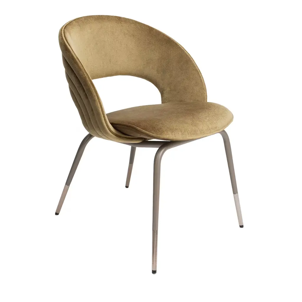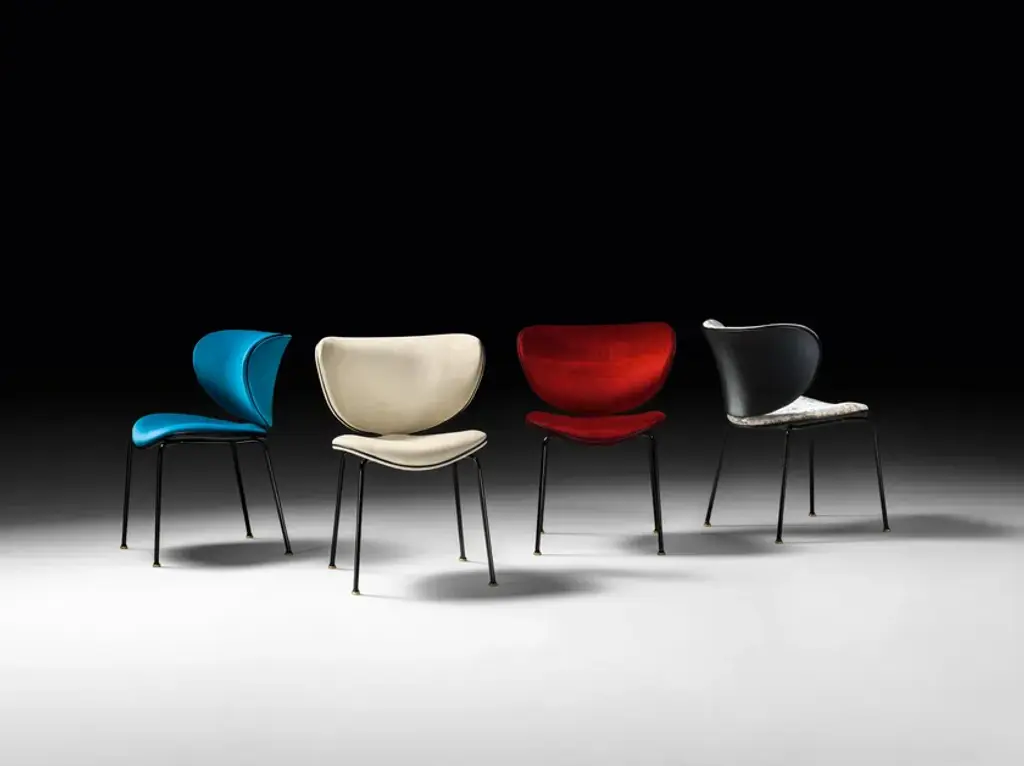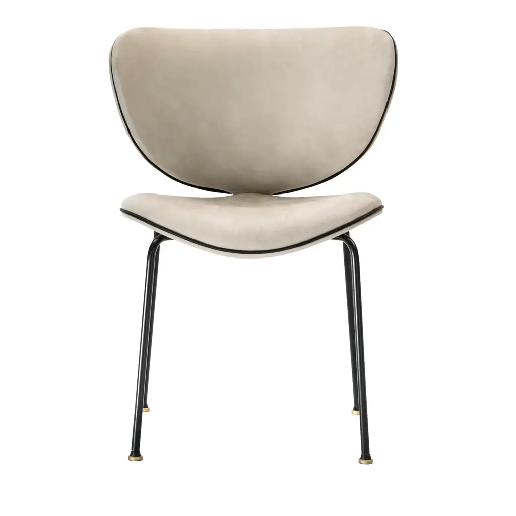 Kalida is a leather chair. Leather: Denim col. 31.Base in matt black-varnished metal rod. Seat, back in curved beech wood, padding in high-resilience expanded polyurethane. Metal glides and armrest (optional) in polished gold finishing. Non removable cover.The skilful design of the Kalida seating system becomes a chair, that stands out for its elegant informality. The distinctive mark of the black painted legs is enhanced by the foot in a polished gold finishing. The armrest element (optional) accommodates the backrest with a wide and distinctive gesture, to give further comfort to an object that knows how to stand out in a contract, business or home situation. The care for fabric combinations is the signature of Black Tie style.Kalida is not just a chair: it is a seating system making style and lightness functional. Everything starts from the sign: the backrest is skilfully designed, in a golden proportion that combines beauty and absolute comfort. The matt steel legs are graceful and light: the elegant foot in a polished gold finishing, coordinated with the optional armrest, transforms Kalida into an informal chair with a refined character.