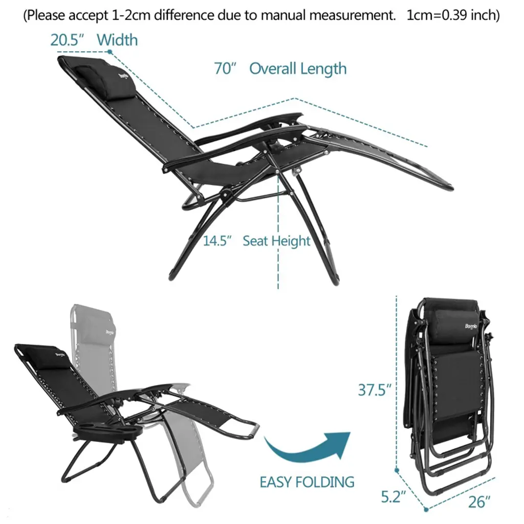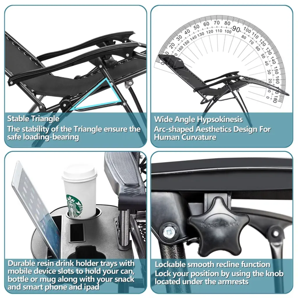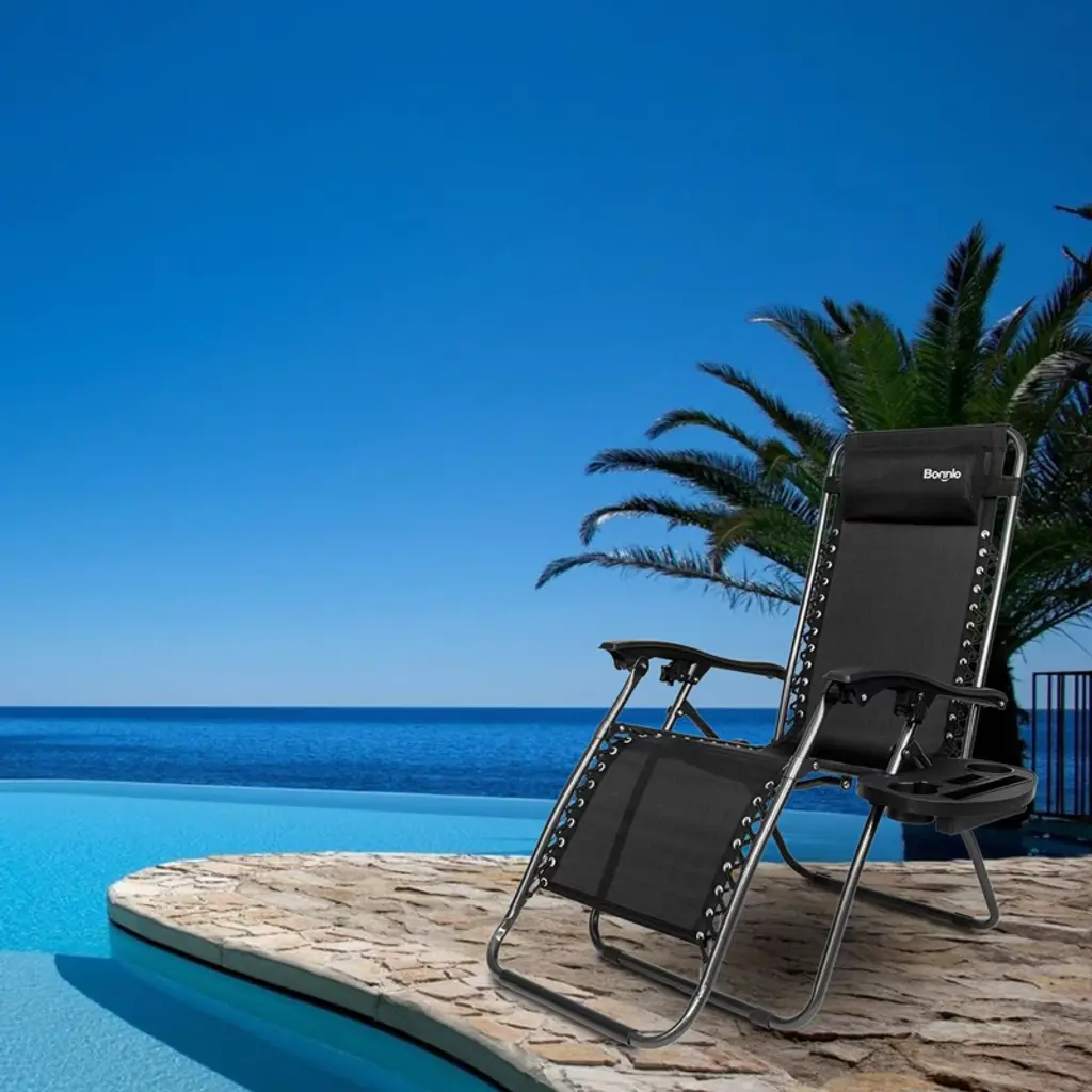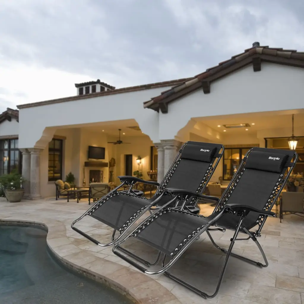 These anti-gravity chairs set of 2 are perfect for relaxing on the patio, at the beach or reclining outdoors in the yard. Designed with comfort in mind, these reclining lounge chairs are made from all-weather fade-resistant textilene sling fabric. The bungee cords that connect the textilene seat to the sturdy steel frame help to enhance the comfort and function of the chair.
