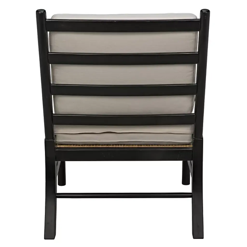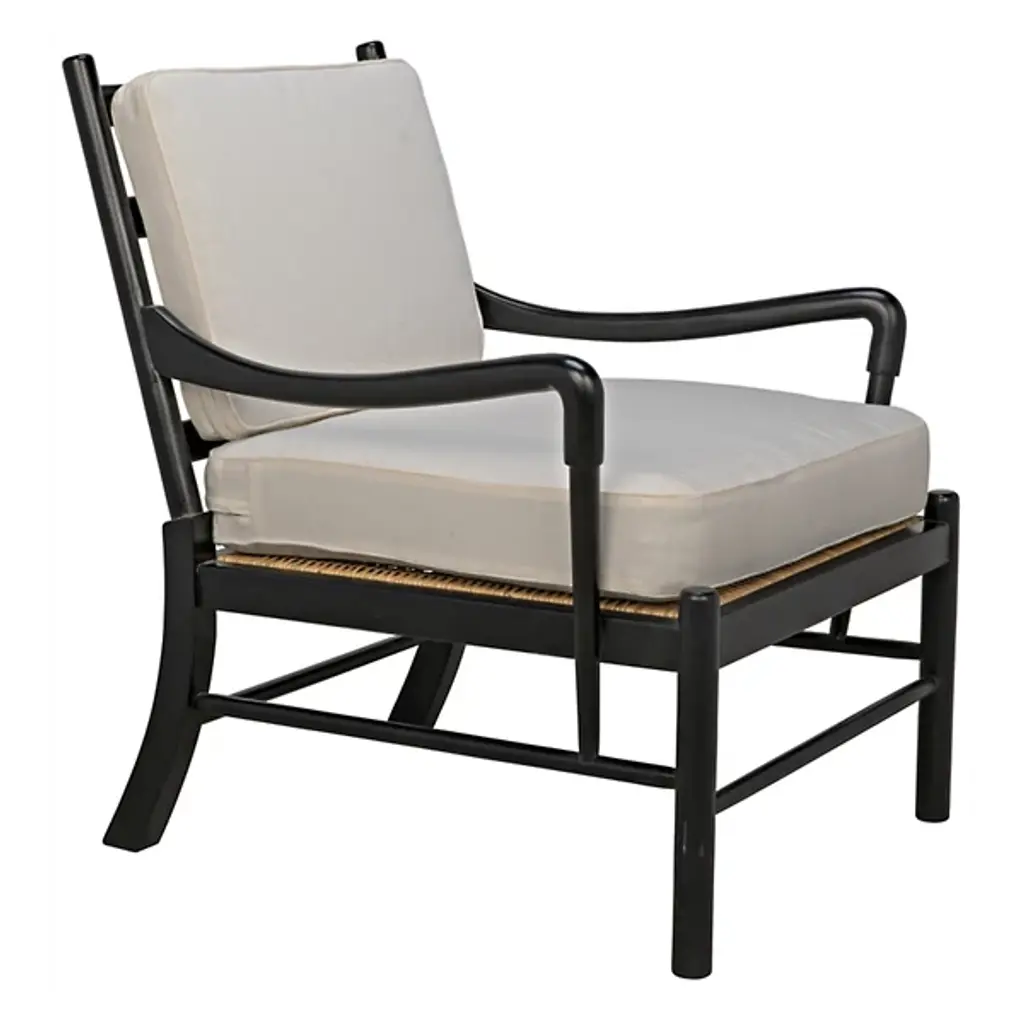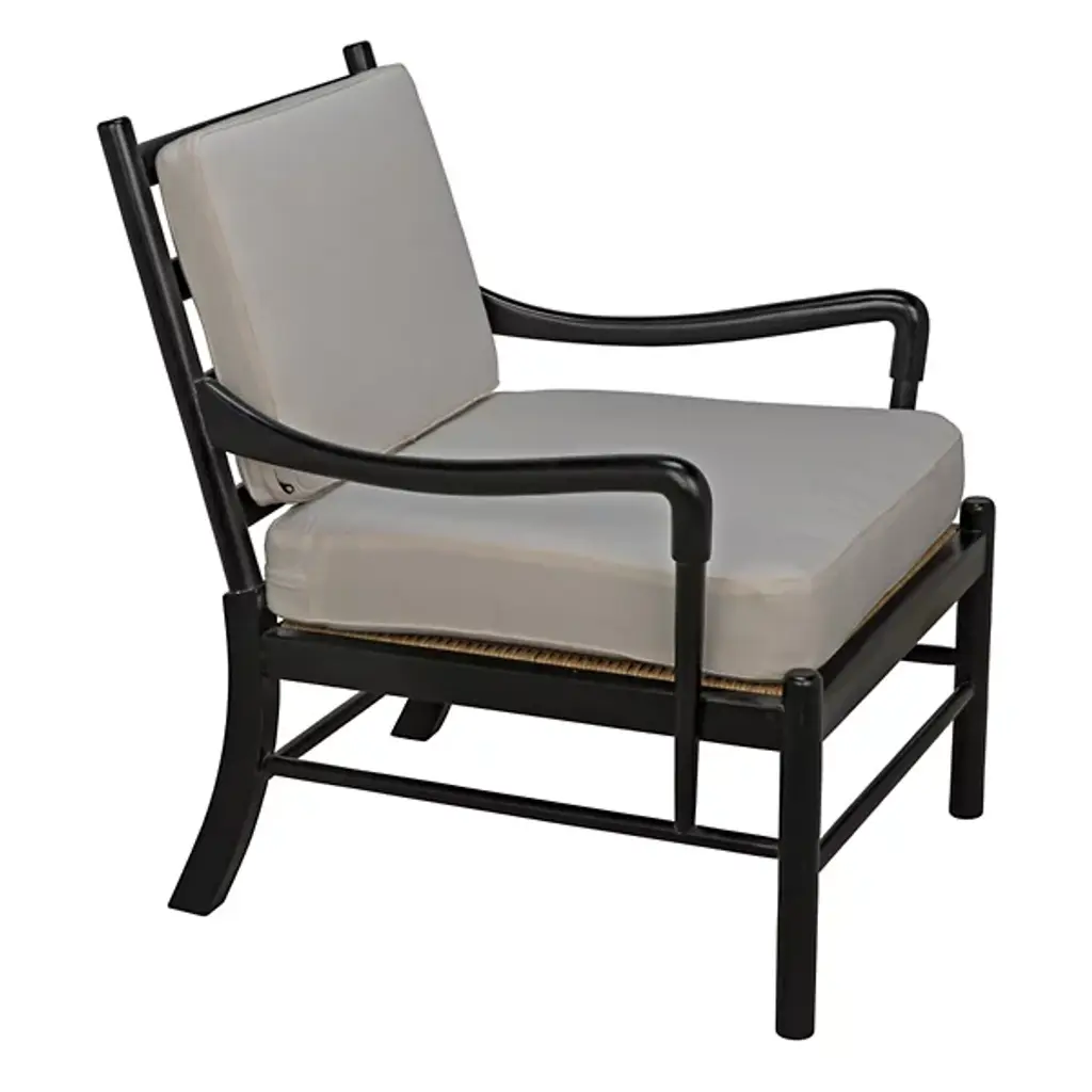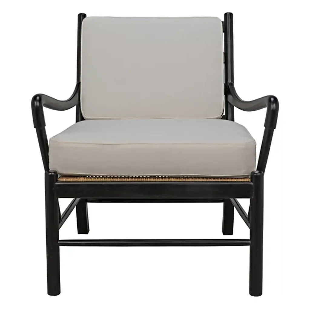The Kevin Lounge Chair from Noir provides classic comfort with a smooth appeal. A sleek mahogany frame ascending from four smooth legs rises to a swirl of an armrest on either side, nestling soft, removable seat and back cushions inside. The chair’s natural rattan base offers an artisanal elegance, supporting while staying light, and the fine weave of each cushion contrasts well with the smoothly polished wood that surrounds them.