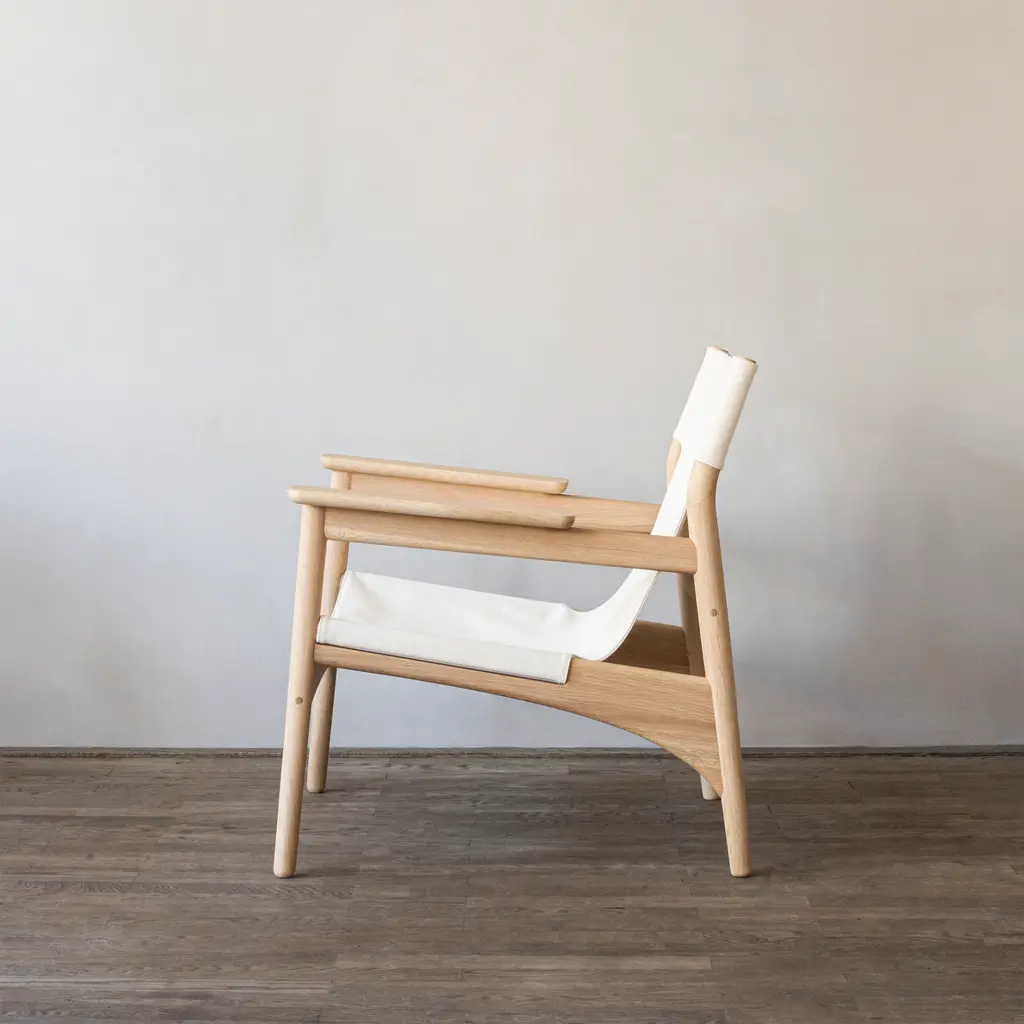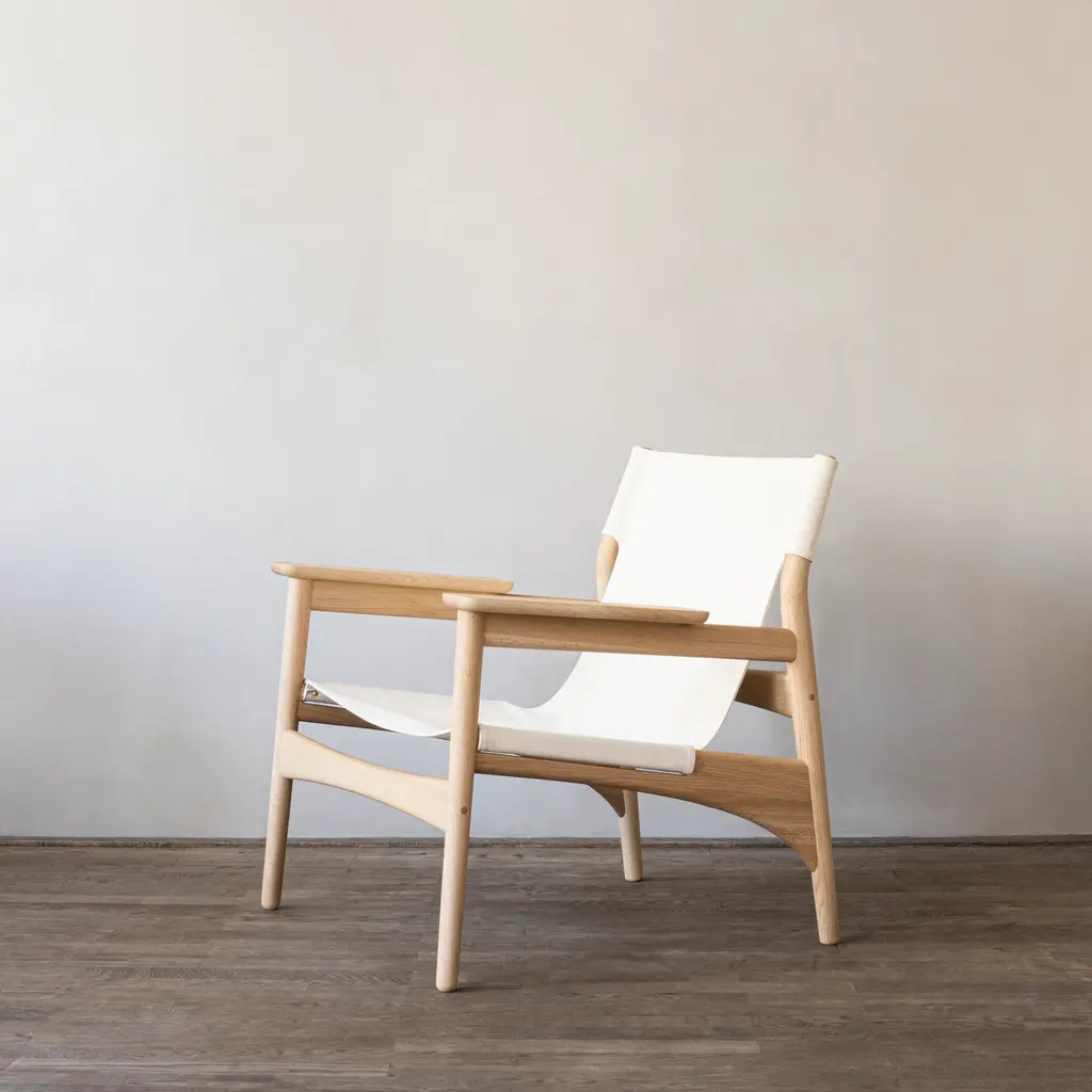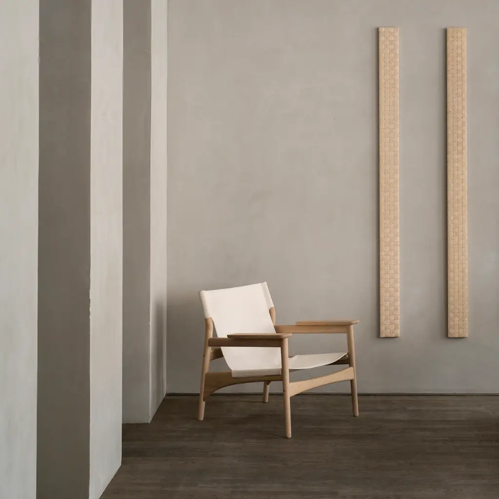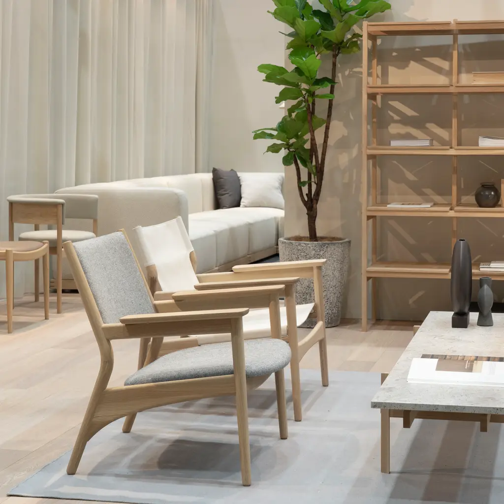This version of Kinuta has the same basic construction as its upholstered relative N-LC01, but with a free-hanging seat in either leather or canvas that comfortably conforms to the shape of the sitter. Inspired by its namesake Tokyo’s ‘80s-era apartments with an open-air courtyard, the seating concept also references traditional safari chairs. With Karimoku Case's exceptional craftsmanship at its heart, the solid-oak frame also features a sleek angled backrest and the series' comfortably wide armrests.