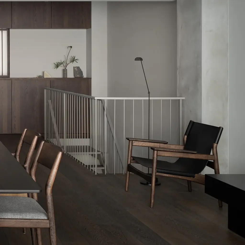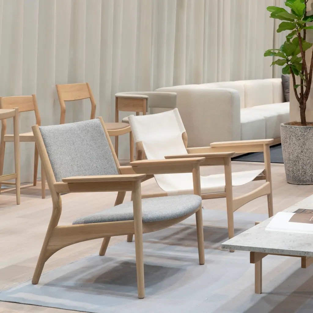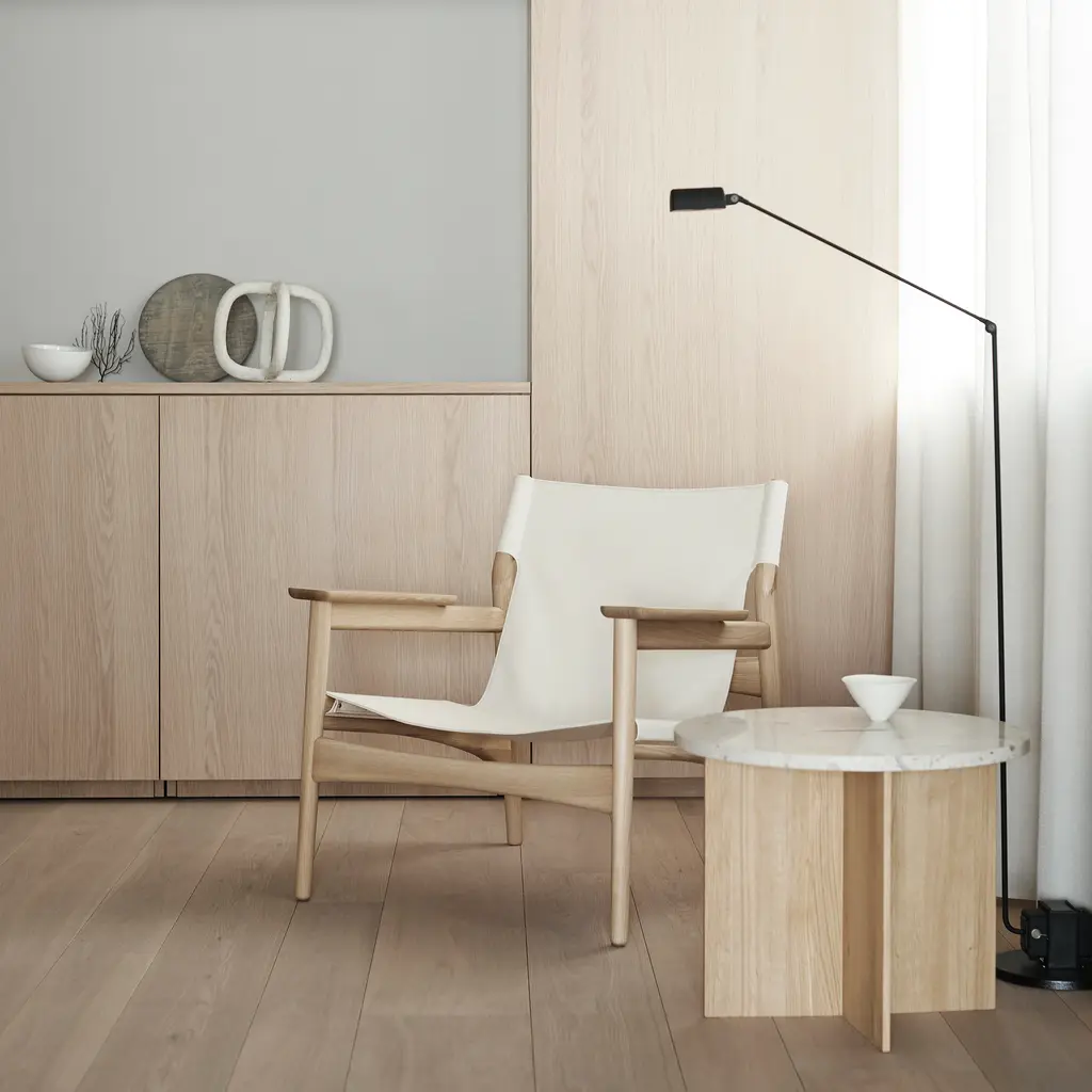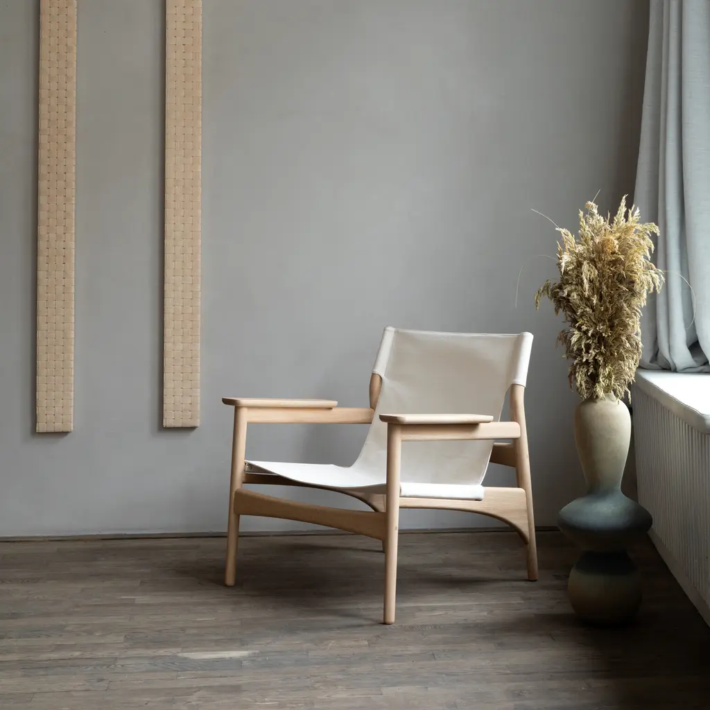 This version of Kinuta has the same basic construction as its upholstered relative N-LC01, but with a free-hanging seat in either leather or canvas that comfortably conforms to the shape of the sitter. Inspired by its namesake Tokyo’s ‘80s-era apartments with an open-air courtyard, the seating concept also references traditional safari chairs. With Karimoku Case's exceptional craftsmanship at its heart, the solid-oak frame also features a sleek angled backrest and the series' comfortably wide armrests.