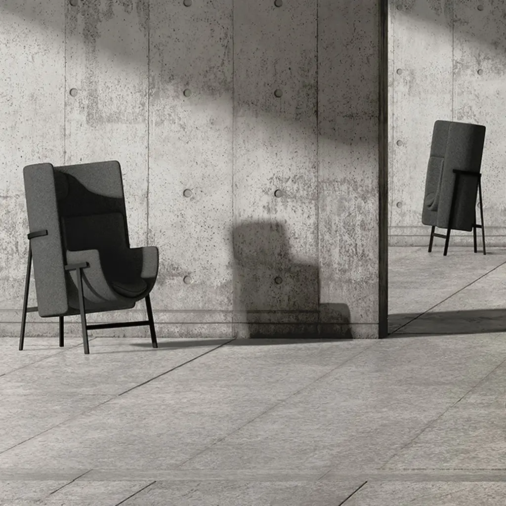 An armchair designed for common spaces in offices and hotels. There are numerous armchairs and sofas for lobbies and lounges, but those for narrow spaces such as corridors, elevator lobbies, and entrances are difficult to find. Therefore, a compact chair was devised to fit in those niches, for passersby to rest in for a spell or in which to have casual conversation. Attempts to make an armchair small normally leads one to think of gradual elimination of the backrest to create a bench-like furniture piece. But casting the backrest as the star to which the seat is adjoined yields a design less about sitting and more about leaning against a grand backrest. Such a design takes up minimal space while offering to the chair's occupant a bit of calm and security. The backrest and seat are independent parts, with shallow and deep seats and lower and taller backs available for use in combination according to the size of the space and degree of privacy desired.