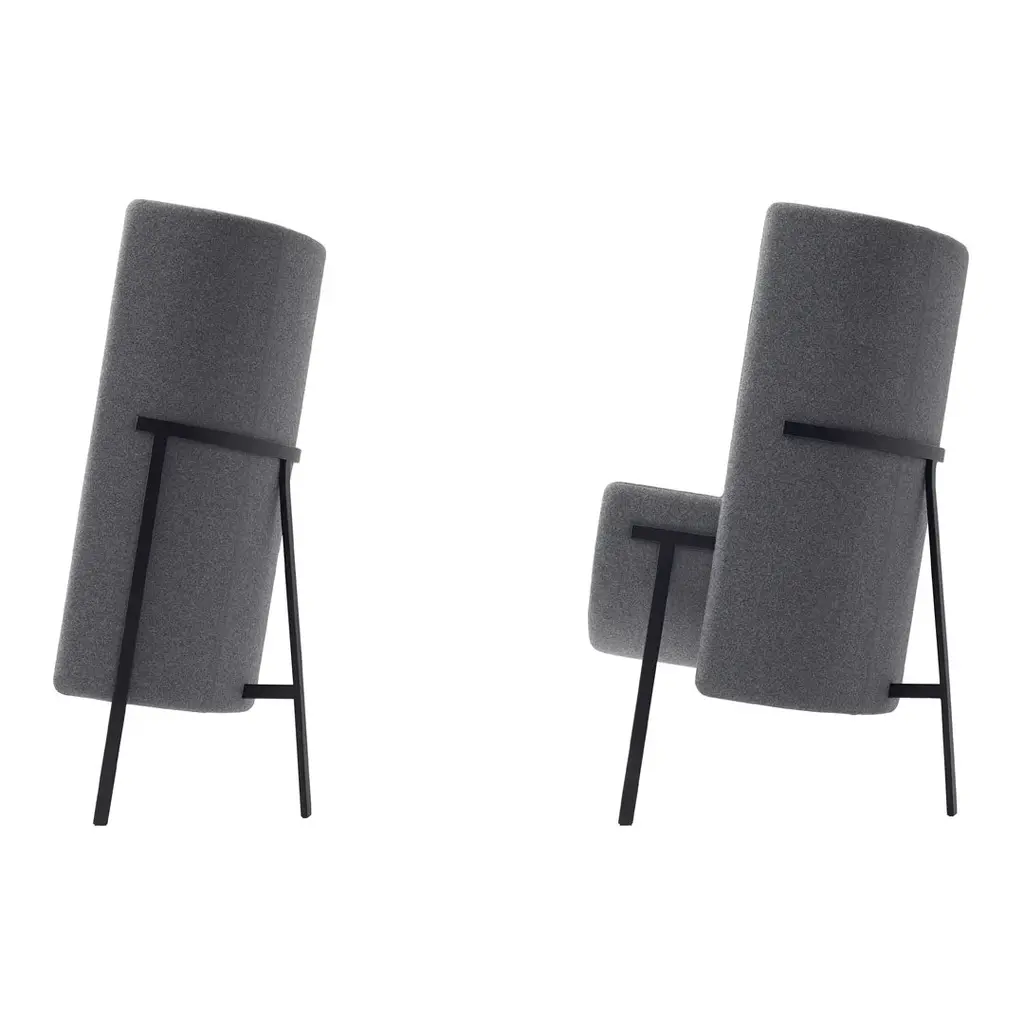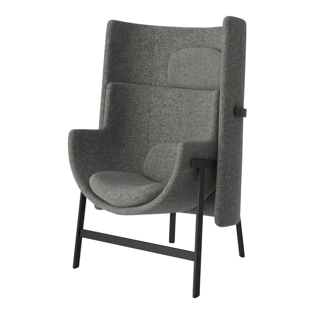 An armchair designed for common spaces in offices and hotels. There are numerous armchairs and sofas for lobbies and lounges, but those for narrow spaces such as corridors, elevator lobbies, and entrances are difficult to find. Therefore, a compact chair was devised to fit in those niches, for passersby to rest in for a spell or in which to have casual conversation. Attempts to make an armchair small normally leads one to think of gradual elimination of the backrest to create a bench-like furniture piece. But casting the backrest as the star to which the seat is adjoined yields a design less about sitting and more about leaning against a grand backrest. Such a design takes up minimal space while offering to the chair's occupant a bit of calm and security. The backrest and seat are independent parts, with shallow and deep seats and lower and taller backs available for use in combination according to the size of the space and degree of privacy desired.