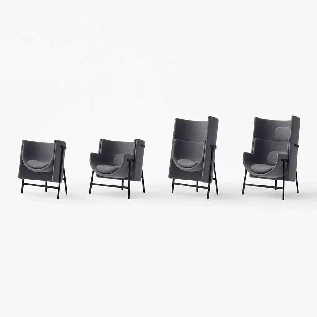 An armchair designed for common spaces in offices and hotels. There are numerous armchairs and sofas for lobbies and lounges, but those for narrow spaces such as corridors, elevator lobbies, and entrances are difficult to find. Therefore, a compact chair was devised to fit in those niches, for passersby to rest in for a spell or in which to have casual conversation. Attempts to make an armchair small normally leads one to think of gradual elimination of the backrest to create a bench-like furniture piece. But casting the backrest as the star to which the seat is adjoined yields a design less about sitting and more about leaning against a grand backrest. Such a design takes up minimal space while offering to the chair's occupant a bit of calm and security. The backrest and seat are independent parts, with shallow and deep seats and lower and taller backs available for use in combination according to the size of the space and degree of privacy desired.