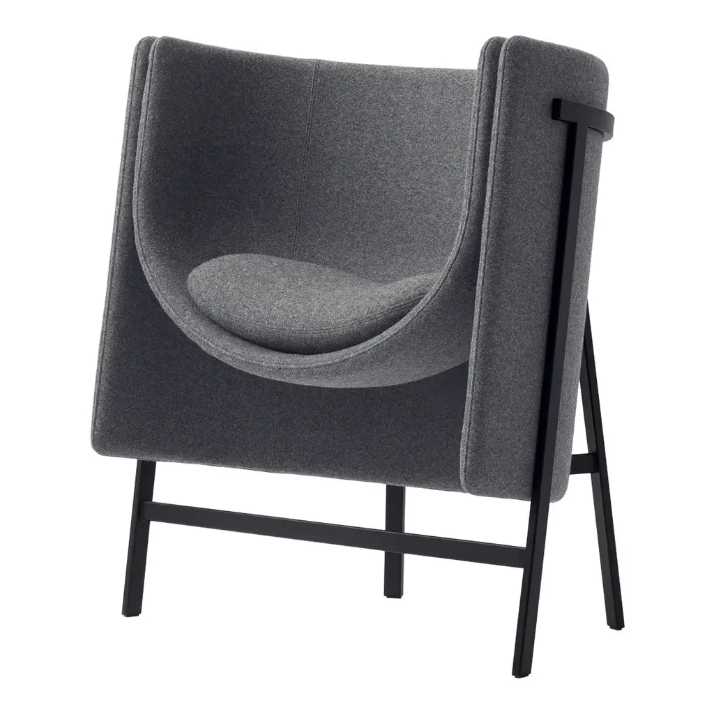 An armchair designed for common spaces in offices and hotels. There are numerous armchairs and sofas for lobbies and lounges, but those for narrow spaces such as corridors, elevator lobbies, and entrances are difficult to find. Therefore, a compact chair was devised to fit in those niches, for passersby to rest in for a spell or in which to have casual conversation. Attempts to make an armchair small normally leads one to think of gradual elimination of the backrest to create a bench-like furniture piece. But casting the backrest as the star to which the seat is adjoined yields a design less about sitting and more about leaning against a grand backrest. Such a design takes up minimal space while offering to the chair's occupant a bit of calm and security. The backrest and seat are independent parts, with shallow and deep seats and lower and taller backs available for use in combination according to the size of the space and degree of privacy desired.