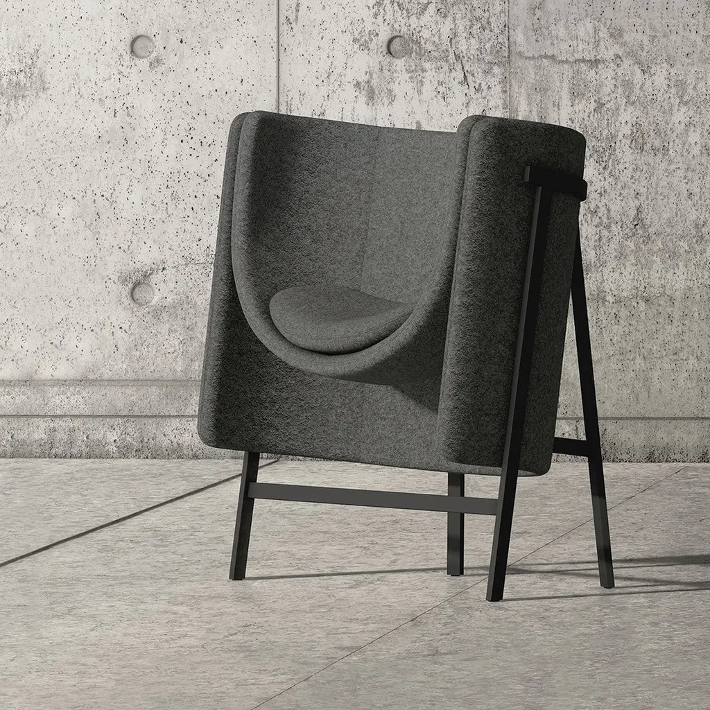 An armchair designed for common spaces in offices and hotels. There are numerous armchairs and sofas for lobbies and lounges, but those for narrow spaces such as corridors, elevator lobbies, and entrances are difficult to find. Therefore, a compact chair was devised to fit in those niches, for passersby to rest in for a spell or in which to have casual conversation. Attempts to make an armchair small normally leads one to think of gradual elimination of the backrest to create a bench-like furniture piece. But casting the backrest as the star to which the seat is adjoined yields a design less about sitting and more about leaning against a grand backrest. Such a design takes up minimal space while offering to the chair's occupant a bit of calm and security. The backrest and seat are independent parts, with shallow and deep seats and lower and taller backs available for use in combination according to the size of the space and degree of privacy desired.