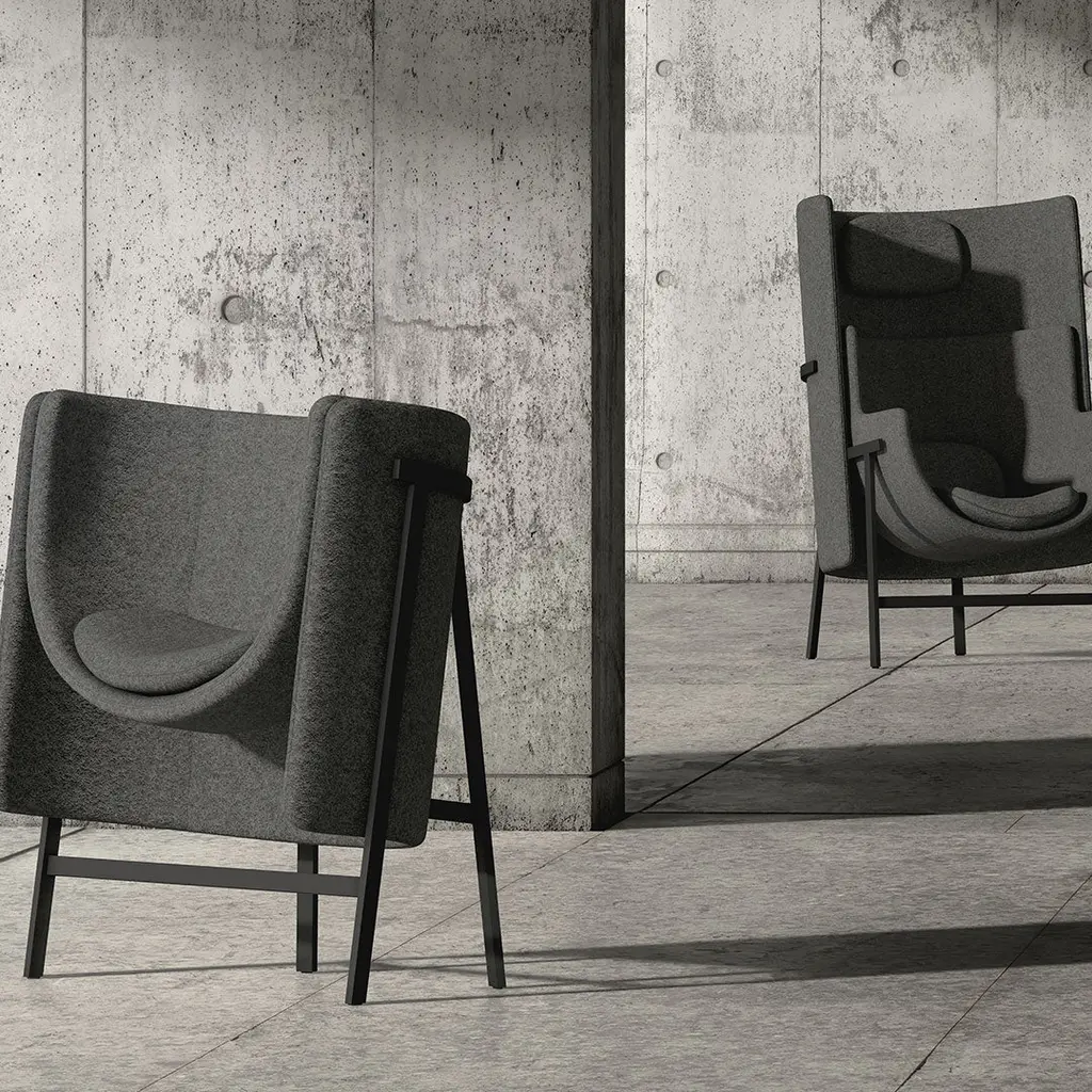 An armchair designed for common spaces in offices and hotels. There are numerous armchairs and sofas for lobbies and lounges, but those for narrow spaces such as corridors, elevator lobbies, and entrances are difficult to find. Therefore, a compact chair was devised to fit in those niches, for passersby to rest in for a spell or in which to have casual conversation. Attempts to make an armchair small normally leads one to think of gradual elimination of the backrest to create a bench-like furniture piece. But casting the backrest as the star to which the seat is adjoined yields a design less about sitting and more about leaning against a grand backrest. Such a design takes up minimal space while offering to the chair's occupant a bit of calm and security. The backrest and seat are independent parts, with shallow and deep seats and lower and taller backs available for use in combination according to the size of the space and degree of privacy desired.