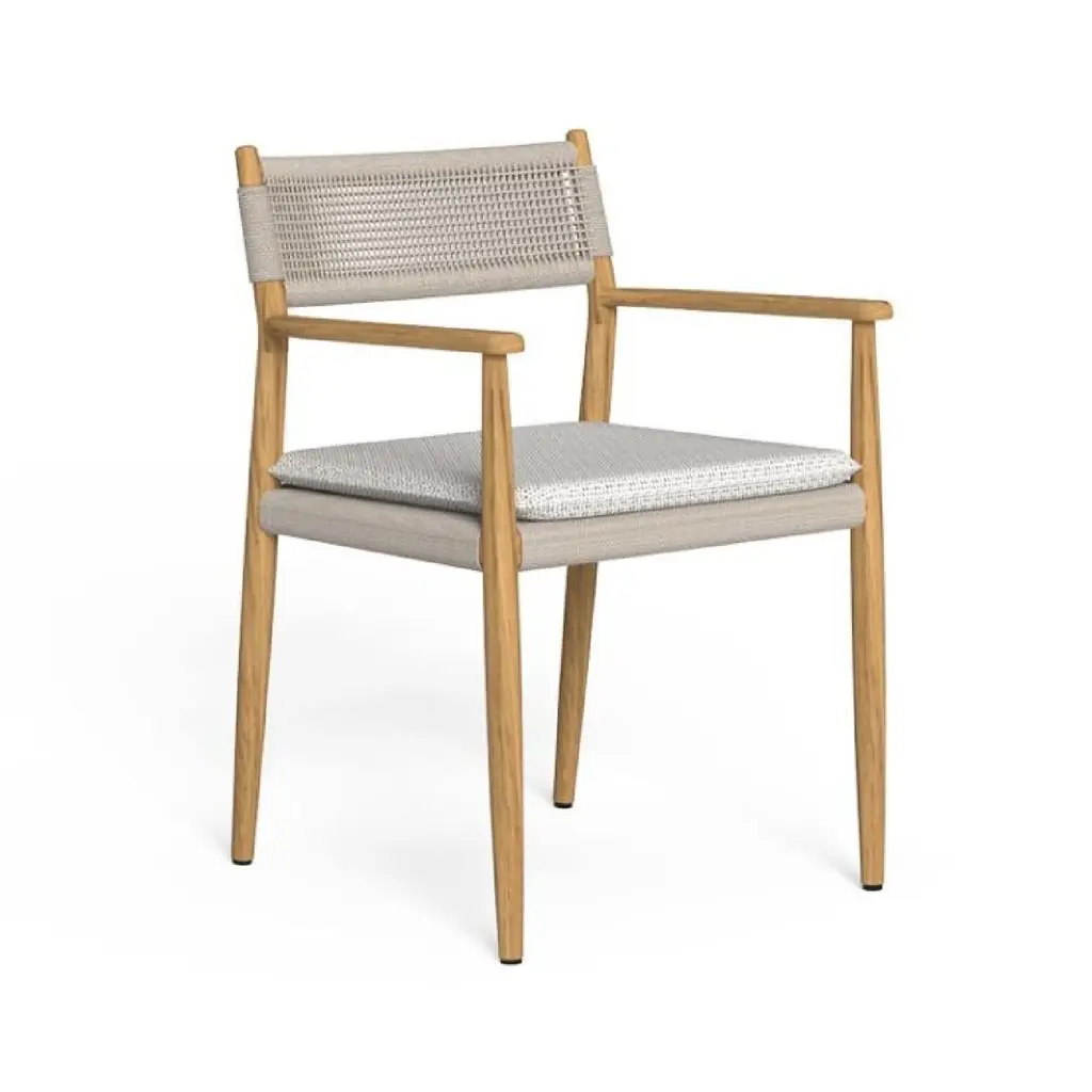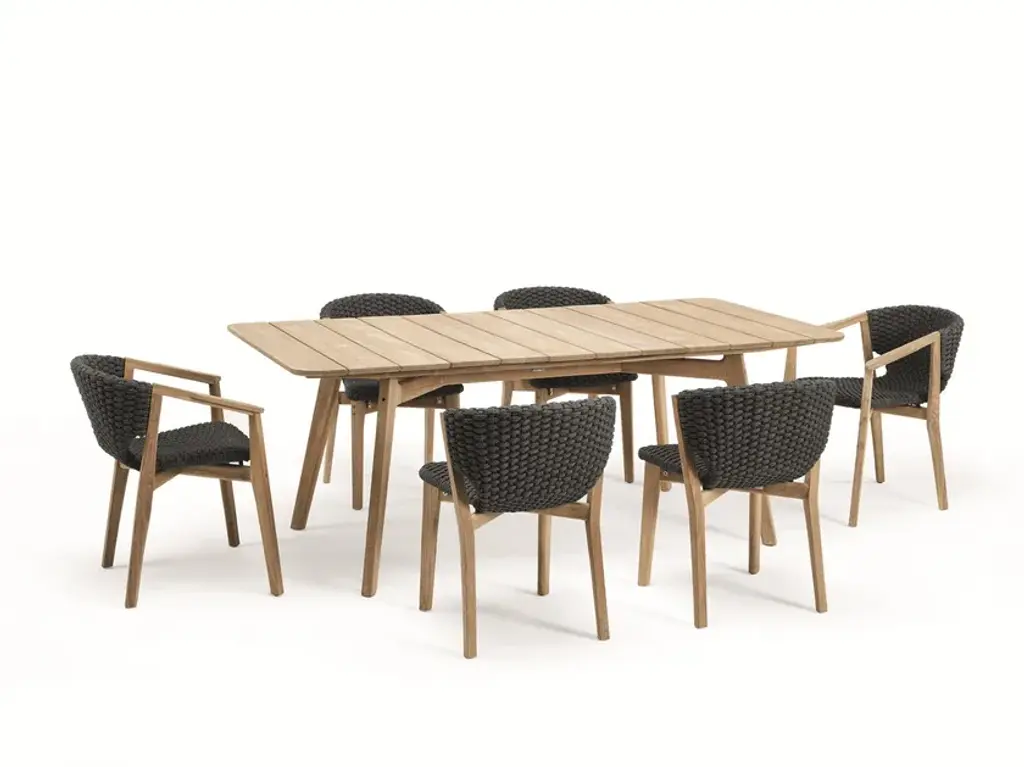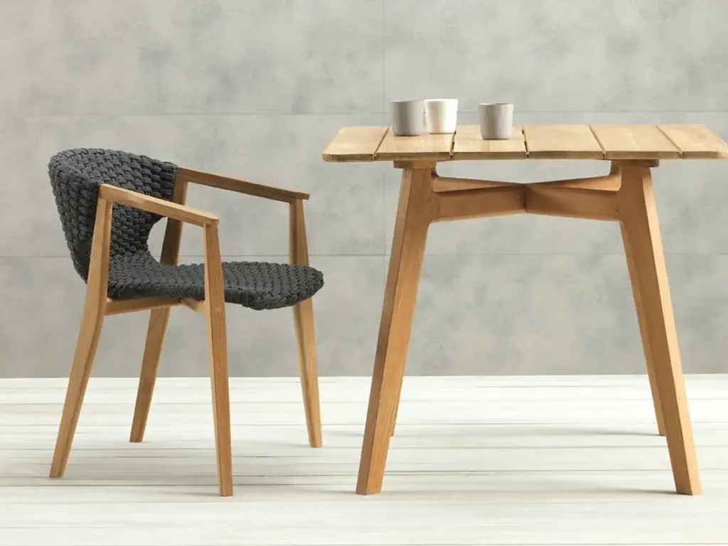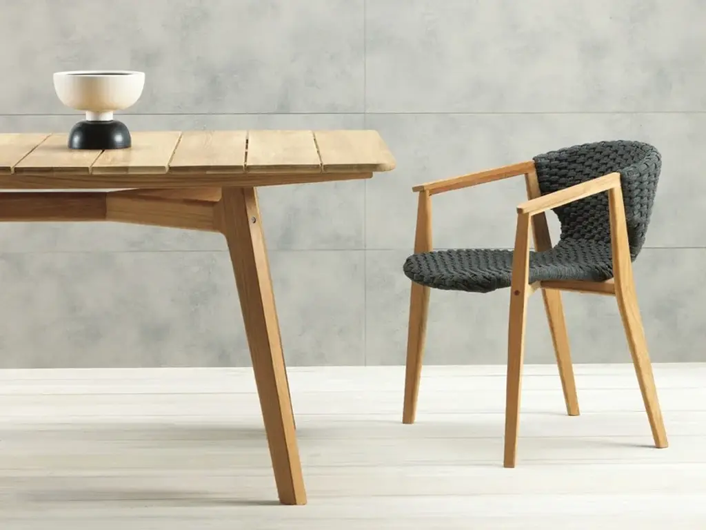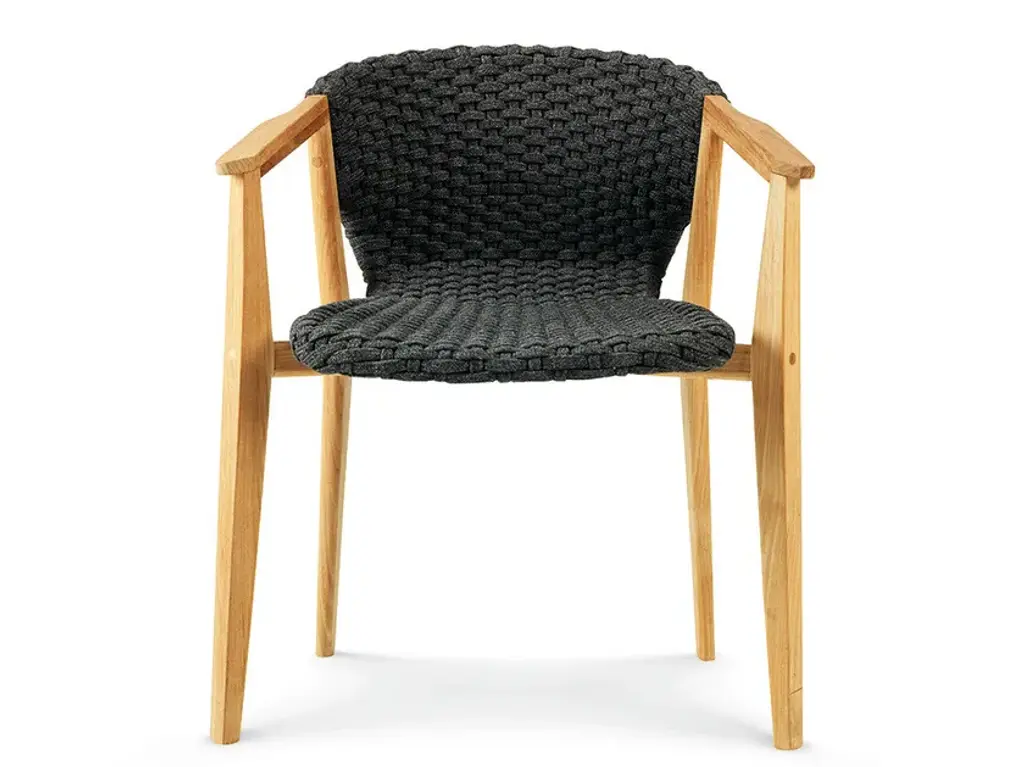 Knit is a chair with frame in teak and upholstery in Comfortable flat rope.Knit is a complete line of tables, chairs and lounge chairs in teak and woven rope that expresses with refinement a perfect synthesis of aesthetics, functionality and ergonomics. The iconic collection is enriched by the new version in pickled teak and light gray rope and the rocking version of the lounge chair with high back, thus offering a new and special interpretation of the classic bergère.