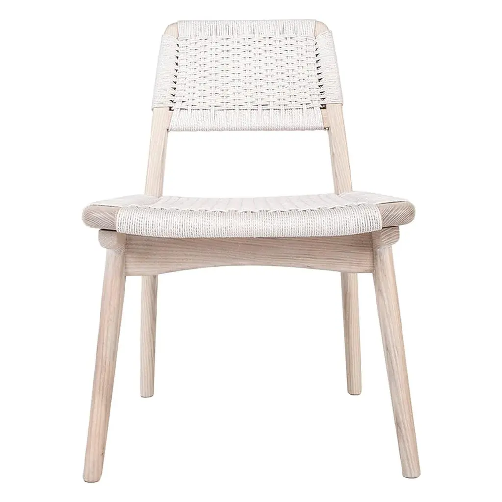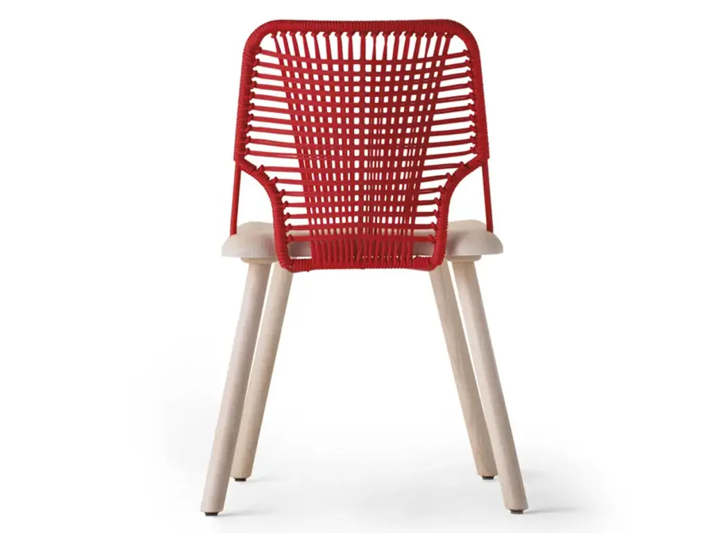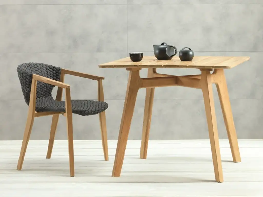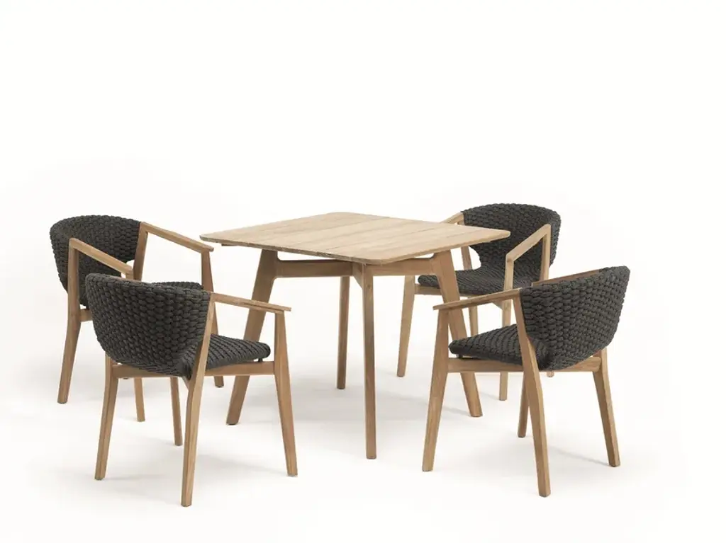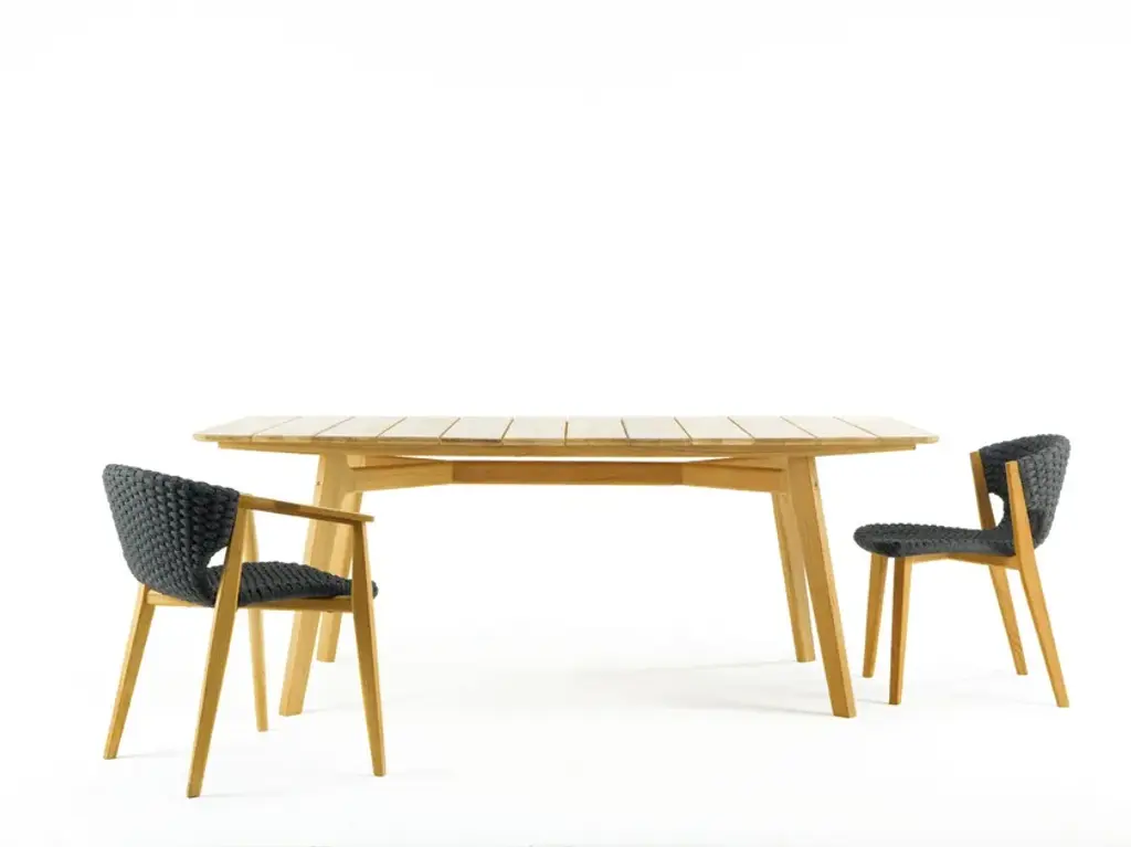 Knit is a chair with frame in teak and upholstery in Comfortable flat rope.Knit is a complete line of tables, chairs and lounge chairs in teak and woven rope that expresses with refinement a perfect synthesis of aesthetics, functionality and ergonomics. The iconic collection is enriched by the new version in pickled teak and light gray rope and the rocking version of the lounge chair with high back, thus offering a new and special interpretation of the classic bergère.