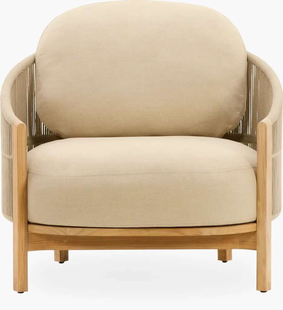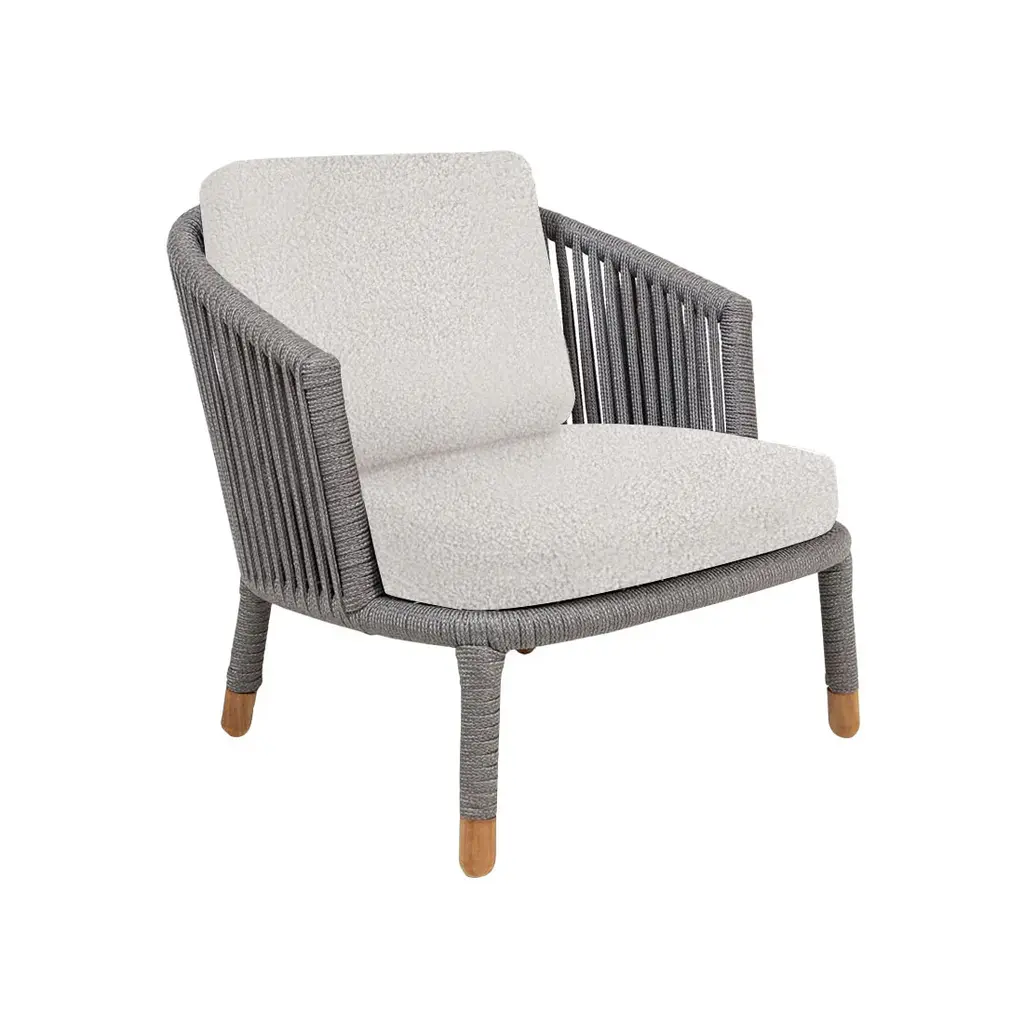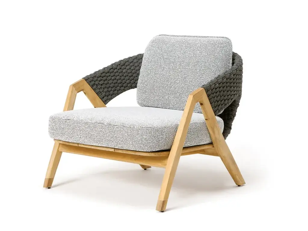 Knit is an armchair in teak and weaved rope.Knit is a complete line of tables, chairs and lounge chairs in teak and woven rope that expresses with refinement a perfect synthesis of aesthetics, functionality and ergonomics. The iconic collection is enriched by the new version in pickled teak and light gray rope and the rocking version of the lounge chair with high back, thus offering a new and special interpretation of the classic bergère.