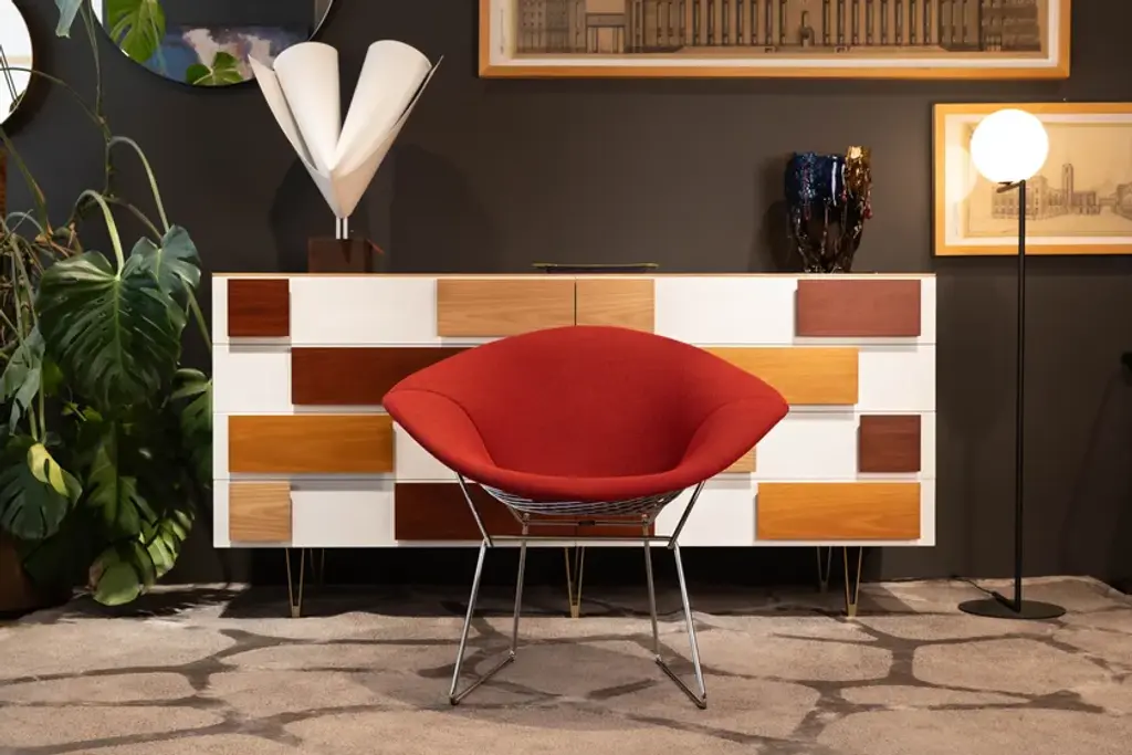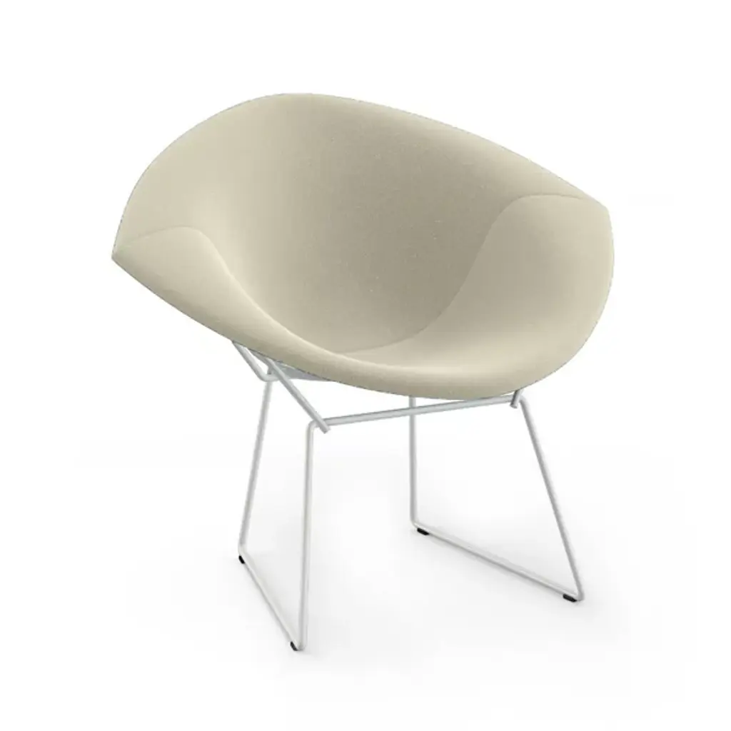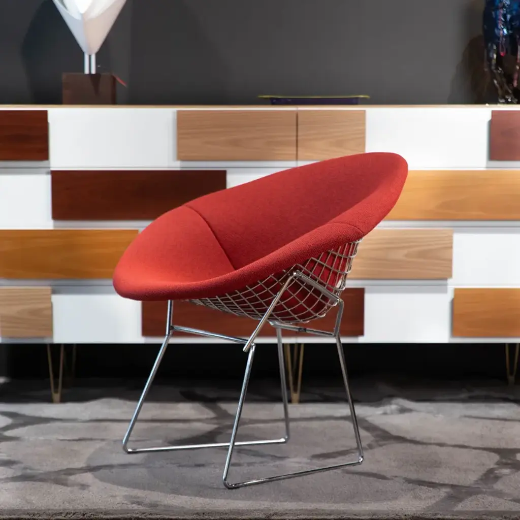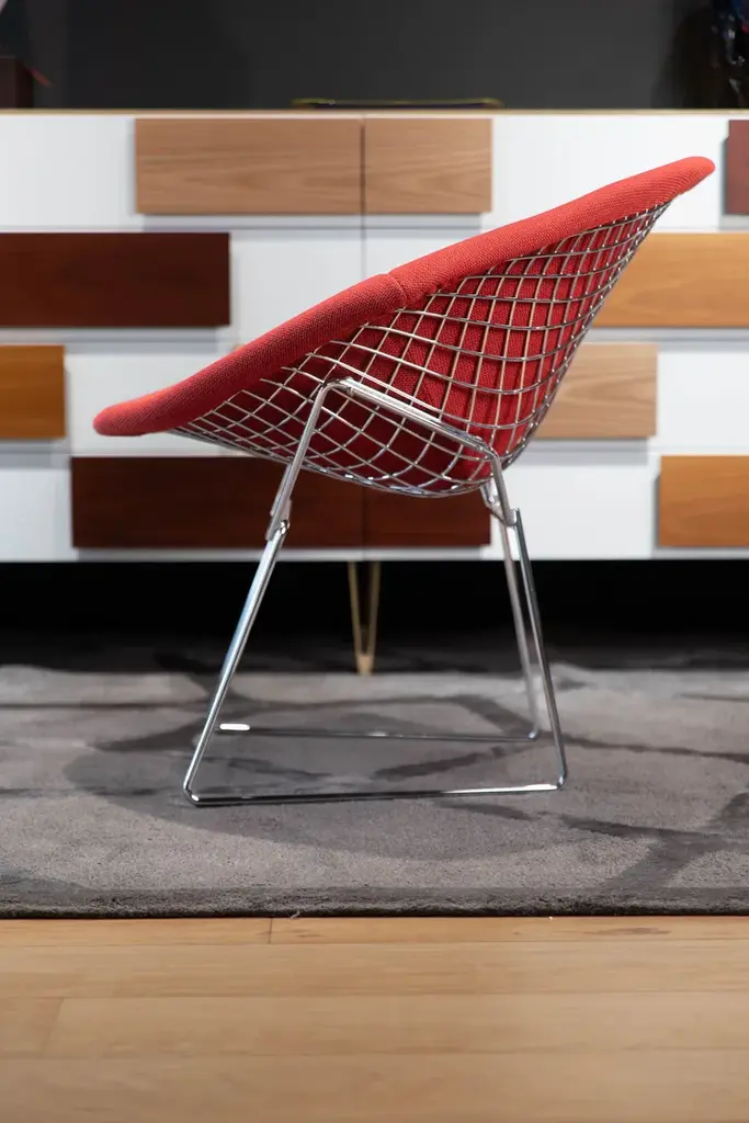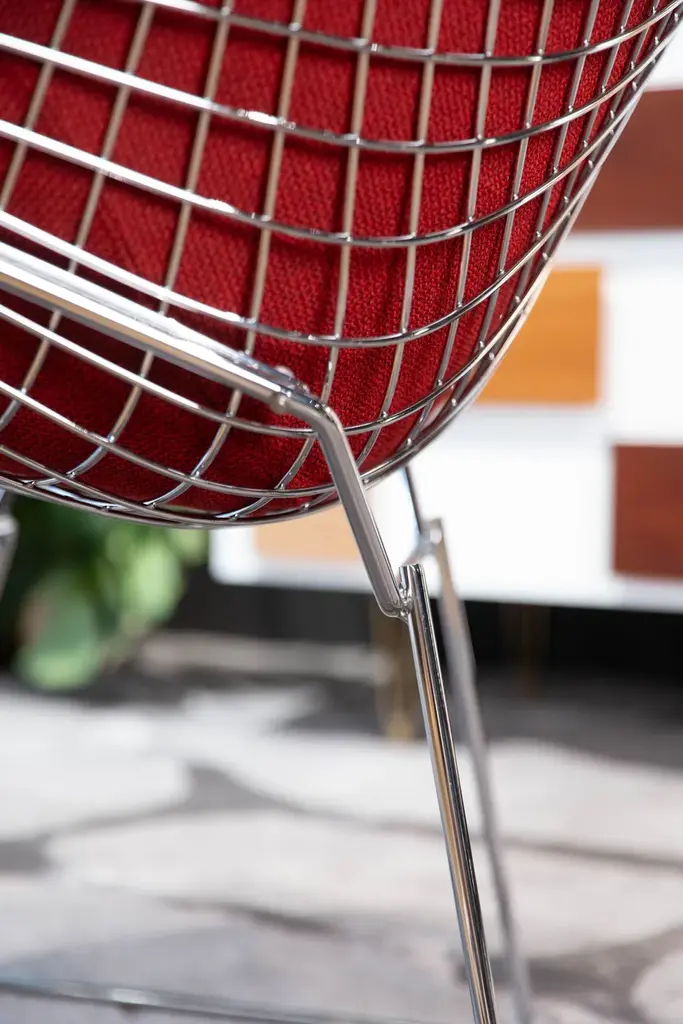 The graceful Diamond Chair is an astounding study in space, form and function by one of the master sculptors of the last century. Like Saarinen and Mies, Bertoia found sublime grace in an industrial material, elevating it beyond its normal utility into a work of art.FEATURESA classic, modern design that enhances any environment, sculptor Harry Bertoia's Diamond Lounge chair remains a fascinating study in bent metal and a fixture of mid-century design.CONSTRUCTIONThe frame is a welded steel construction with rods in chrome or bonded rilsan.Full covers are stretched over the wire seat basket and attach to the seat basket with hooks.Seat cushions secure to the chair with lock-snaps. The unupholstered small Diamond chairs in Rilsan are also appropriate for outdoor environment.Finishing: ChromeUpholstery: Fabric | Knoll West (Cotton 38%, Acrylic 24%, Viscose 18%, Wool 12%, Nylon 2%) 18WE Red