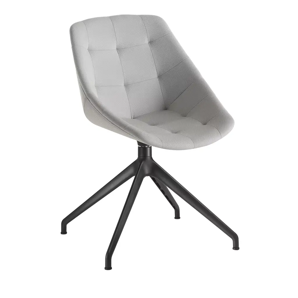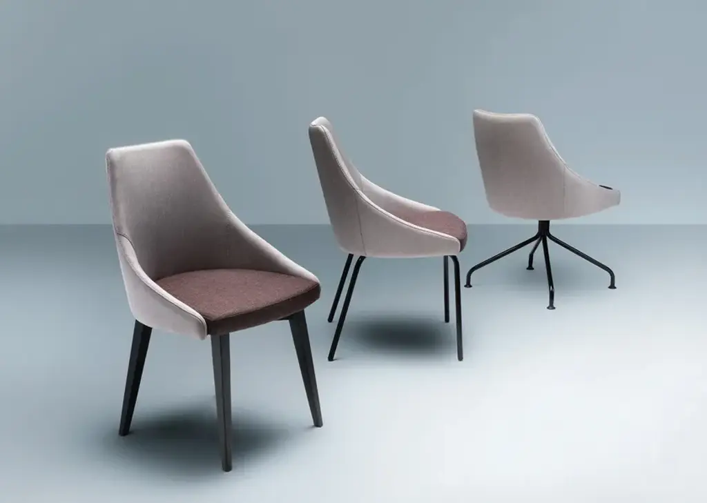 The classical inspiration that characterises Kontea is conveyed in an elegant “evergreen” seat. The comfortable padded, cold foam back contains the seat that is also padded, with which it forms a pairing that can also be two-tone. Various types of covering and support solutions make it suitable for a variety of furnishing options. Padded seat and back, steel frame in the 4 legs version, central swivel base, 4 castors; cast aluminium swivel base with 4 castors and height-adjustable column; wood with 4 polished aluminium legs frame. / Use: indoors.