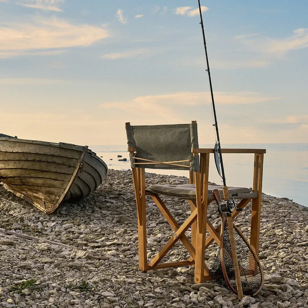 Originally designed for the Swedish Embassy in Chairo in 1974 but it will work just as neatly on non-diplomatic grounds. Foldable and hence easy to stove away. All details are worked-through with care and attention. All teak is A-grade teak from controlled plantations (with a possibility to FSC certify the teak). Sunbrella or canvas fabric. A chair in teak and fabric fitted to the backrest with leather. Matching cushions are is included. The Kryss table is also in teak. Originally designed for a roof terrace on the Swedish Embassy in Cairo in 1975. The canvas fabric edition is for indoor use only.