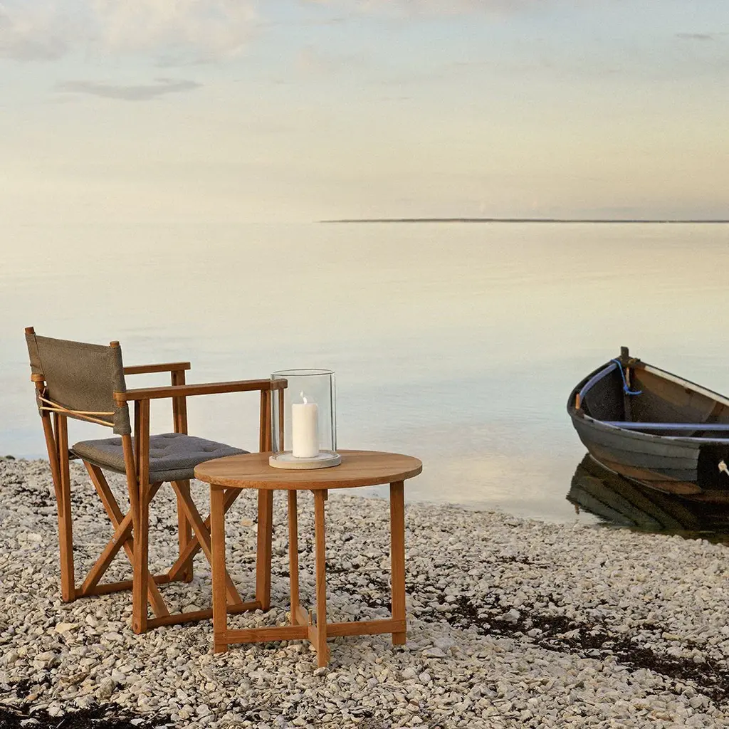Originally designed for the Swedish Embassy in Chairo in 1974 but it will work just as neatly on non-diplomatic grounds. Foldable and hence easy to stove away. All details are worked-through with care and attention. All teak is A-grade teak from controlled plantations (with a possibility to FSC certify the teak). Sunbrella or canvas fabric. A chair in teak and fabric fitted to the backrest with leather. Matching cushions are is included. The Kryss table is also in teak. Originally designed for a roof terrace on the Swedish Embassy in Cairo in 1975. The canvas fabric edition is for indoor use only.