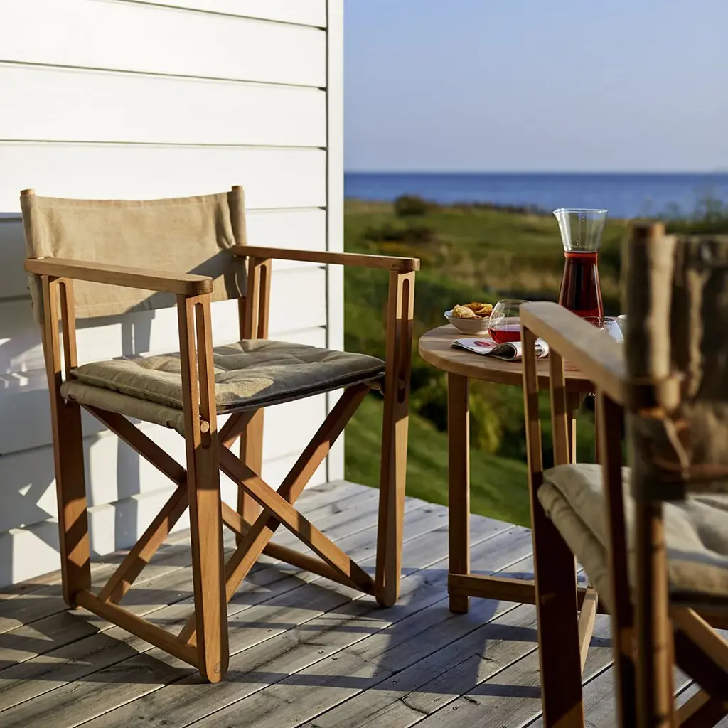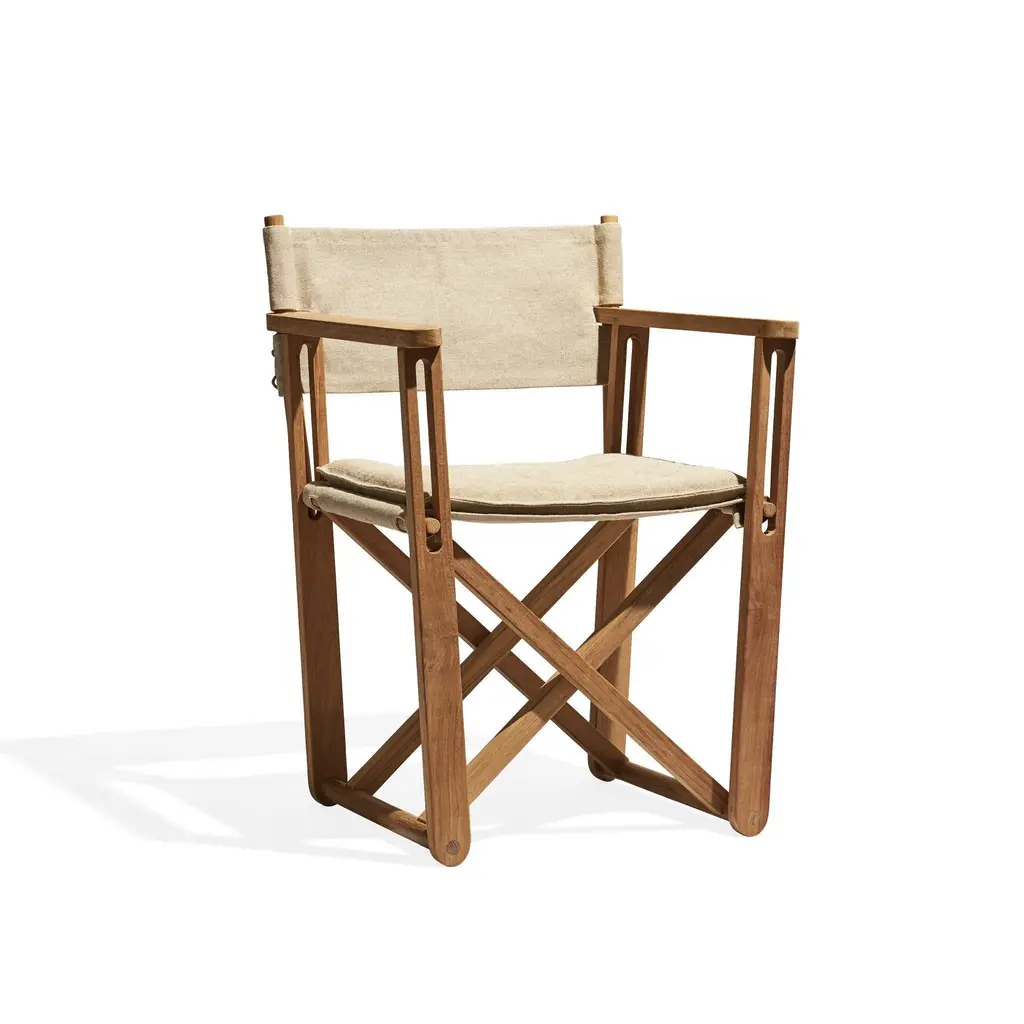 Originally designed for the Swedish Embassy in Chairo in 1974 but it will work just as neatly on non-diplomatic grounds. Foldable and hence easy to stove away. All details are worked-through with care and attention. All teak is A-grade teak from controlled plantations (with a possibility to FSC certify the teak). Sunbrella or canvas fabric. A chair in teak and fabric fitted to the backrest with leather. Matching cushions are is included. The Kryss table is also in teak. Originally designed for a roof terrace on the Swedish Embassy in Cairo in 1975. The canvas fabric edition is for indoor use only.